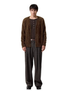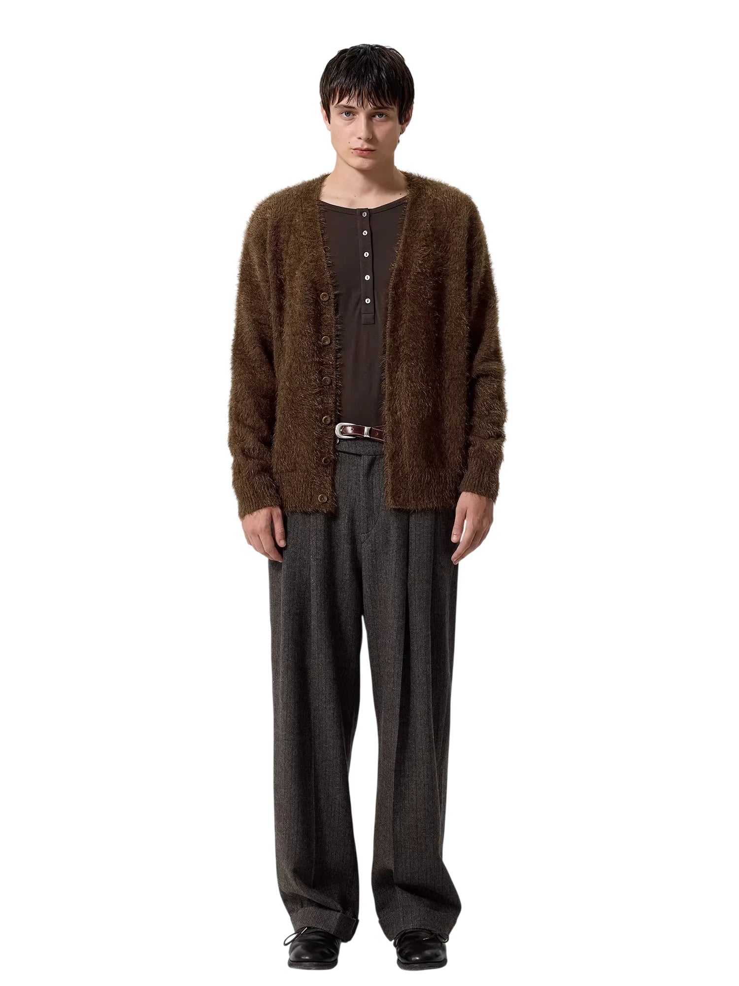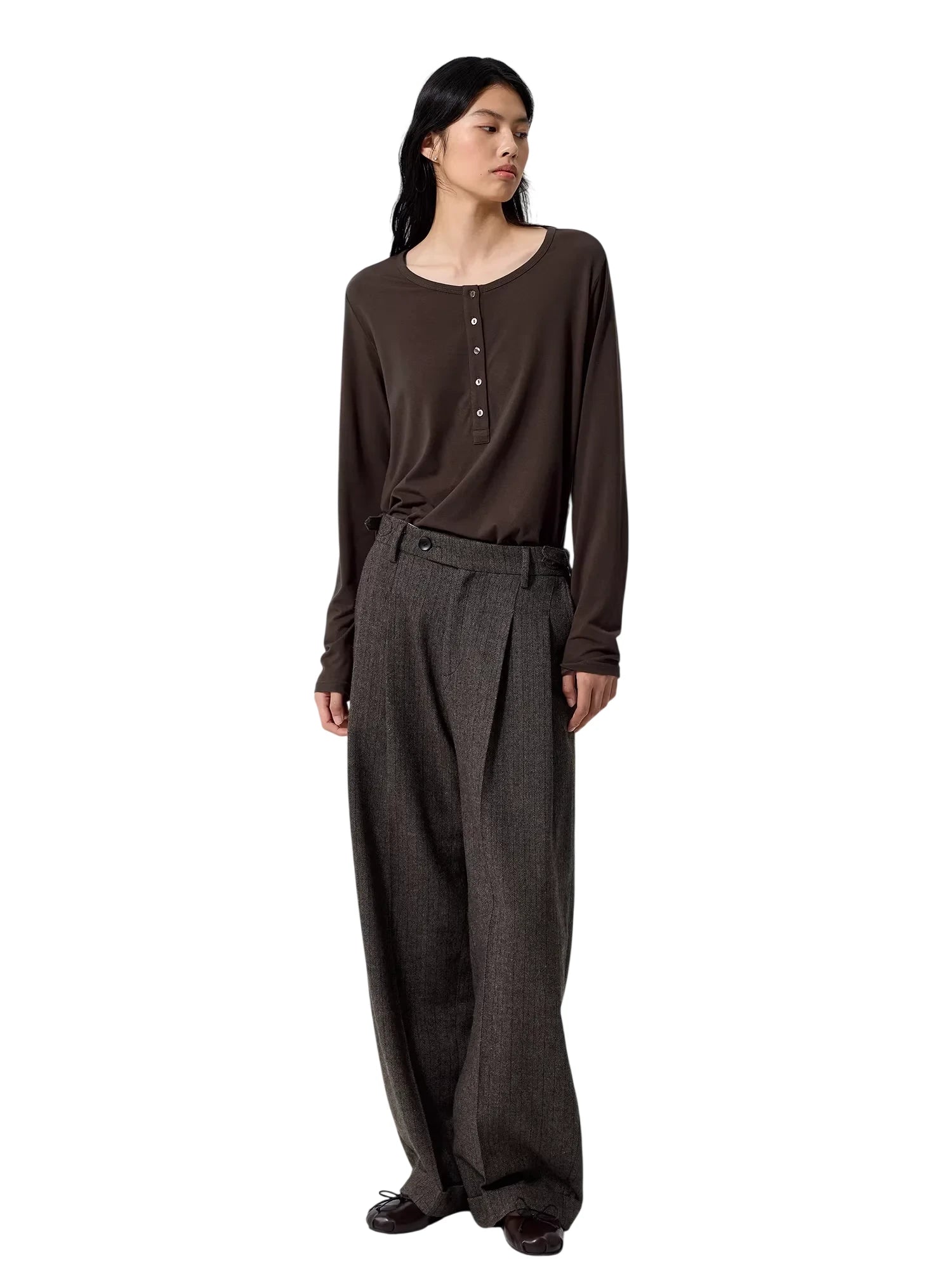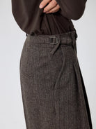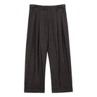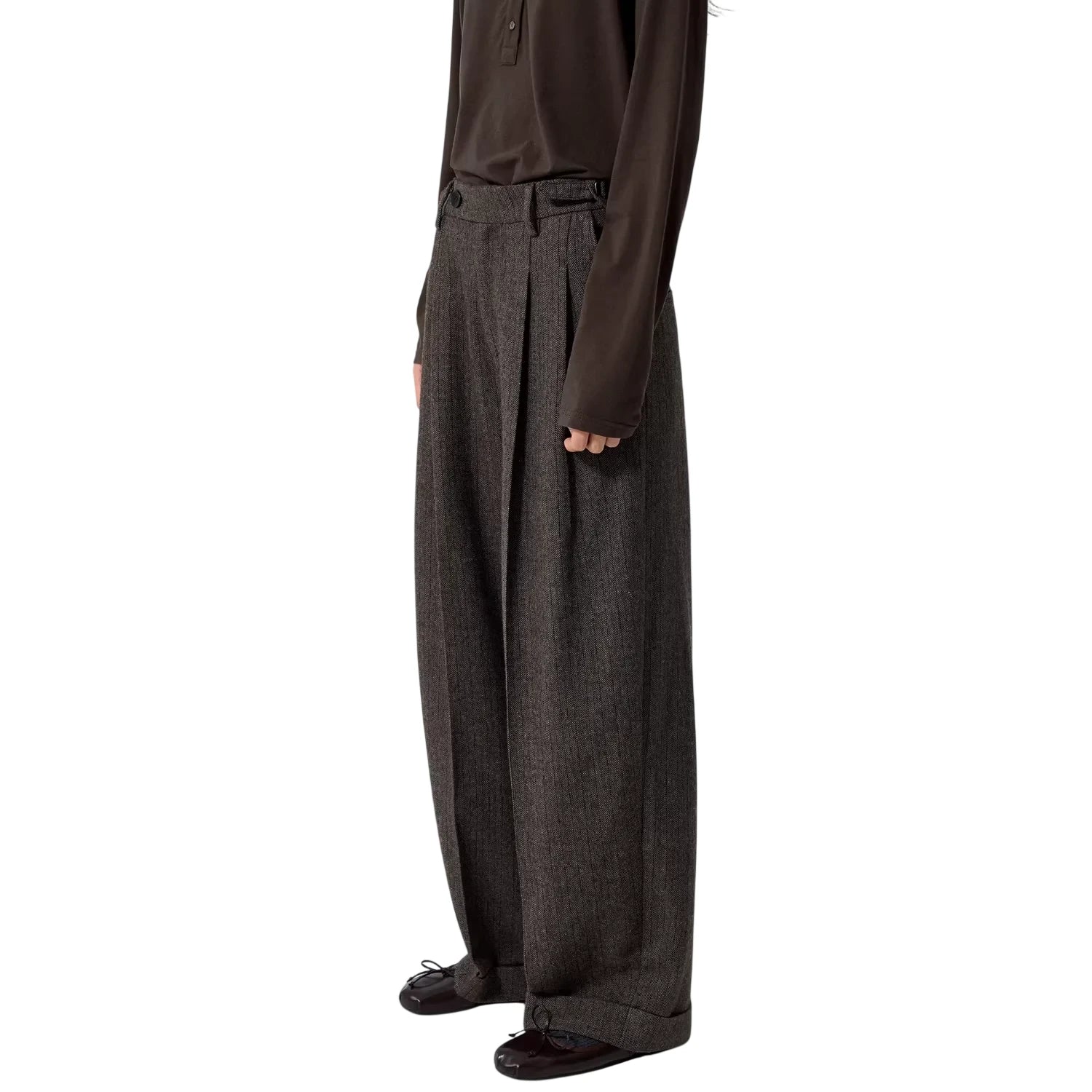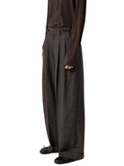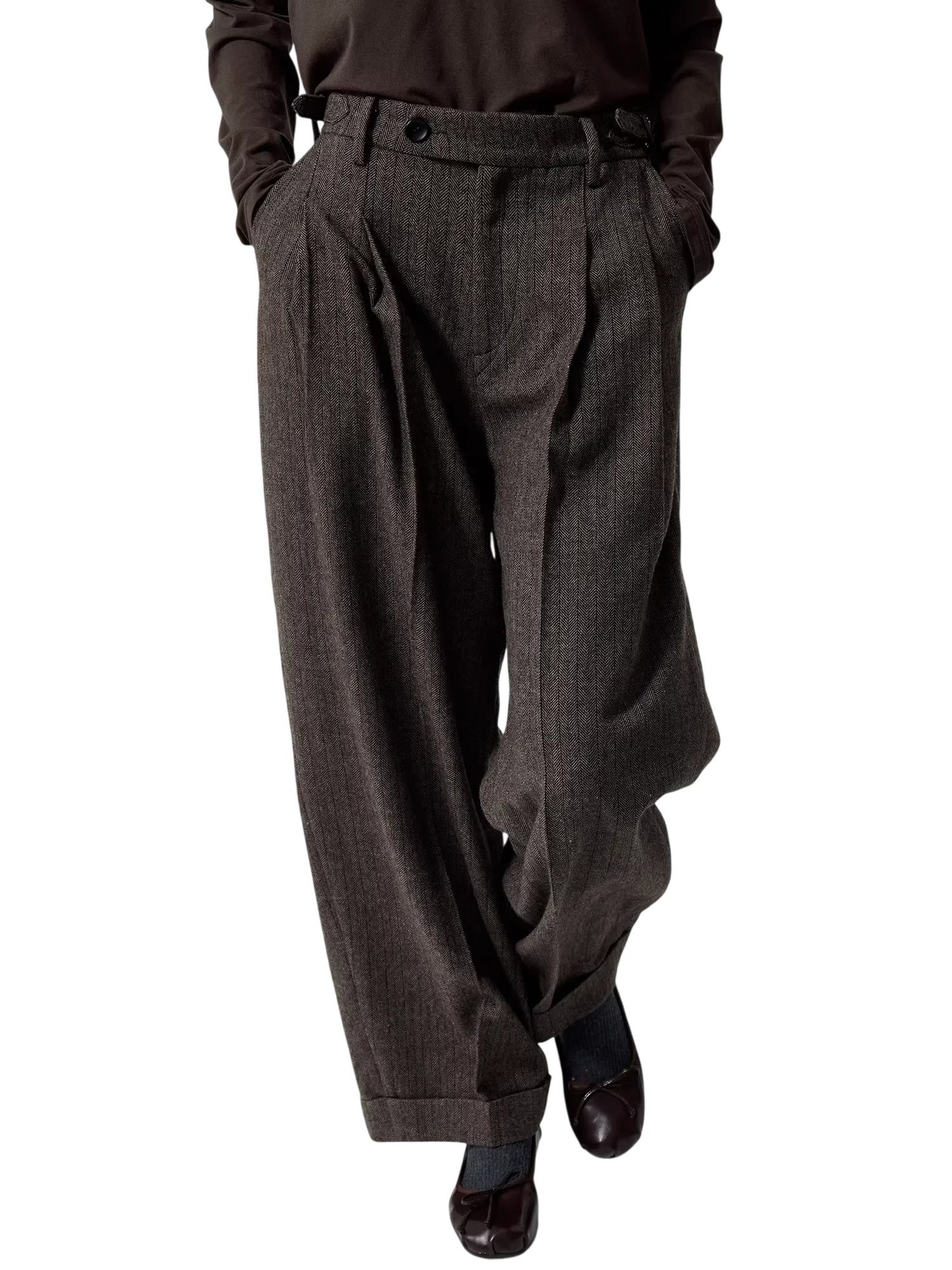 These high-waisted wool trousers for women feature a classic wide-leg silhouette and front pleats for a timeless, tailored look. Crafted from a dark wool blend with a subtle herringbone pattern, they offer warmth and sophistication, ideal for cooler seasons. Designed with belt loops for added versatility, these trousers pair effortlessly with both casual and smart tops for an elevated everyday style.