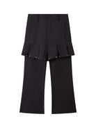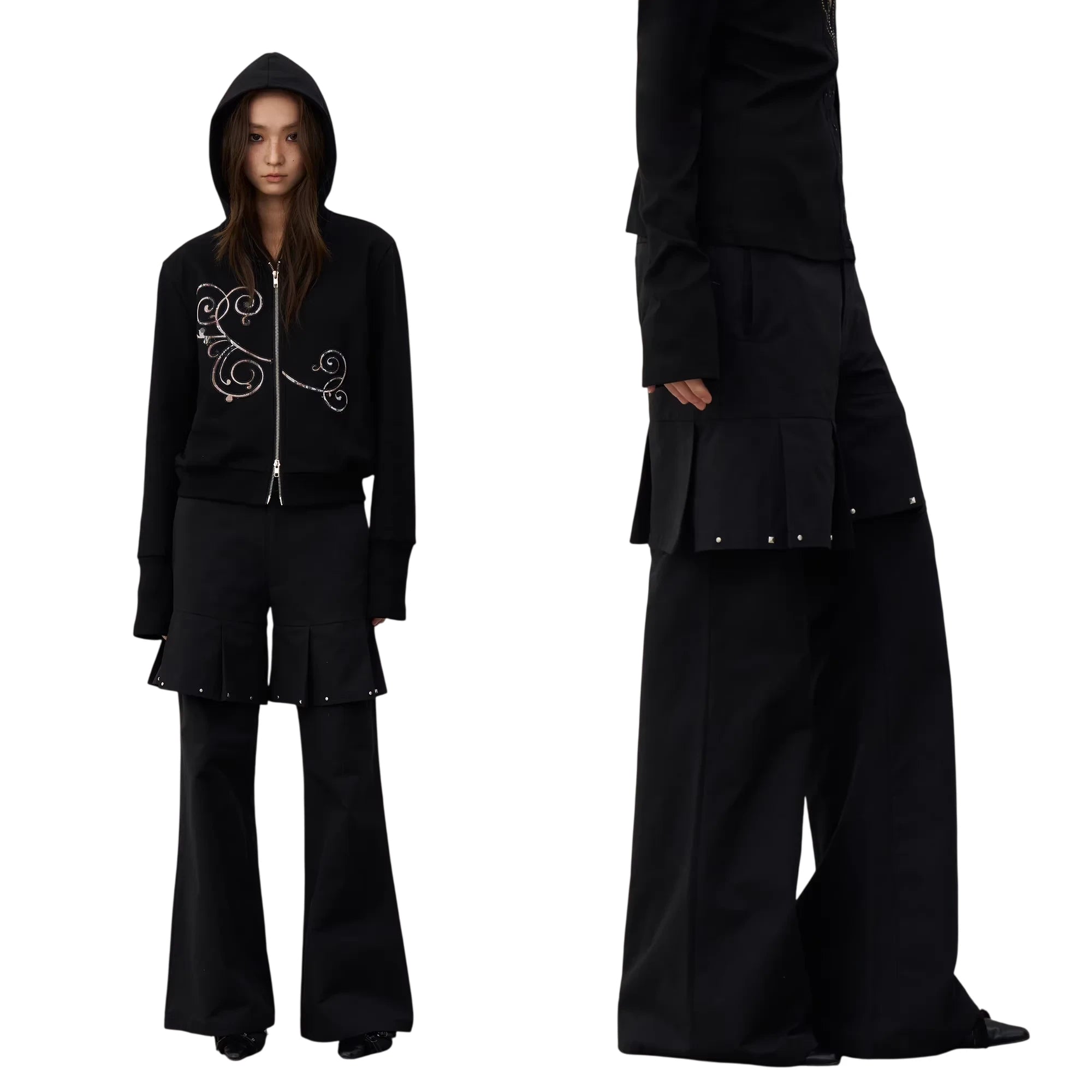 This modern two-piece pant design offers a bold fashion statement for the autumn and winter seasons. Featuring wide-leg black trousers layered with a skirt-style pleated overlay, the look is elevated with beaded rivet detailing for added texture and dimension. Designed with a contemporary silhouette, these pants present an avant-garde touch perfect for stylish statement-making.