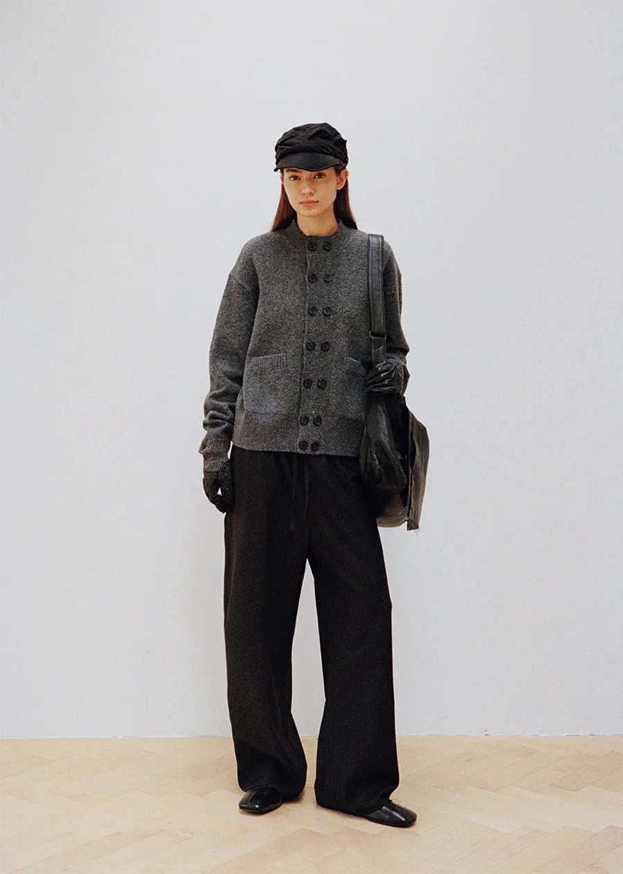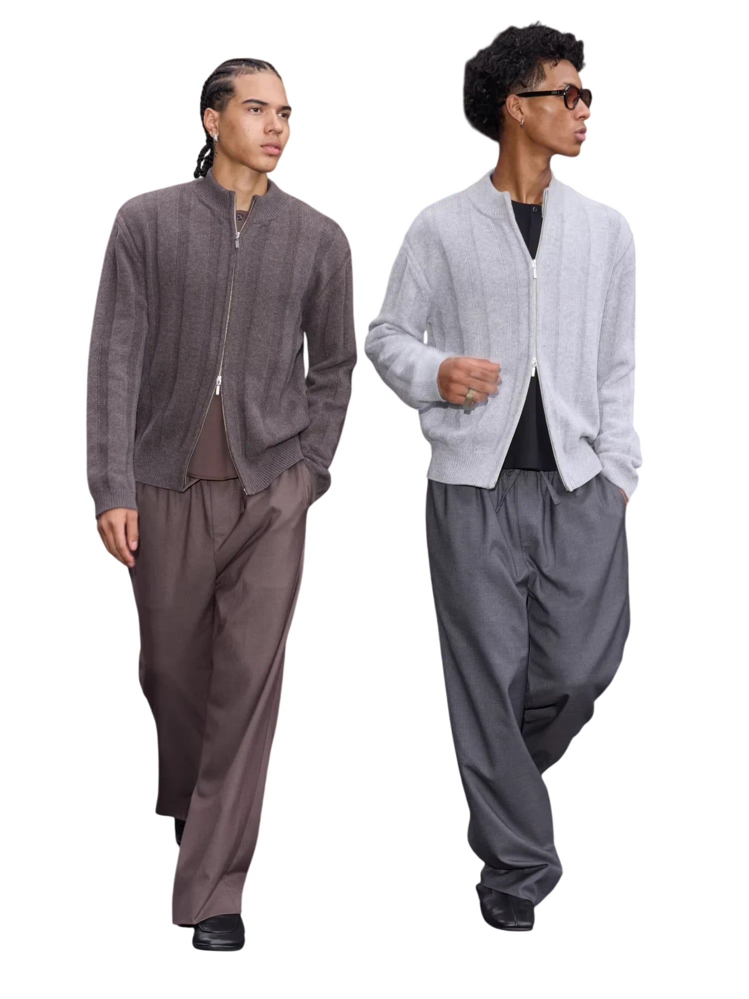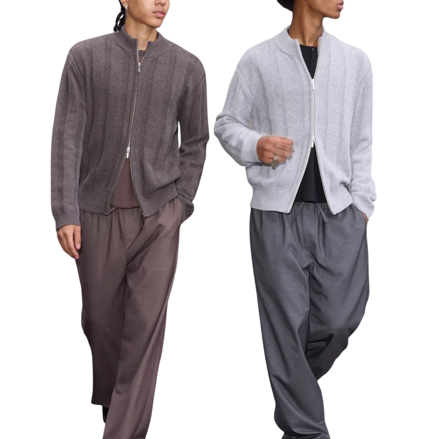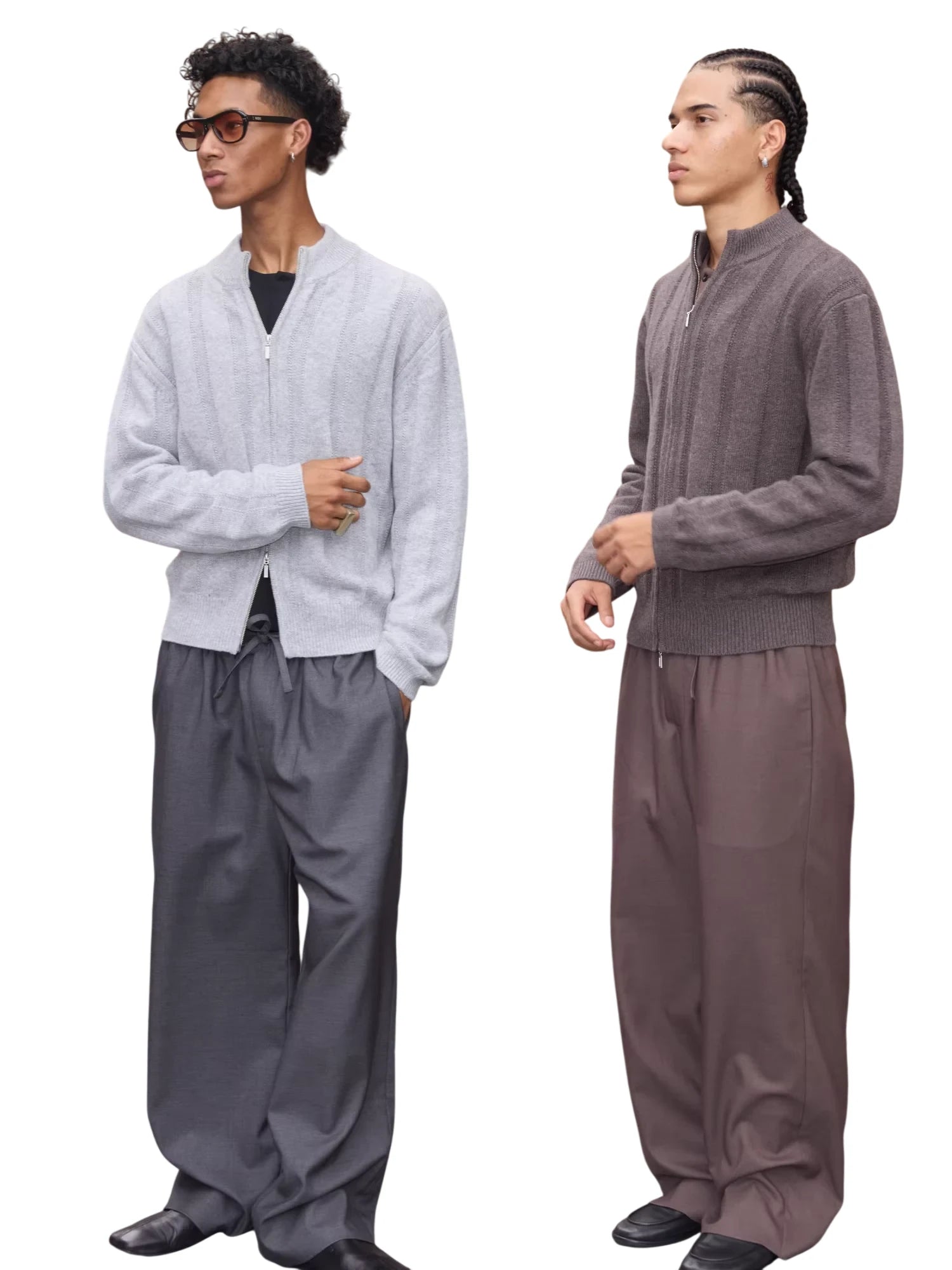 Styled here on male models, these trousers are designed with a versatile silhouette that pairs effortlessly with cardigans or shirts for a polished, street-ready look. Perfect for transitional weather and urban outings, they combine laid-back elegance with timeless tailoring.