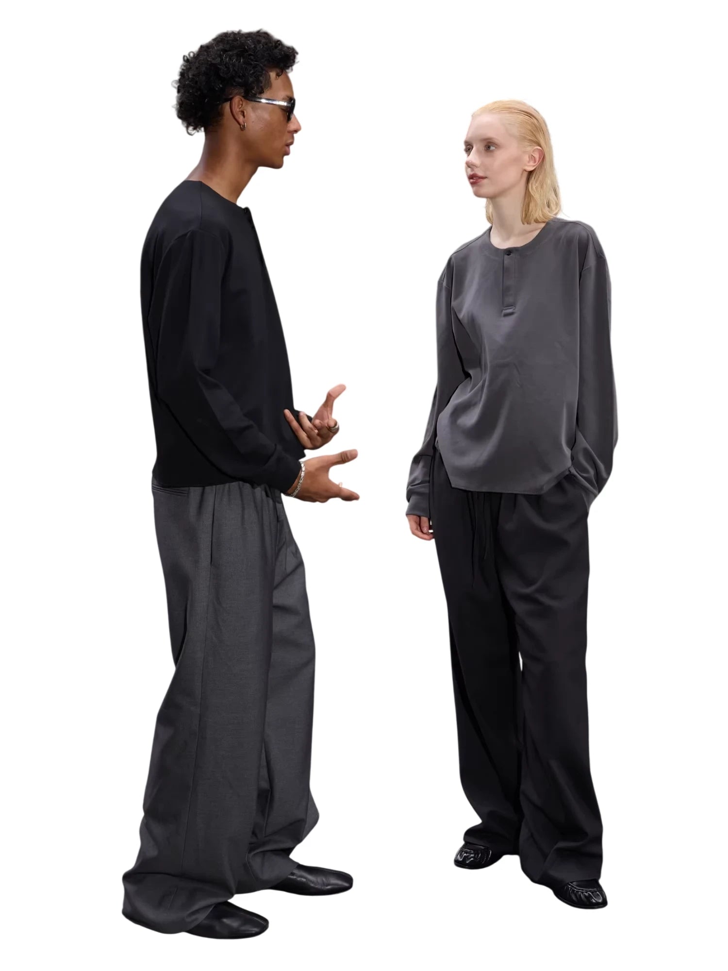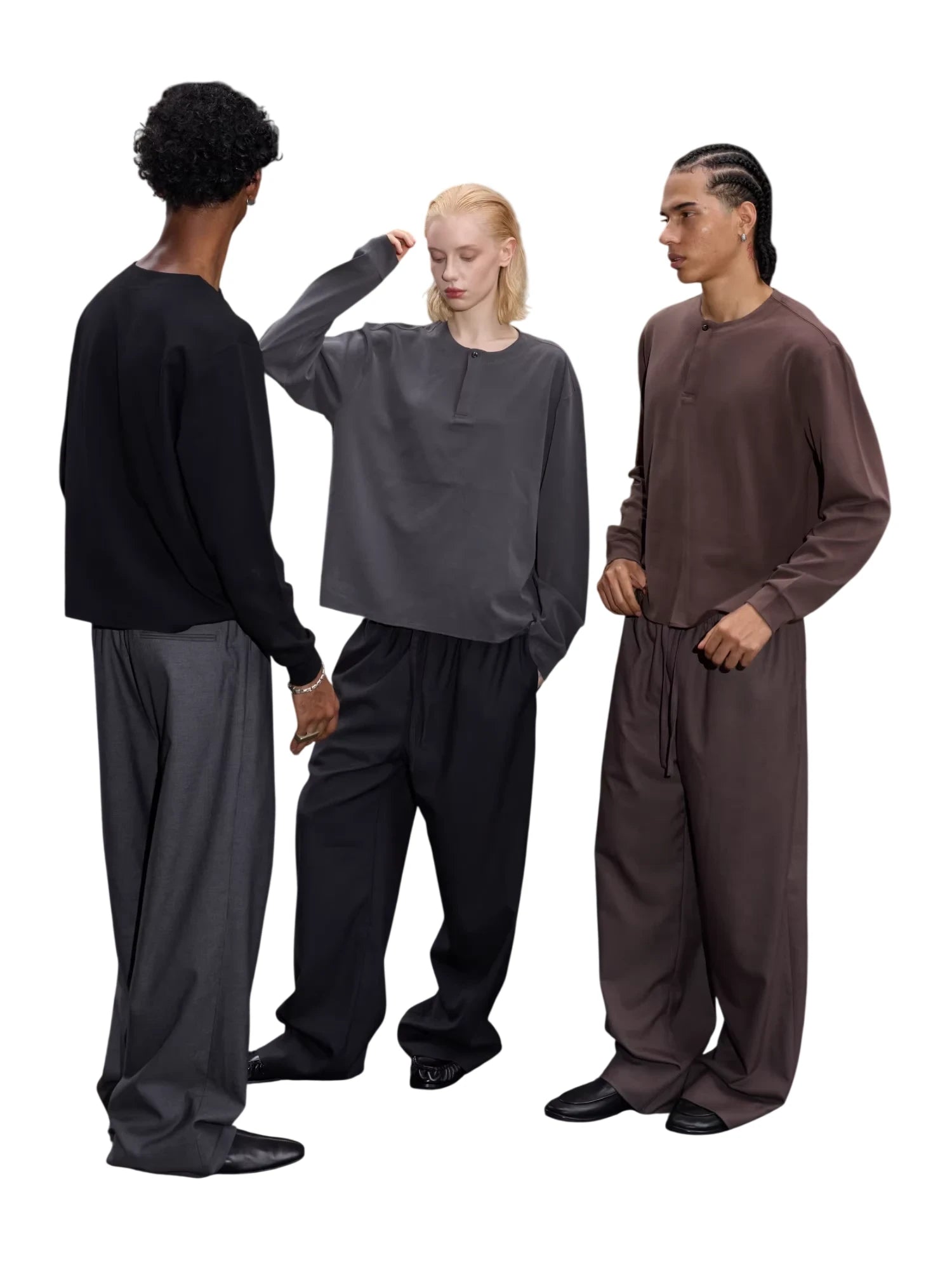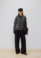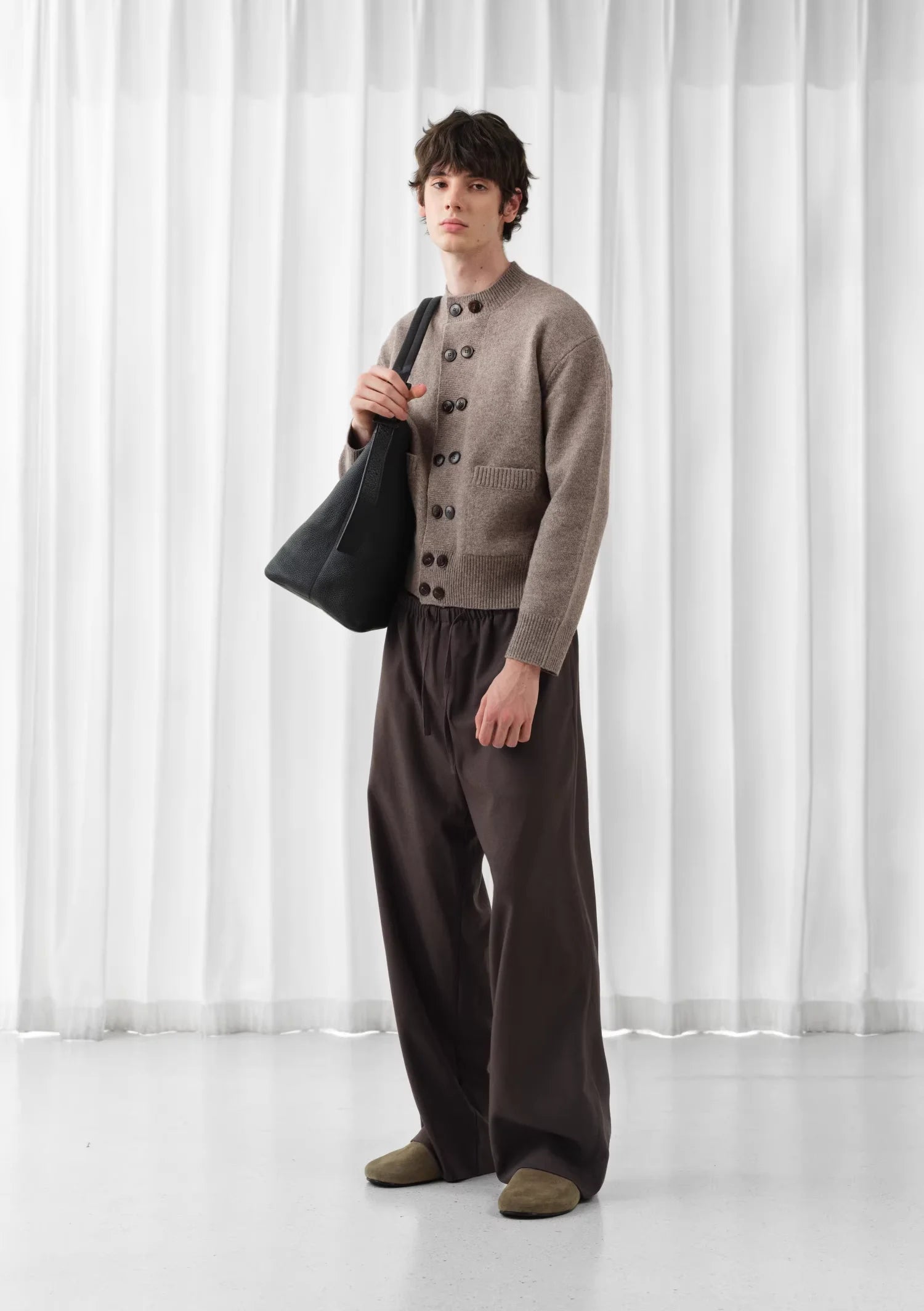 Styled here on male models, these trousers are designed with a versatile silhouette that pairs effortlessly with cardigans or shirts for a polished, street-ready look. Perfect for transitional weather and urban outings, they combine laid-back elegance with timeless tailoring.