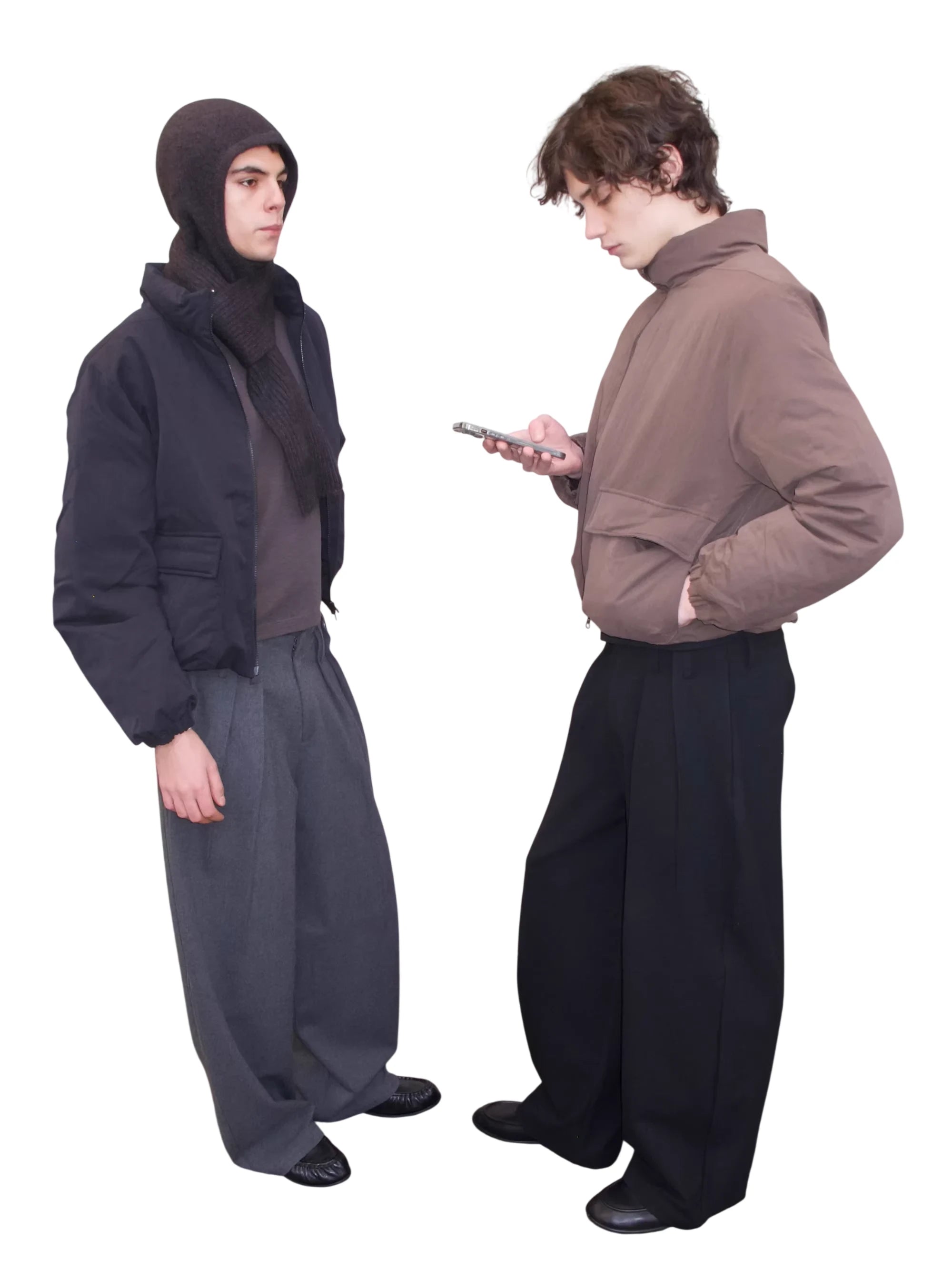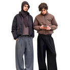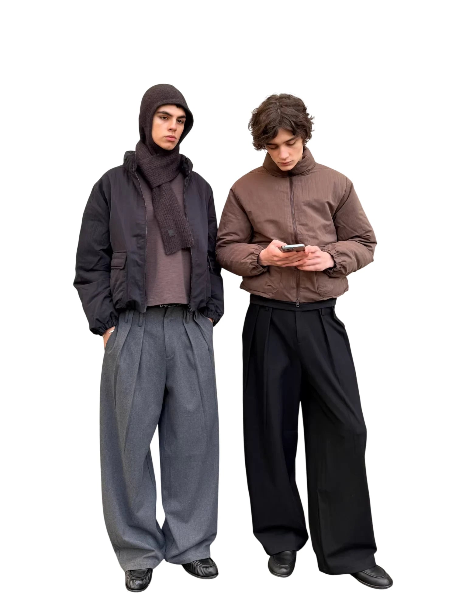 Elevate your winter wardrobe with these vintage-inspired wool-blend trousers, designed for a structured yet relaxed fit. Featuring double front pleats and a contemporary wide-leg silhouette, these trousers showcase a curved drape that enhances movement and style. Ideal for layered, street-ready outfits, they offer a fashion-forward look in versatile earth tones. Suitable for men seeking a blend of comfort and refined tailoring in their everyday wear.