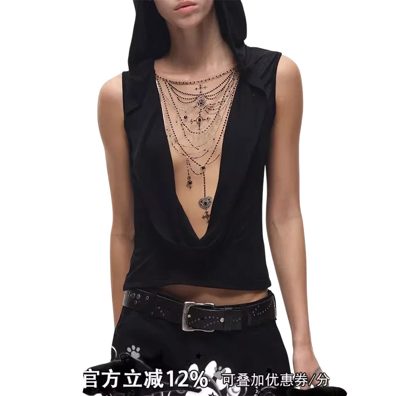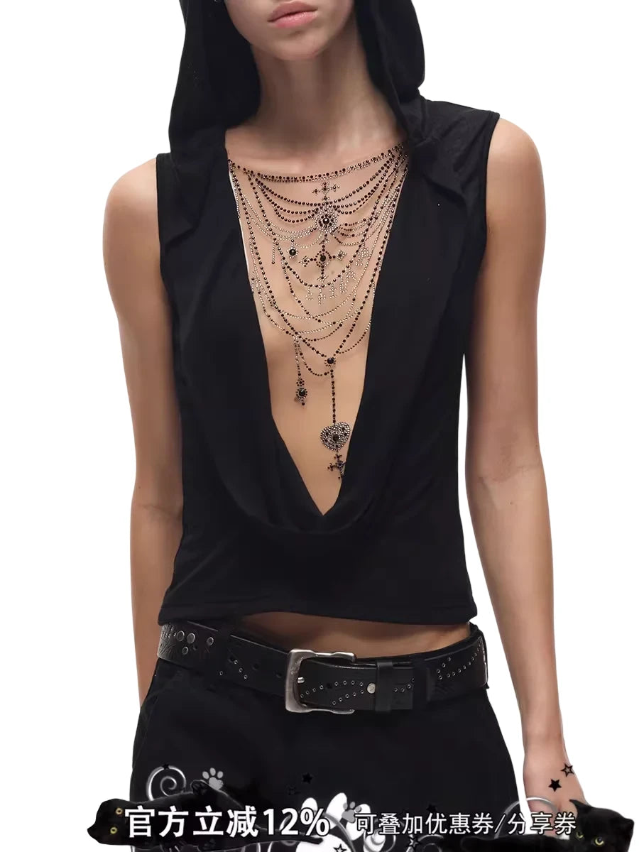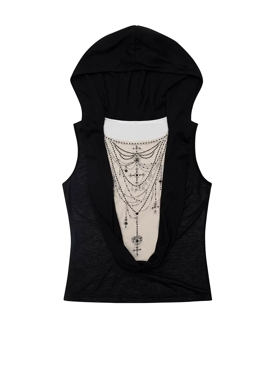 CFIERCE Draped Cowl Neck Vest with Rhinestone Chain
