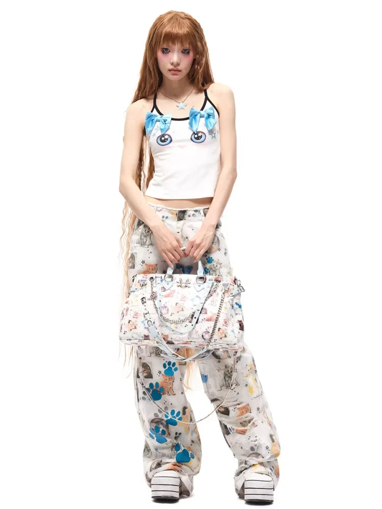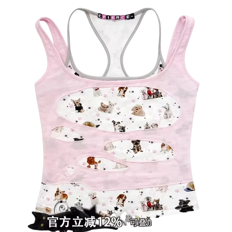 CFIERCE Black Cat Embroidered Heart Print Girls Tank Top