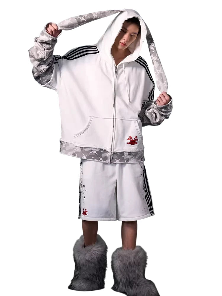 CFIERCE Layered Skull Print Hoodie with Bunny Ear Hood