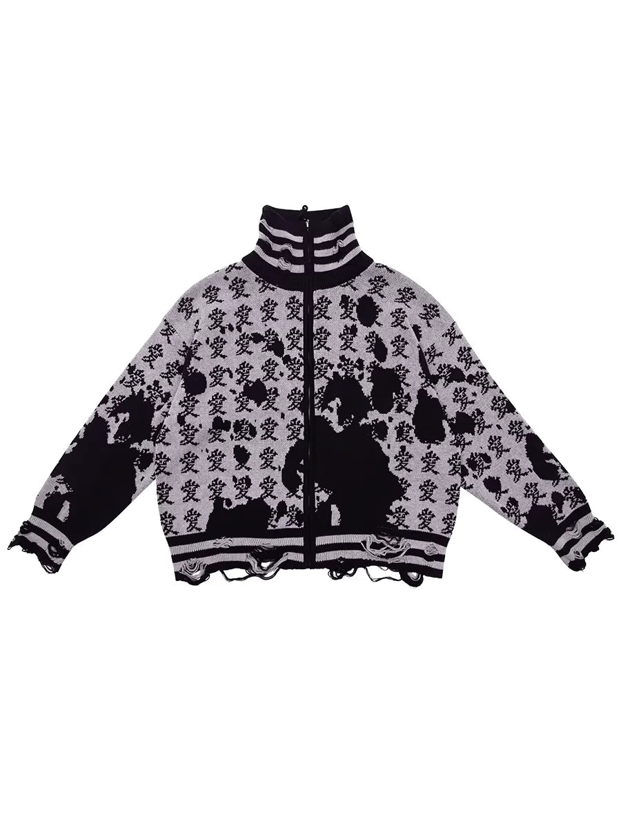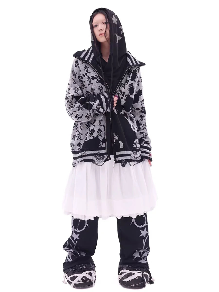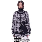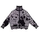 This oversized zip-up knit cardigan commemorates the 25th Anniversary Year of the Snake with a bold and modern design. Featuring a high neck, wide sleeves, and ribbed cuffs and hem, it blends comfort with avant-garde style. The monochrome palette of black and grey is enhanced by abstract patterns and stylized motifs, possibly including a snake silhouette. Designed for women, this sweater offers a dramatic yet sophisticated look.