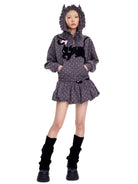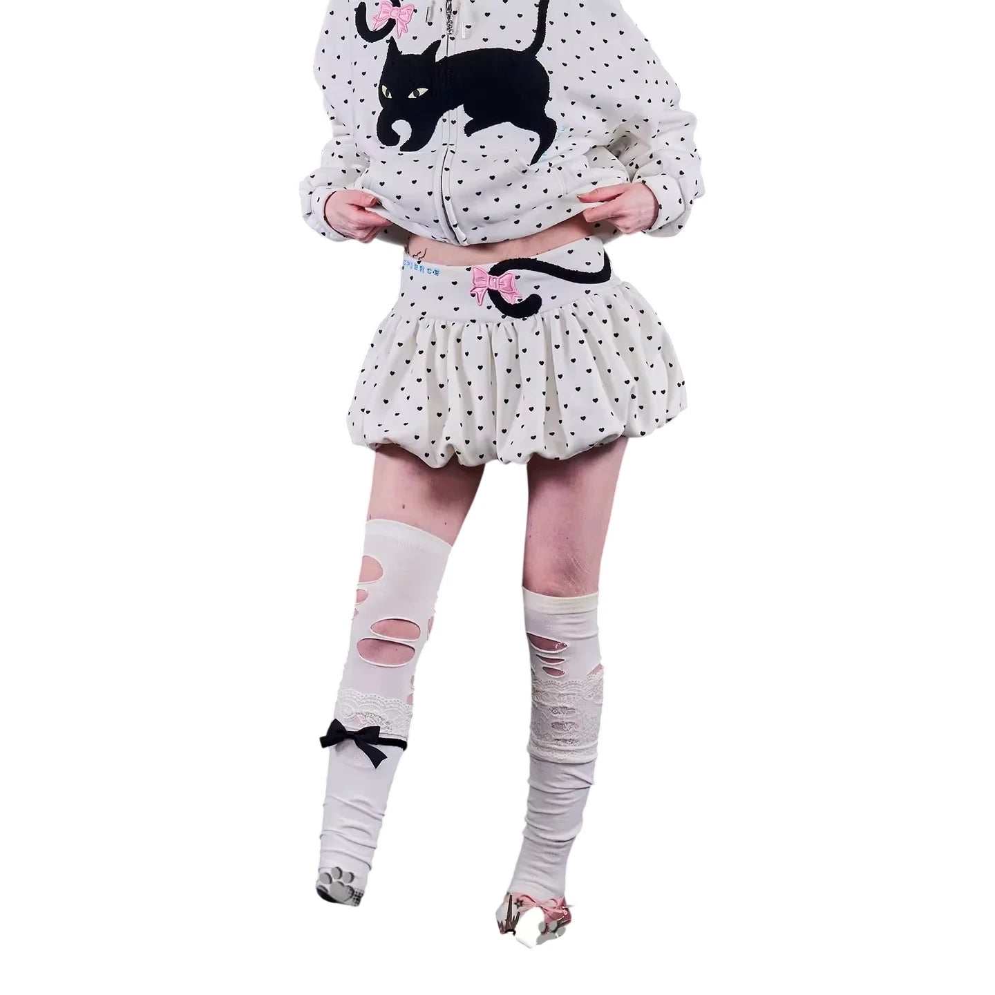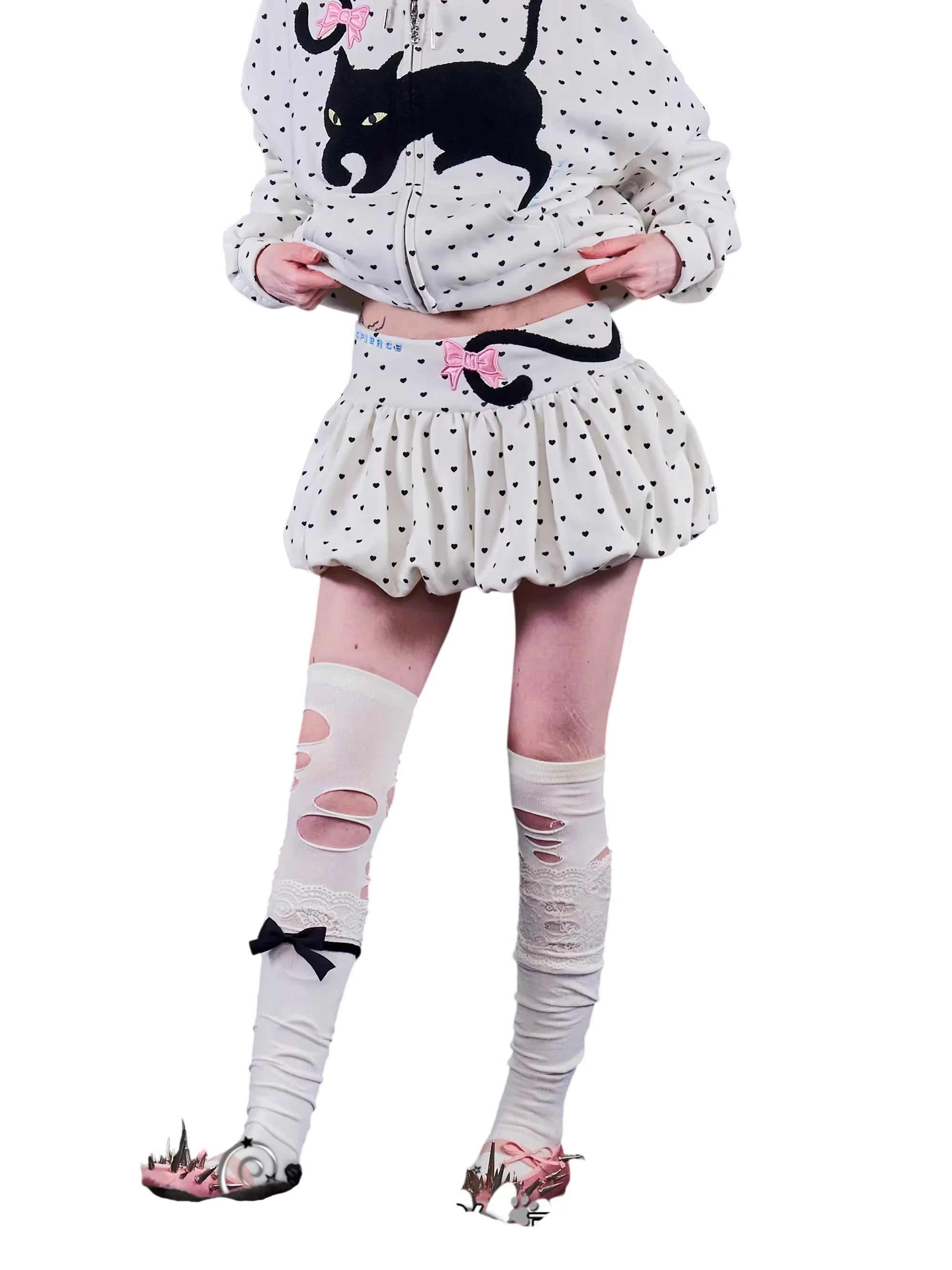 This playful women's skirt features a unique bubble hem design adorned with whimsical cat embroidery. When paired with a matching top, the ensemble creates a charming full-cat illusion, with the front half of the cat depicted on the top and the back half on the skirt. Decorated with small heart prints and a voluminous silhouette, this mini skirt brings a fun and edgy touch to any outfit.