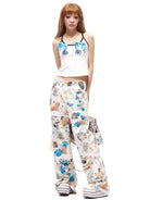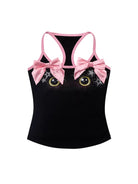 This playful white cropped camisole features black spaghetti straps and two large blue satin bows positioned above cartoon-style eye graphics, creating a fun and whimsical cat face illusion. Designed for women, this top adds a charming and youthful touch to any casual outfit. Perfect for those who love quirky and artistic styles.