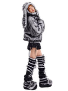 Add a bold touch to your fall and winter wardrobe with these stylish faux fur and leather patchwork leg warmers. Designed for women, these leg warmers feature a striking black and grey color scheme with crisscross faux leather straps, metallic studs, and buckle accents. The soft faux fur trim provides extra warmth and comfort, while the edgy detailing adds a gothic or punk-inspired flair. Perfect for layering over boots, these leg warmers combine functionality with a standout fashion statement.