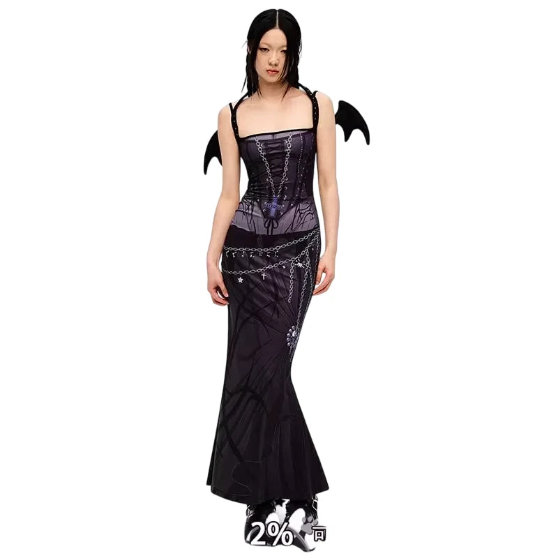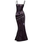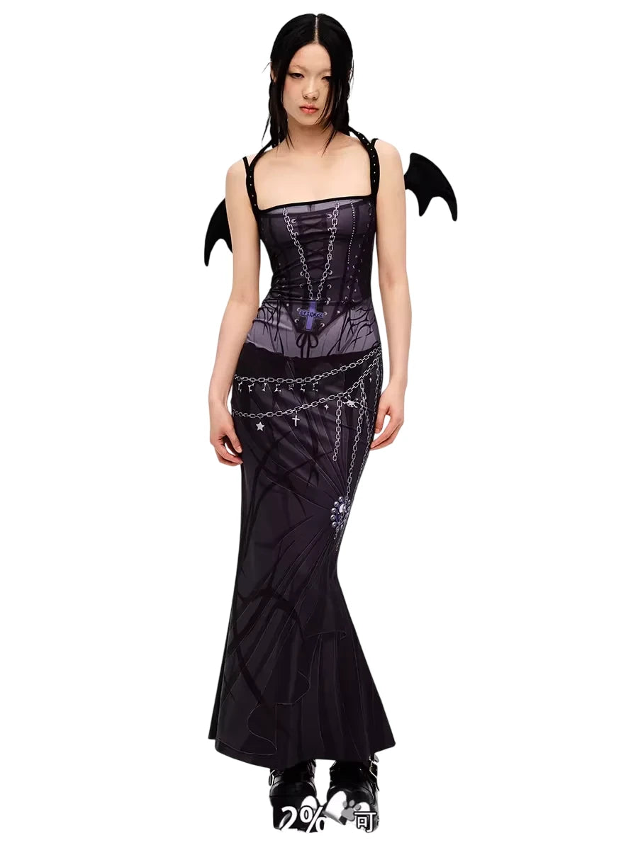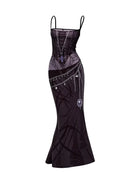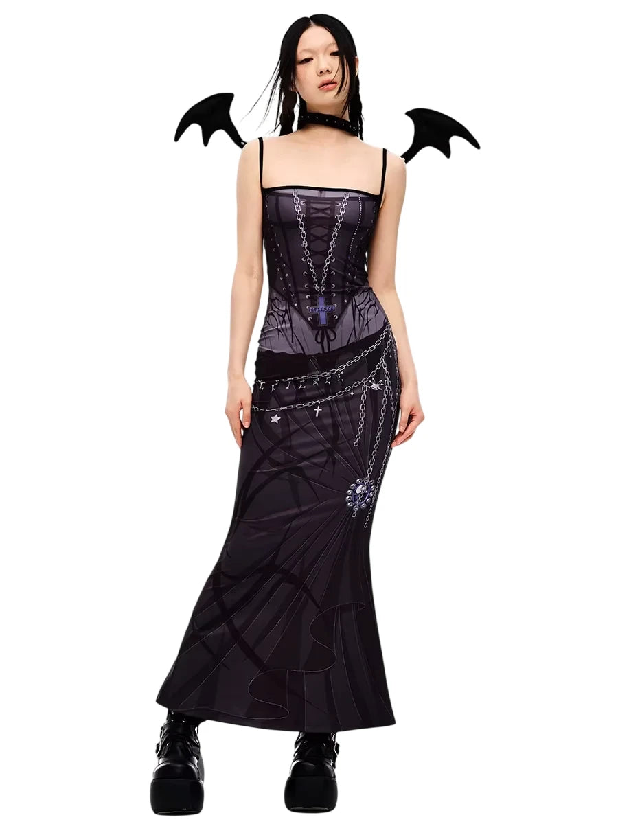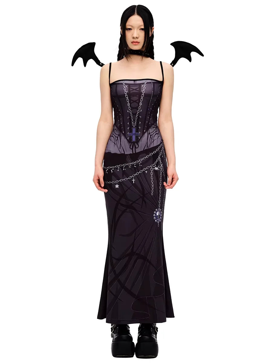 Elevate your gothic-inspired wardrobe with this dramatic spaghetti strap mermaid dress. Designed with a fitted corset-style bodice and delicate straps, it features intricate embellishments, printed chain elements, and a captivating spider-web motif. The flared hemline enhances the mermaid silhouette, creating a bold look perfect for evening wear or themed events. An ideal choice for women who embrace dark, enchanting fashion.
