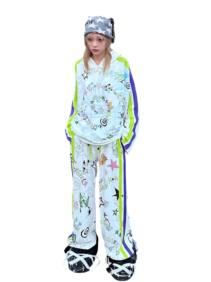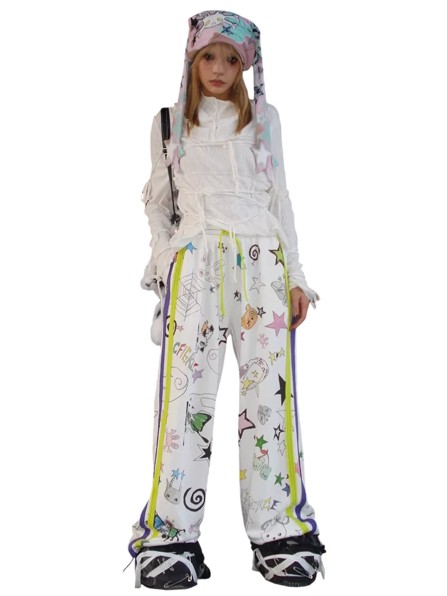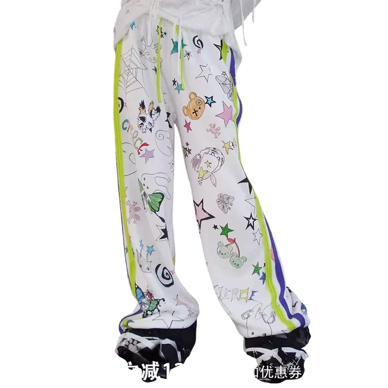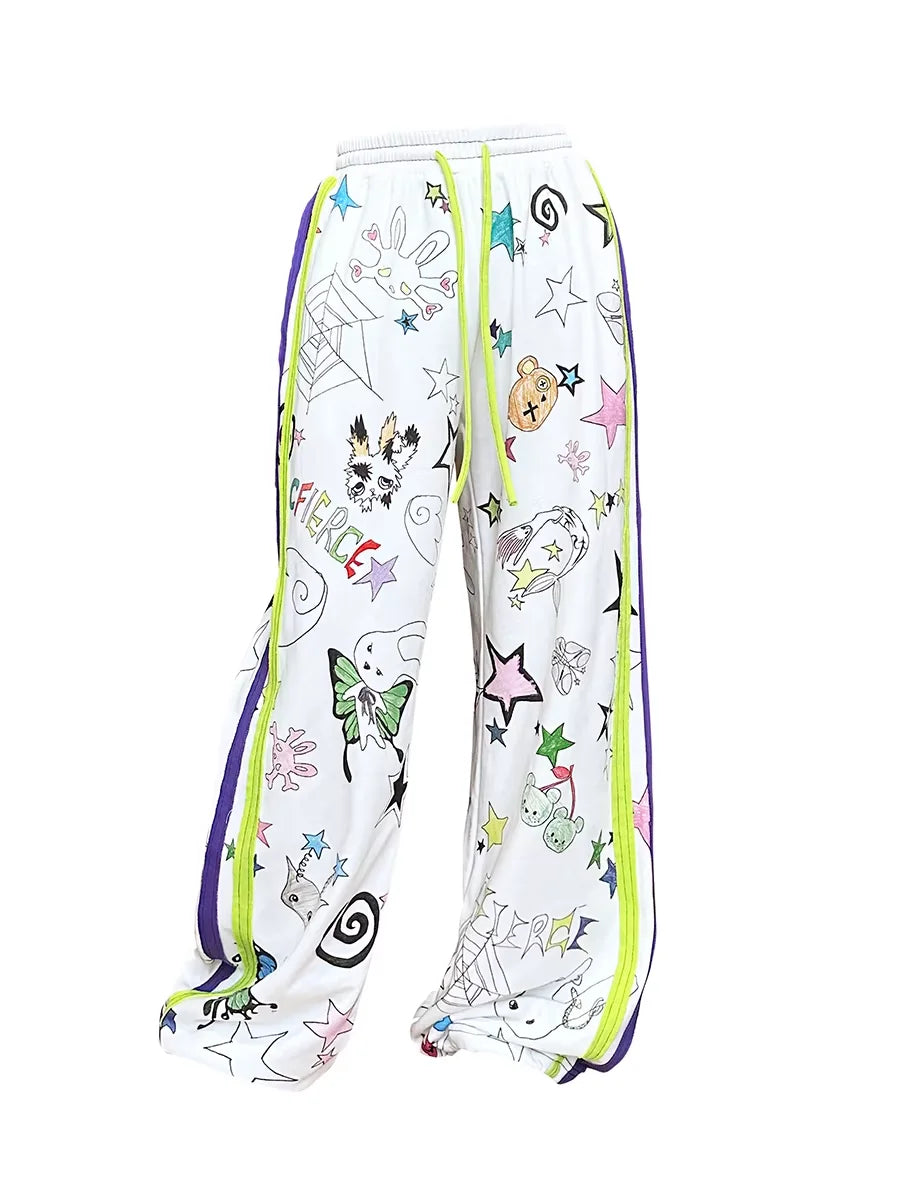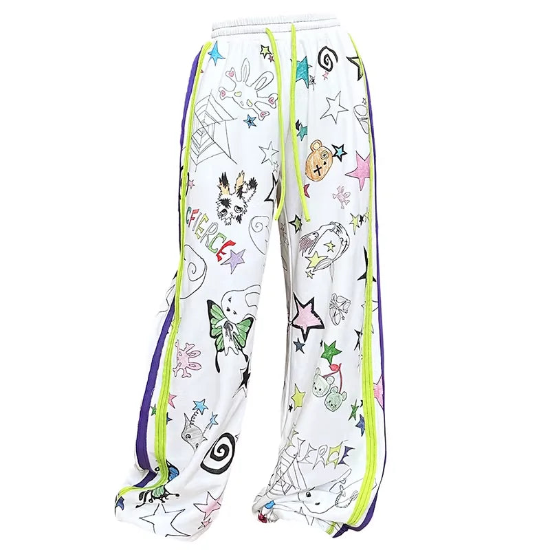 Make a bold streetwear statement with these gender-neutral white track pants, designed with vibrant graffiti-style graphics including stars, cherries, bears, butterflies, and abstract doodles. Featuring sporty neon green and purple side stripes and a comfortable elastic waistband with yellow drawstrings, these pants blend playful visuals with urban edge for a standout look.