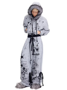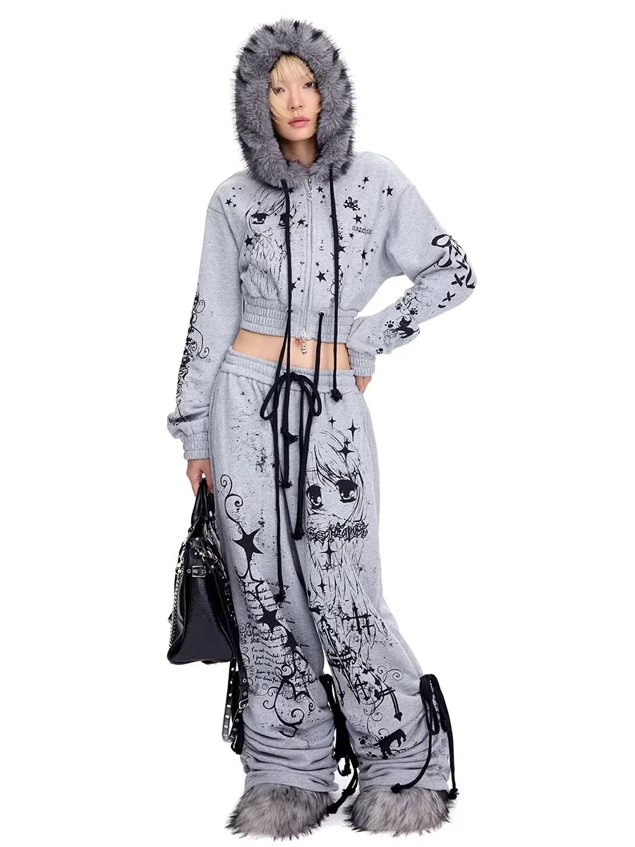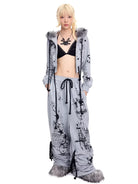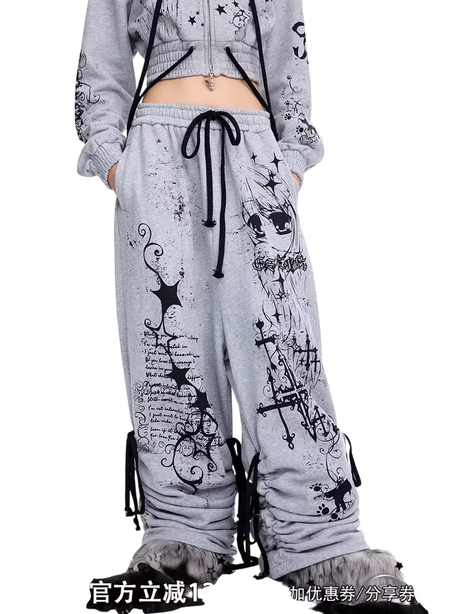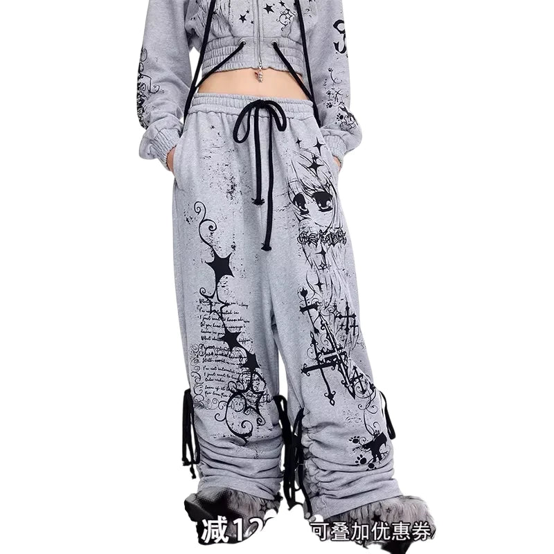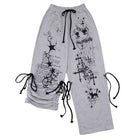 Make a bold statement with these women's graffiti print sweatpants, designed with a high-waisted drawstring waist and an oversized fit for maximum comfort and street style flair. Featuring edgy gothic-style graphics including stars, crosses, script, and a skeletal figure, these stacked sweatpants are both fashionable and functional. The cinched ankles with additional drawstring ties provide adjustable styling, perfect for a custom look. Crafted for the modern streetwear enthusiast, these sweatpants pair effortlessly with crop tops and oversized outerwear.