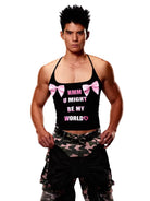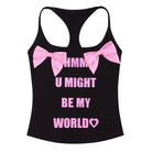 This women's camisole features a bold design with black spaghetti straps and striking pink graphic text that reads 'HMM U MIGHT BE MY WORLD♡'. The top is adorned with large pink bow accents for a playful, streetwear-inspired touch. Perfect for making a statement, this piece pairs well with casual or edgy bottoms.