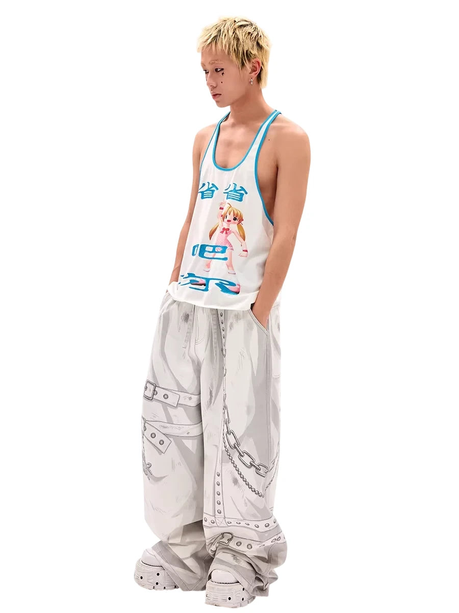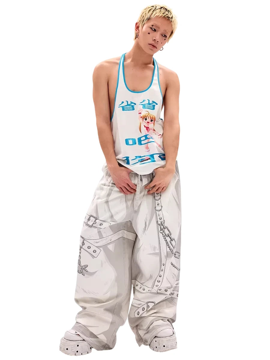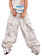 Make a bold fashion statement with these hand-painted, wide-leg jeans featuring a graphic chain and strap design. Crafted in a monochrome palette of white, gray, and black, these jeans offer a streetwear-inspired edge with an artistic flair. Designed with a low-rise fit and an adjustable drawstring waist, they blend comfort and rebellious style. Perfect for a youthful, creative look, these jeans are modeled by a male and pair easily with other contemporary streetwear pieces.