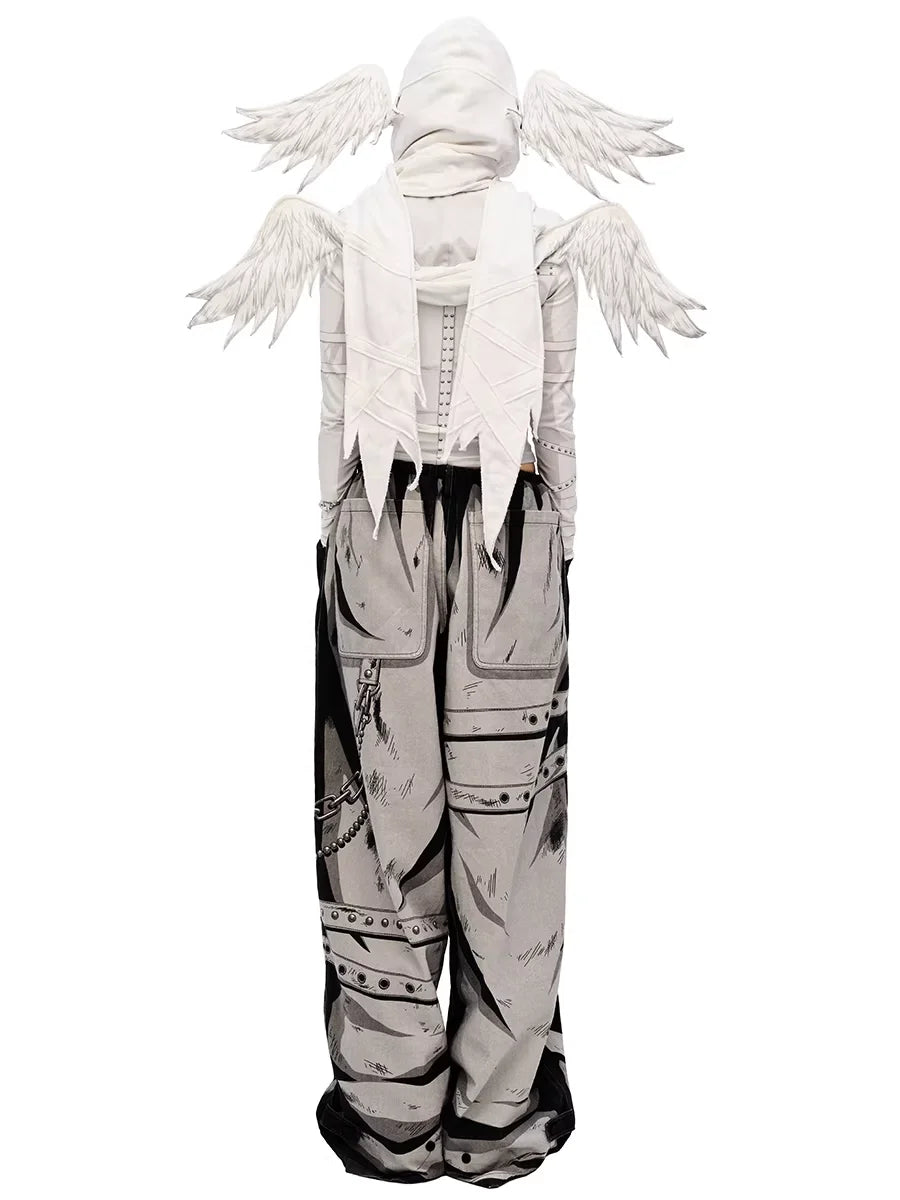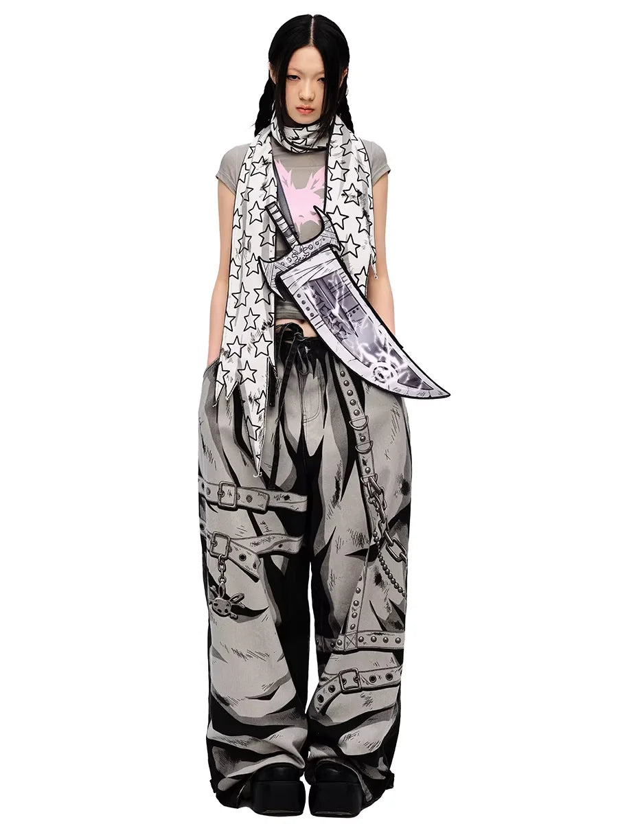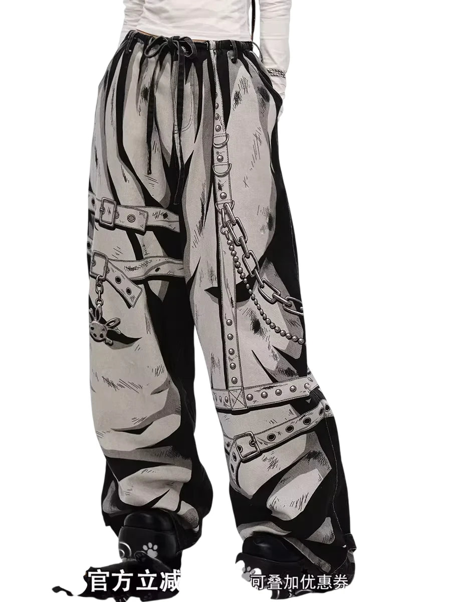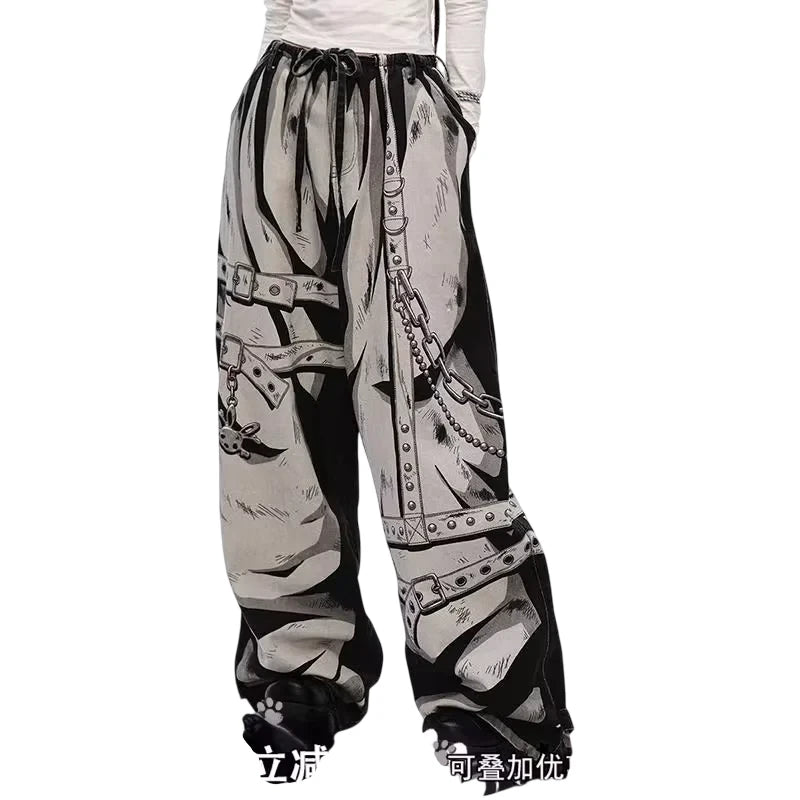 Make a bold statement with these hand-painted graphic jeans designed in a unisex streetwear style. Featuring wide legs and a baggy silhouette, these pants showcase a striking monochrome illustration of metal chains, straps, and rivets. The elastic waistband with drawstring offers a customizable fit, perfect for comfort and urban edge.