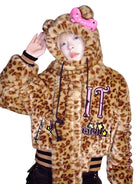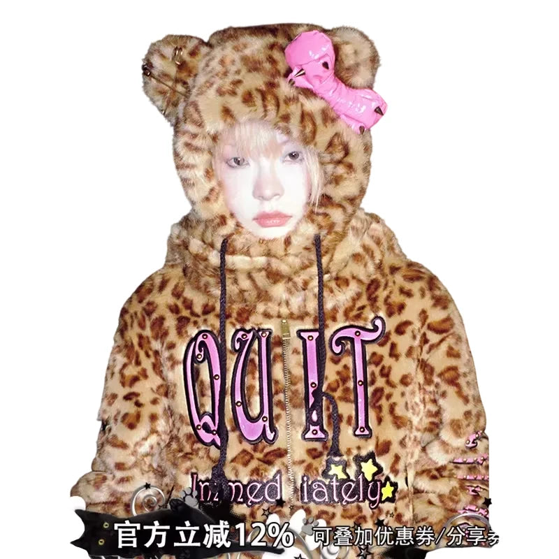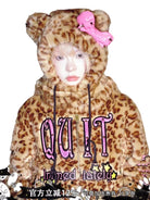 This cozy and eye-catching plush hoodie features a fun leopard print design and a whimsical bear-ear hood. Embellished with large pink lettering that reads 'QUIT' and smaller cursive script underneath, it combines playful elements with bold streetwear style. The addition of a shiny pink bow adds a youthful charm. Designed for women, this oversized faux fur hoodie is perfect for casual or street-inspired looks.