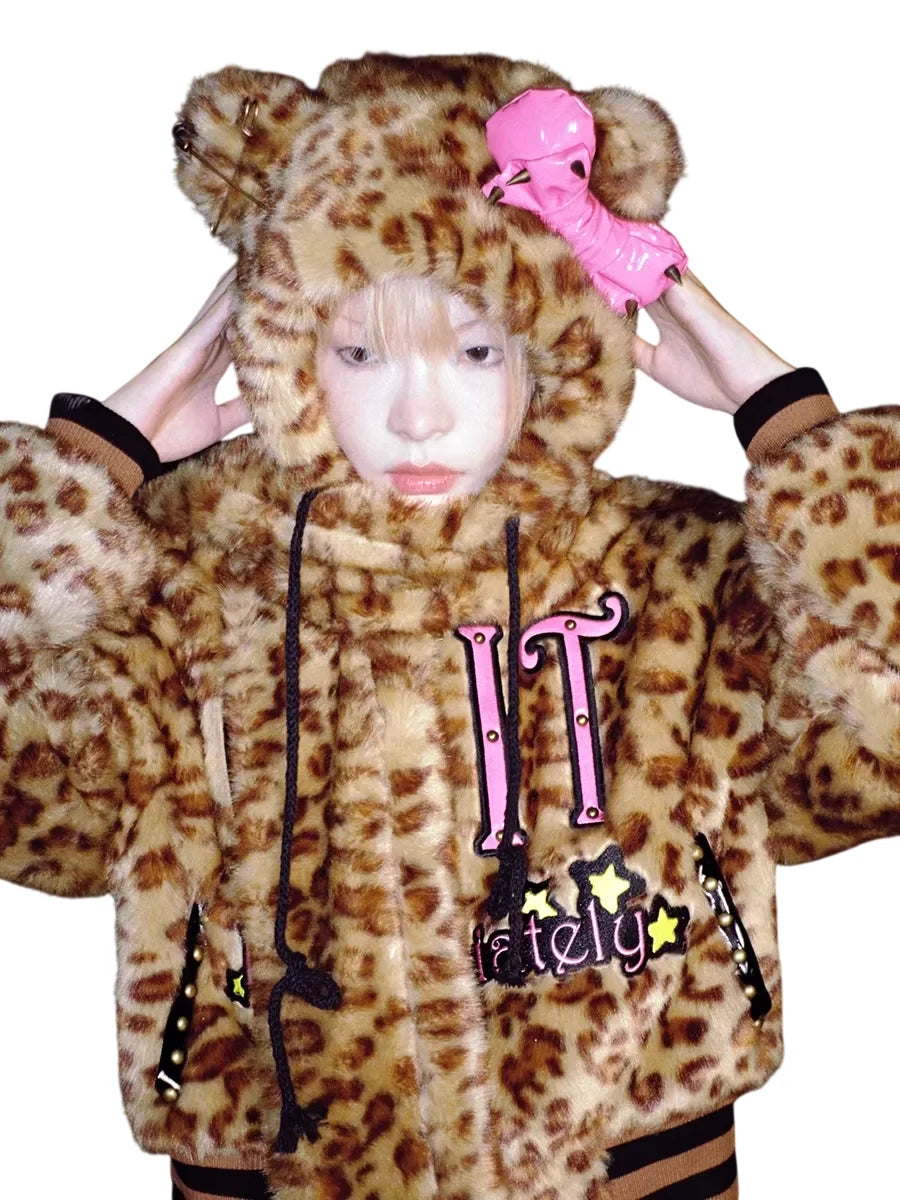 CFIERCE Leopard Print Faux Fur Hoodie with Bear Ears