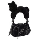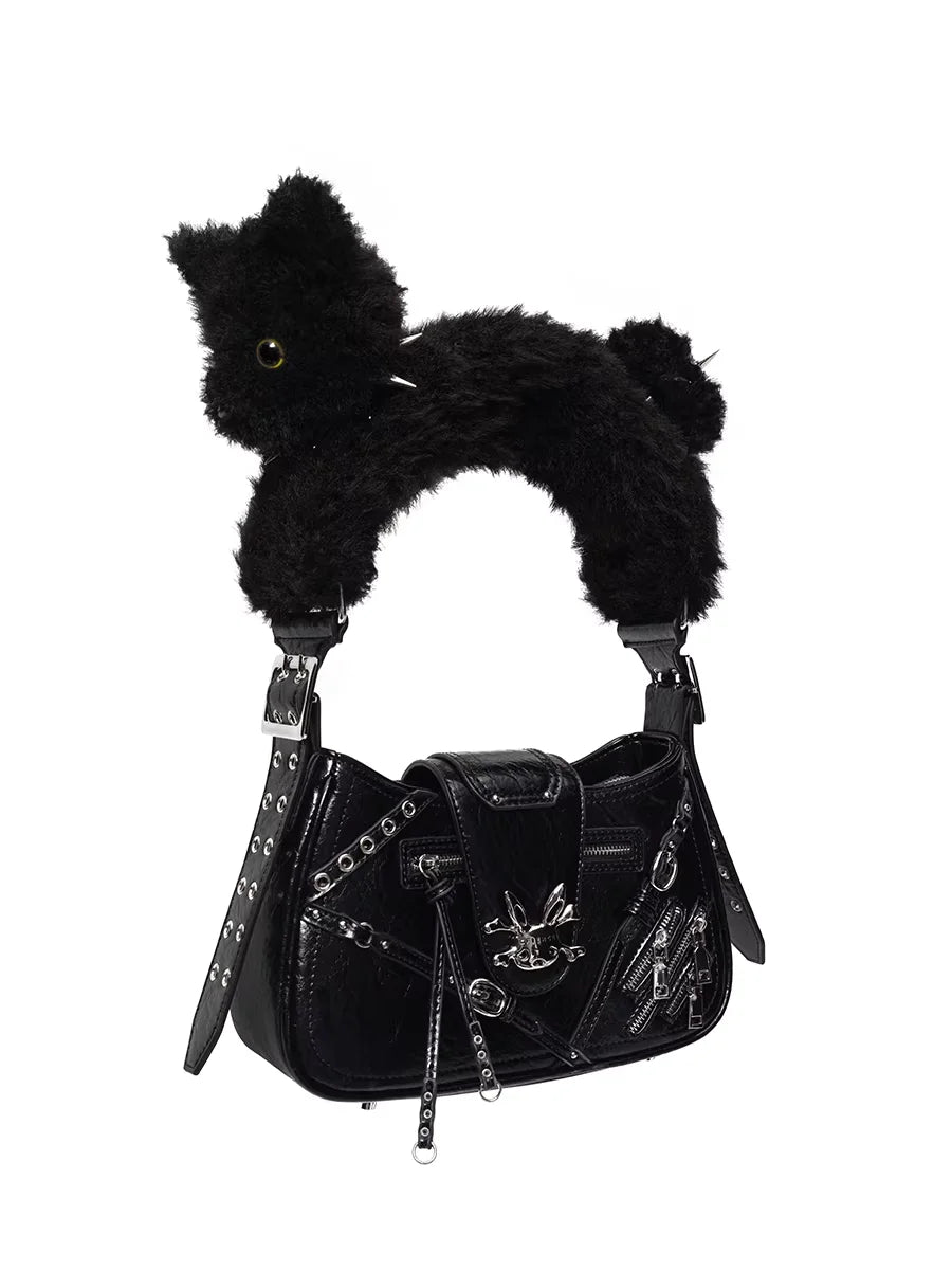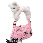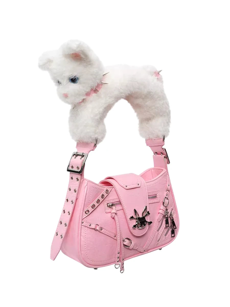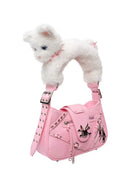This women's tote bag features a whimsical and stylish design in a soft pastel pink shade. Highlighting its playful charm, the strap is crafted to resemble a plush white cat, complete with blue eyes and a pink bow collar. The bag is adorned with edgy accents including decorative zippers, metal studs, and a shiny gothic-style bunny emblem, offering a perfect blend of cute and bold aesthetics.