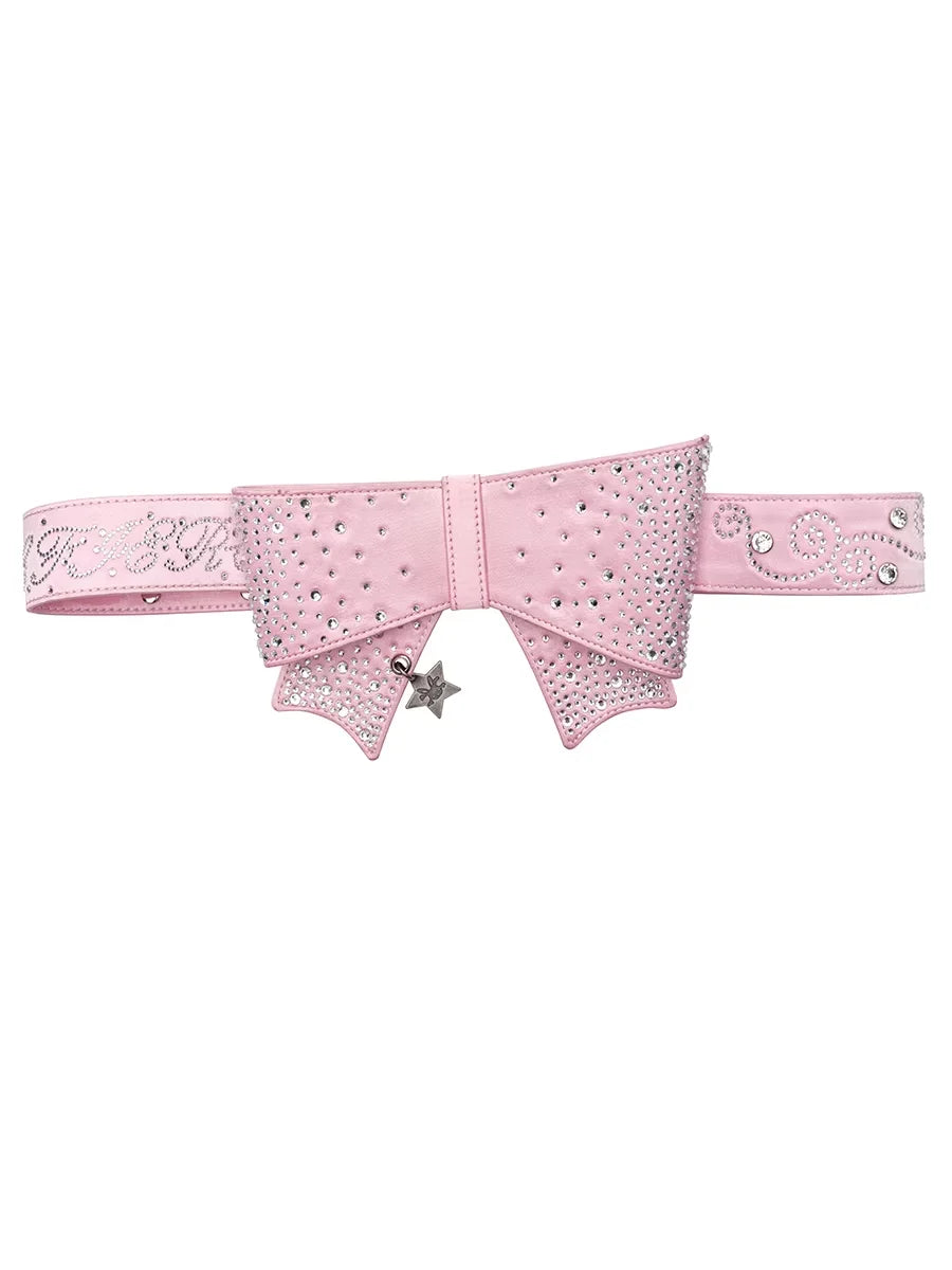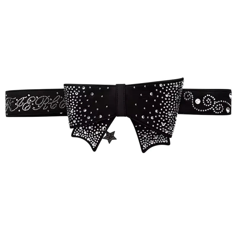 Elevate your outfit with this glamorous black belt designed for women. Featuring an oversized bow at the center, adorned with sparkling rhinestones and a whimsical star-shaped charm, this belt brings a touch of elegance and playfulness. Intricate rhinestone patterns span the length of the belt, making it a standout accessory for any occasion.