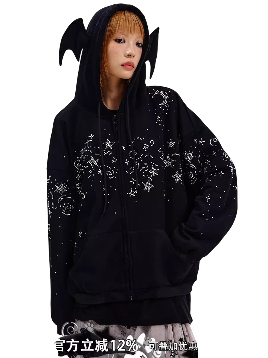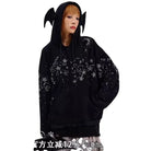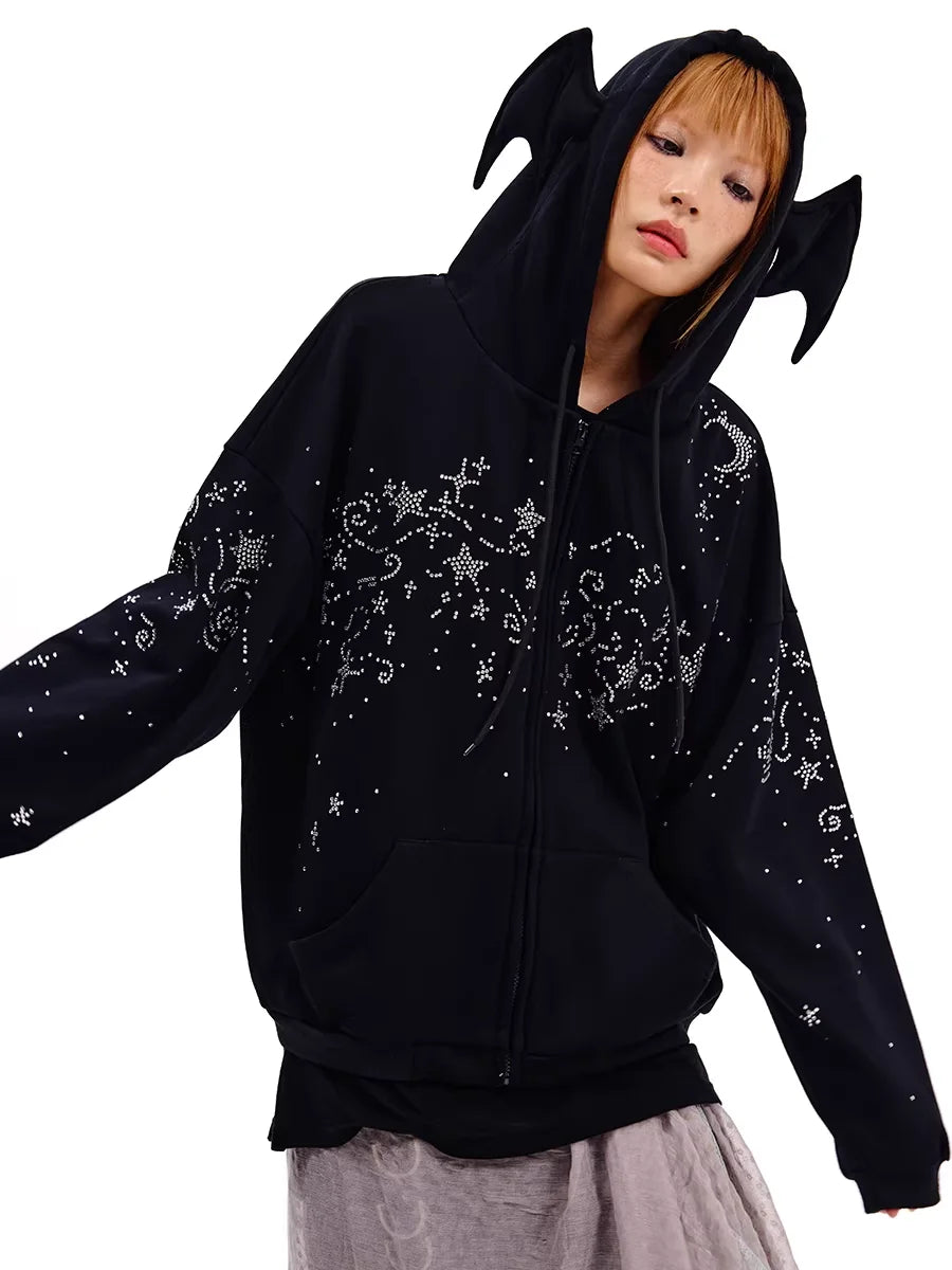 This women's hooded sweatshirt features an eye-catching star and swirl rhinestone design across the chest, sleeves, and shoulders for a celestial-inspired look. Made from soft, thick material, it provides warmth and comfort for autumn and winter wear. The oversized fit with dropped shoulders and front pockets adds a relaxed, cozy feel. A standout feature is the large hood with playful bat-like ears, offering a unique and gothic touch perfect for casual street style.