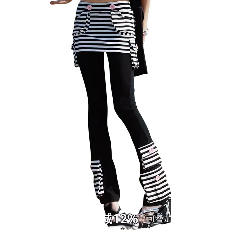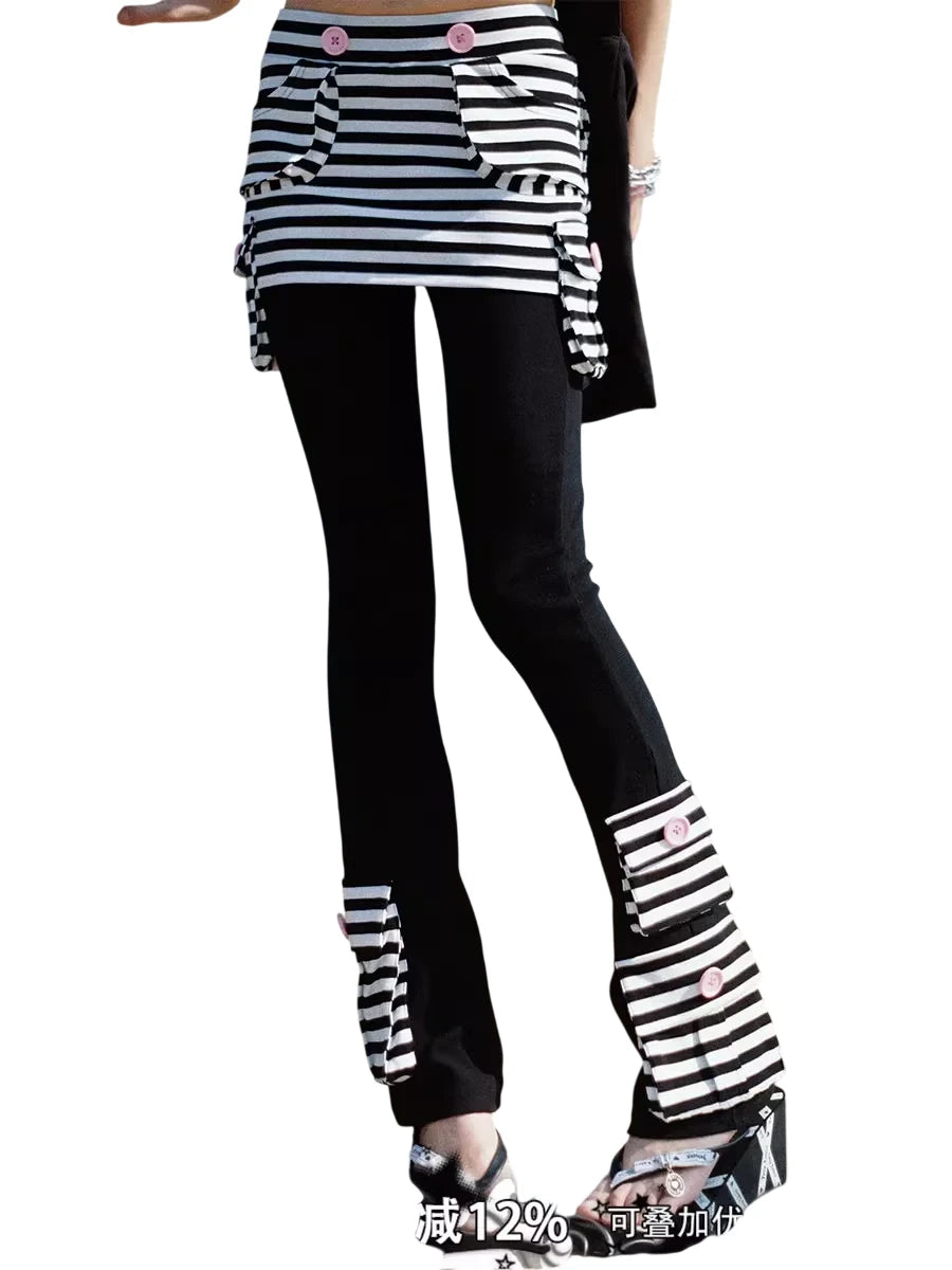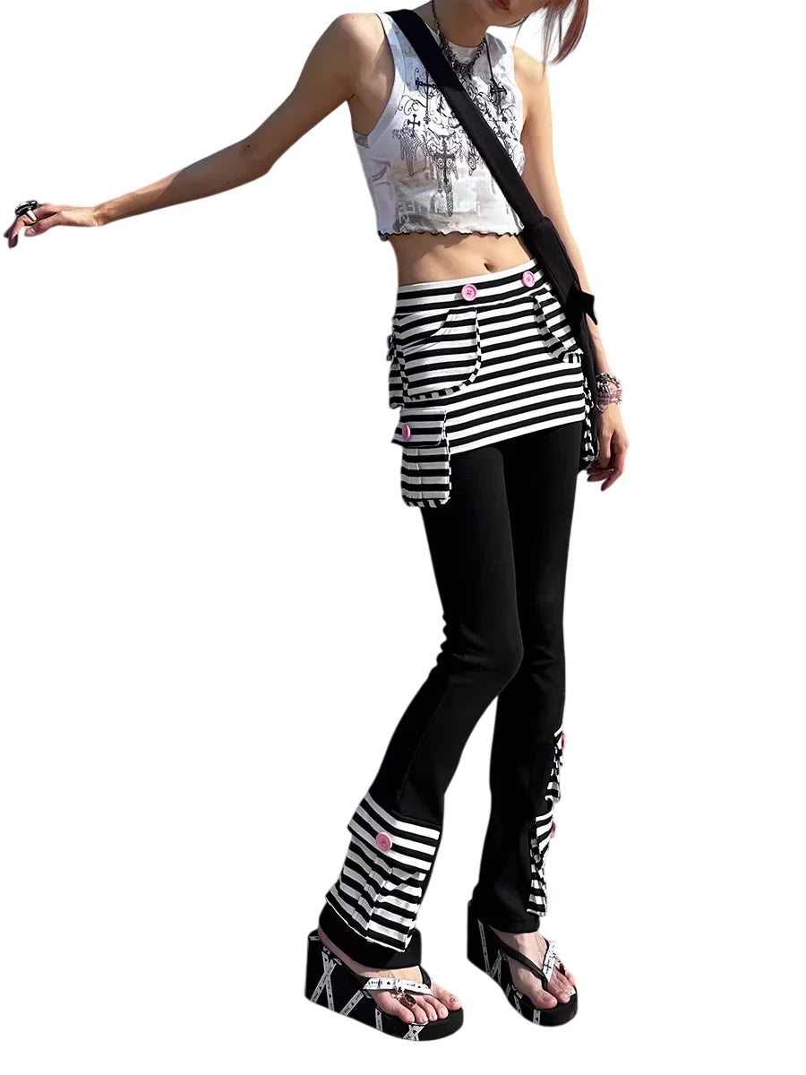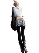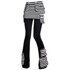 This women's flared skort features a bold patchwork design with black and white horizontal stripes adorning the waistband, pockets, and hem. Pink button accents add a playful contrast, combining style and comfort in a unique silhouette. Perfect for outdoor outings or casual chic looks.