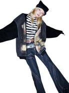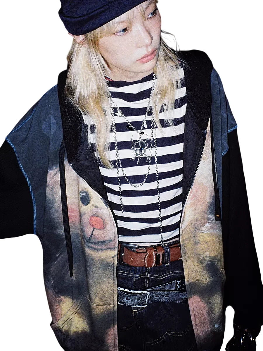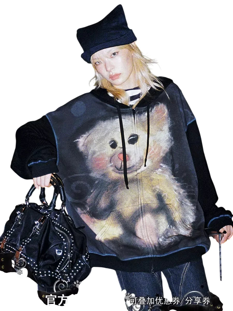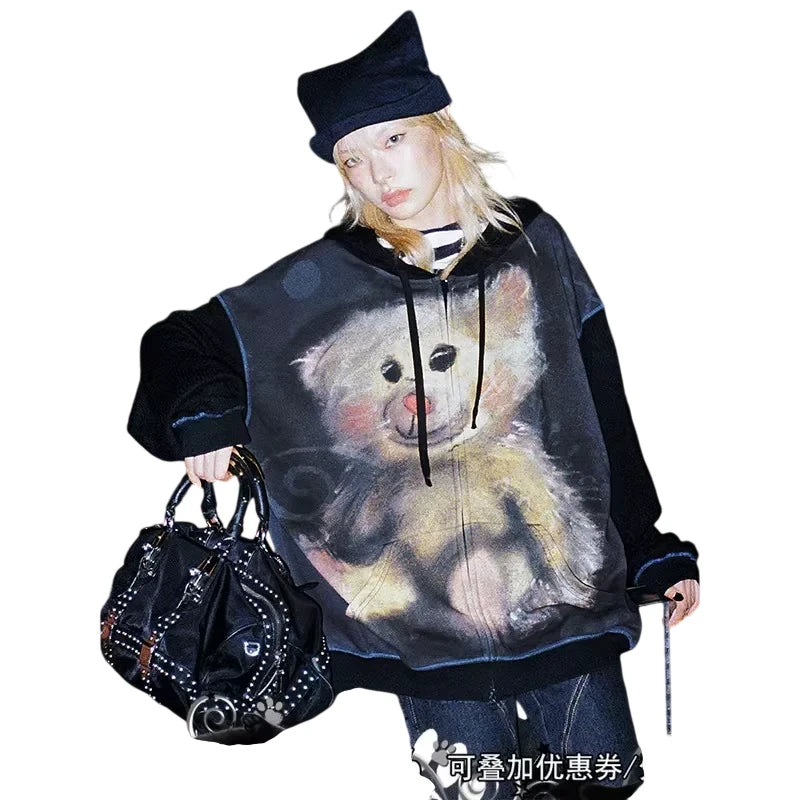 This women's zip-up hoodie features a bold and detailed teddy bear graphic on the front, offering a fun and artistic streetwear appeal. Designed in black with contrasting blue stitching, it includes a full-length zipper, drawstring hood, and comfortably loose sleeves. Perfect for casual and edgy styling.