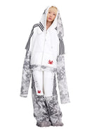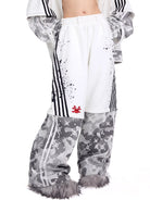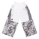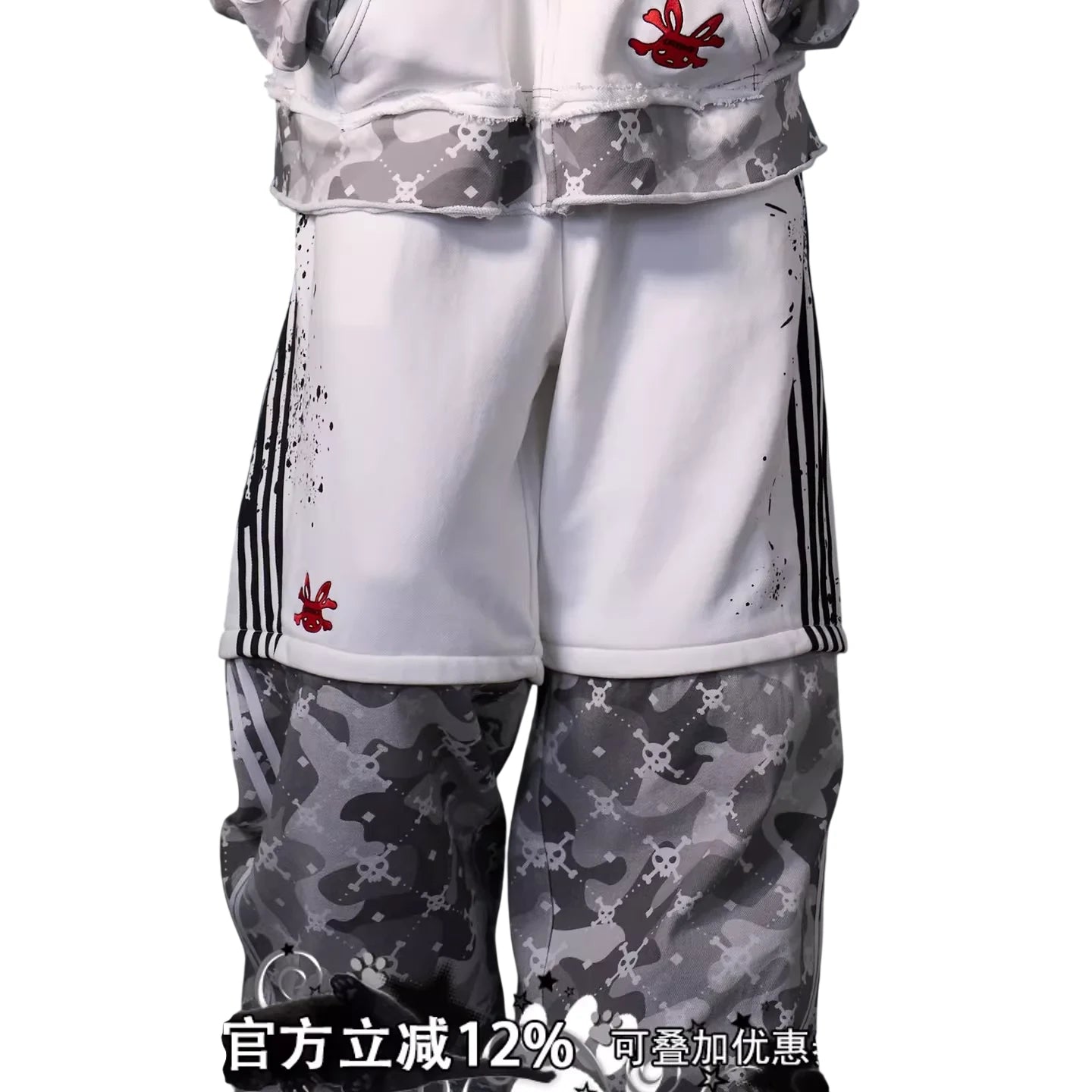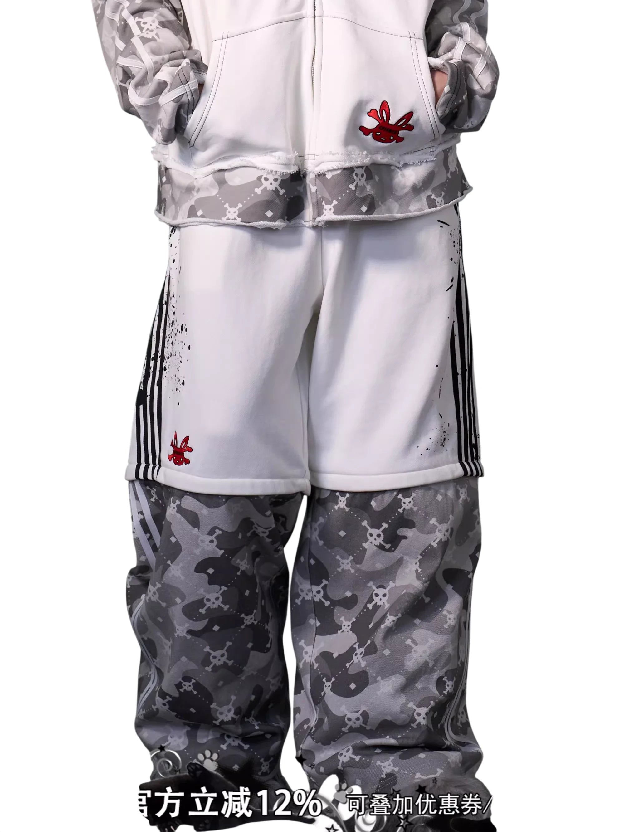 Express your streetwear style with these two-in-one men's sweatpants featuring a bold layered design. The upper layer resembles shorts in white with black side stripes, splatter details, and a red cartoon graphic. Beneath, full-length gray camouflage pants with skull motifs add an edge to the look. A mix of patterns across the waistband and shorts offers a cohesive and striking appearance. Perfect for urban fashion with a functional twist.