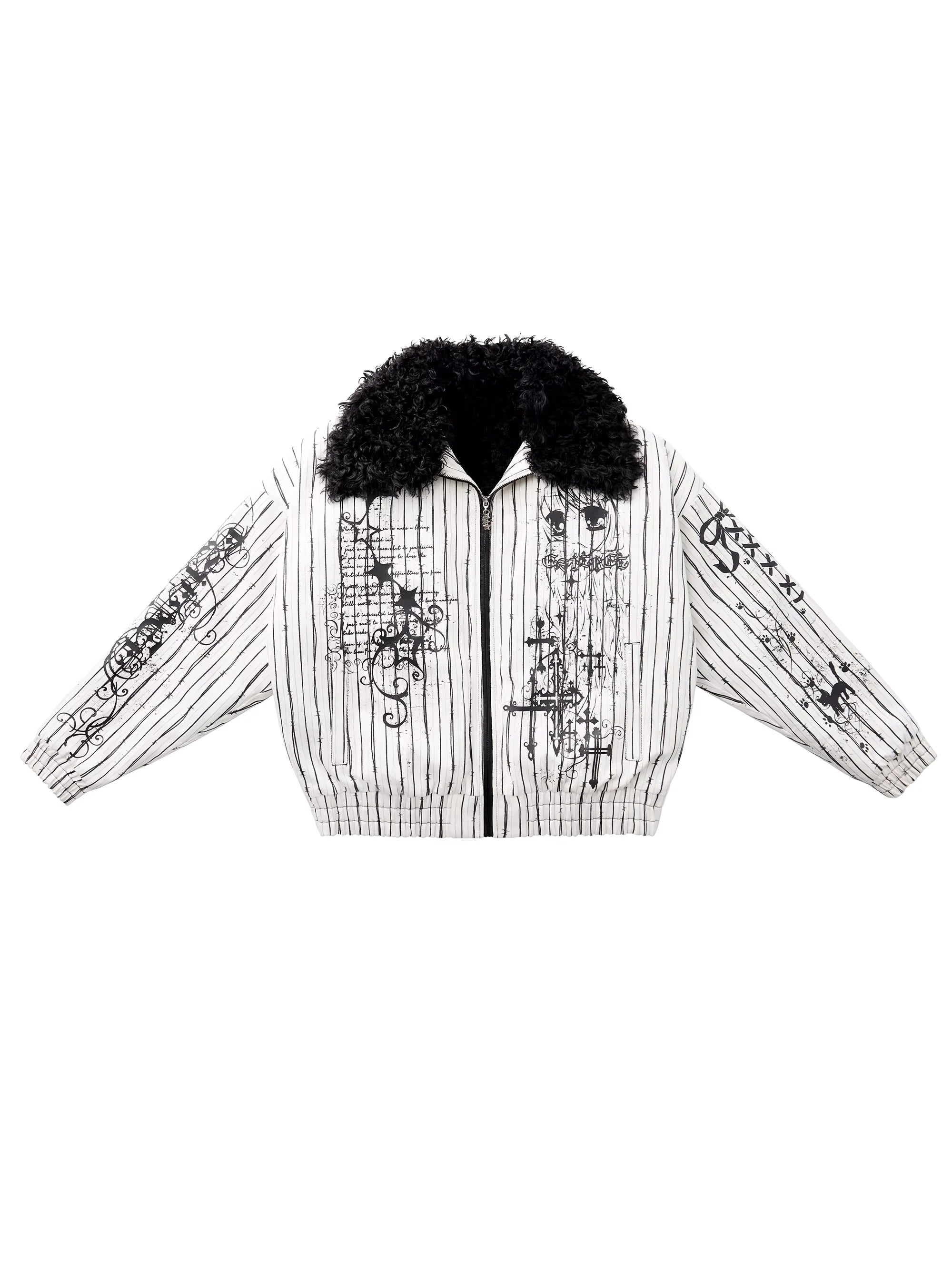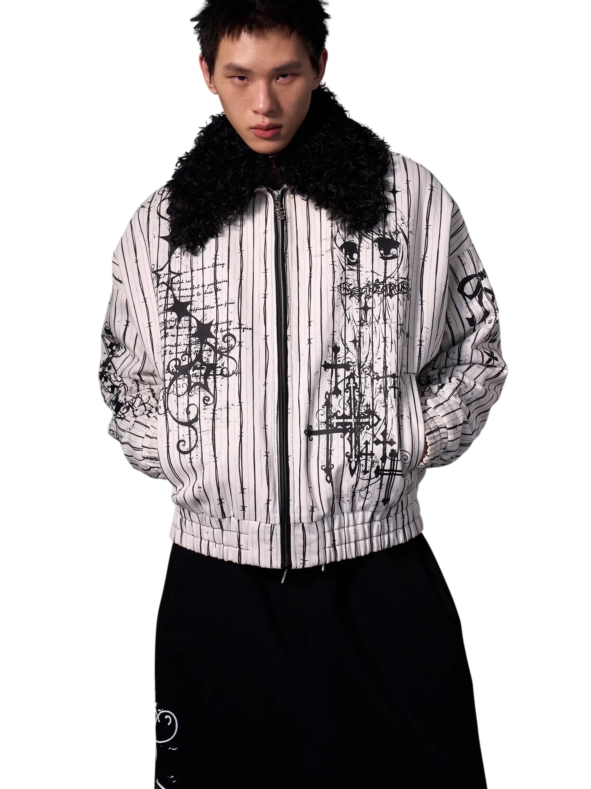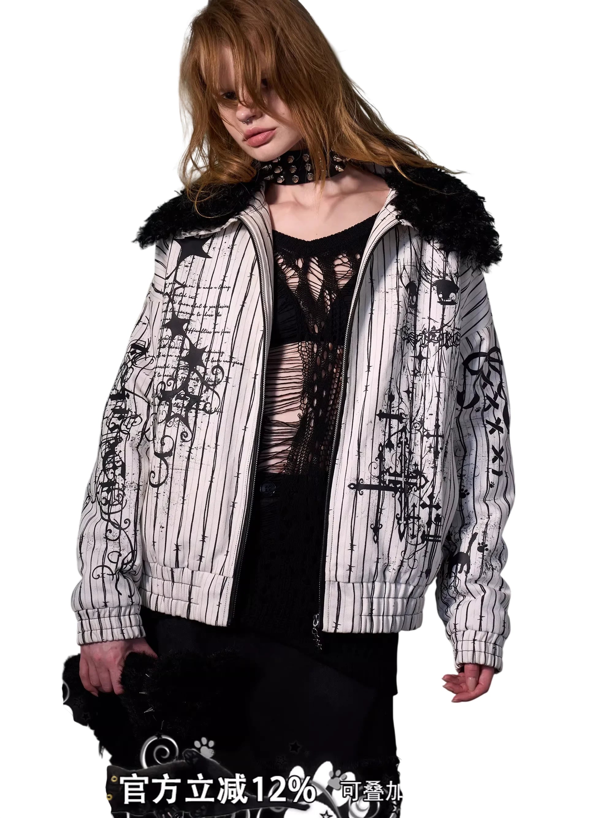 CFIERCE Striped Gothic Angel Print Jacket with Detachable Fur Collar