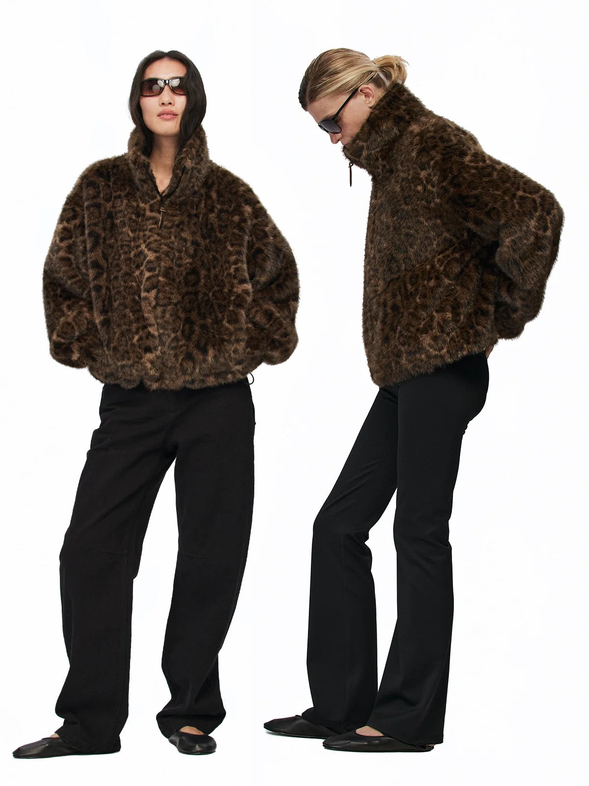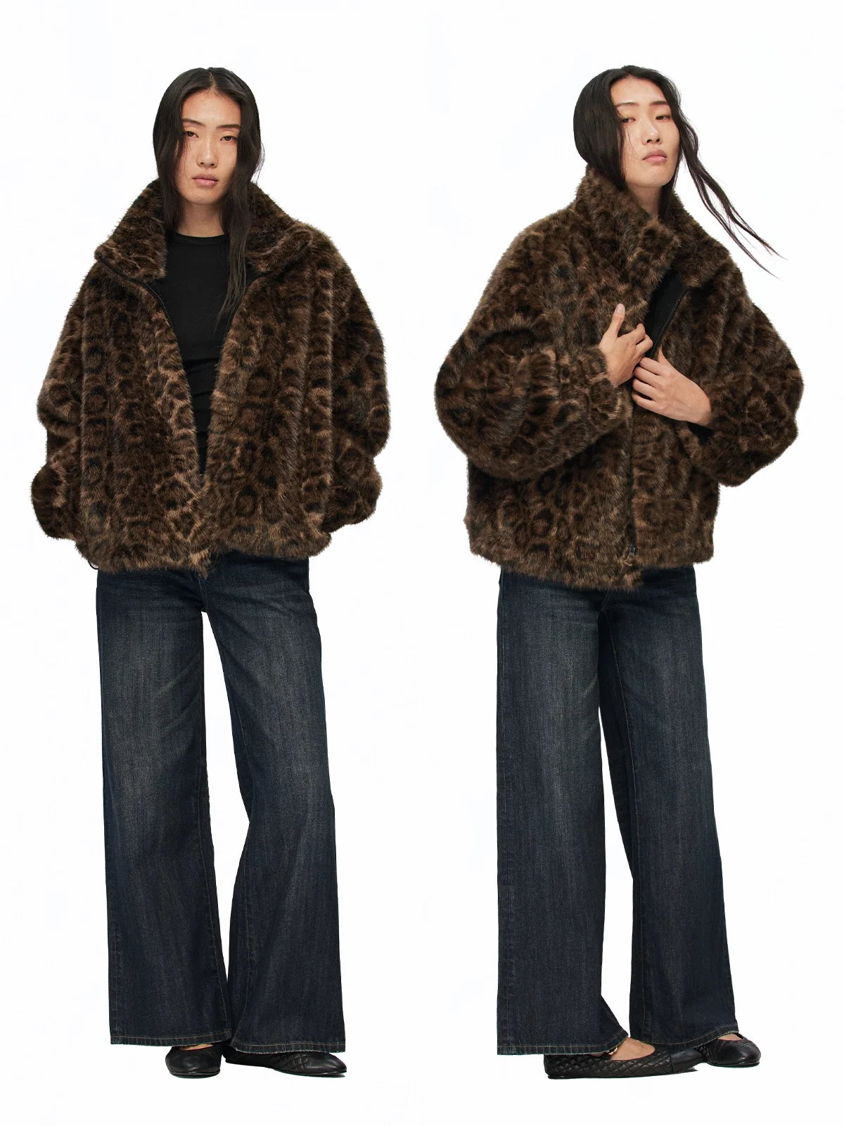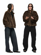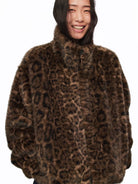 Make a bold statement with this women's oversized faux fur coat featuring a striking brown and black leopard print pattern. Designed with a high stand collar and drop-shoulder silhouette, this windproof jacket offers both warmth and fashion-forward style. It includes full-length sleeves, side pockets, and a front zip closure with a metallic zipper pull for added detail. Perfect for trendy winter or fall wear, this coat combines eco-conscious materials with runway-inspired flair.