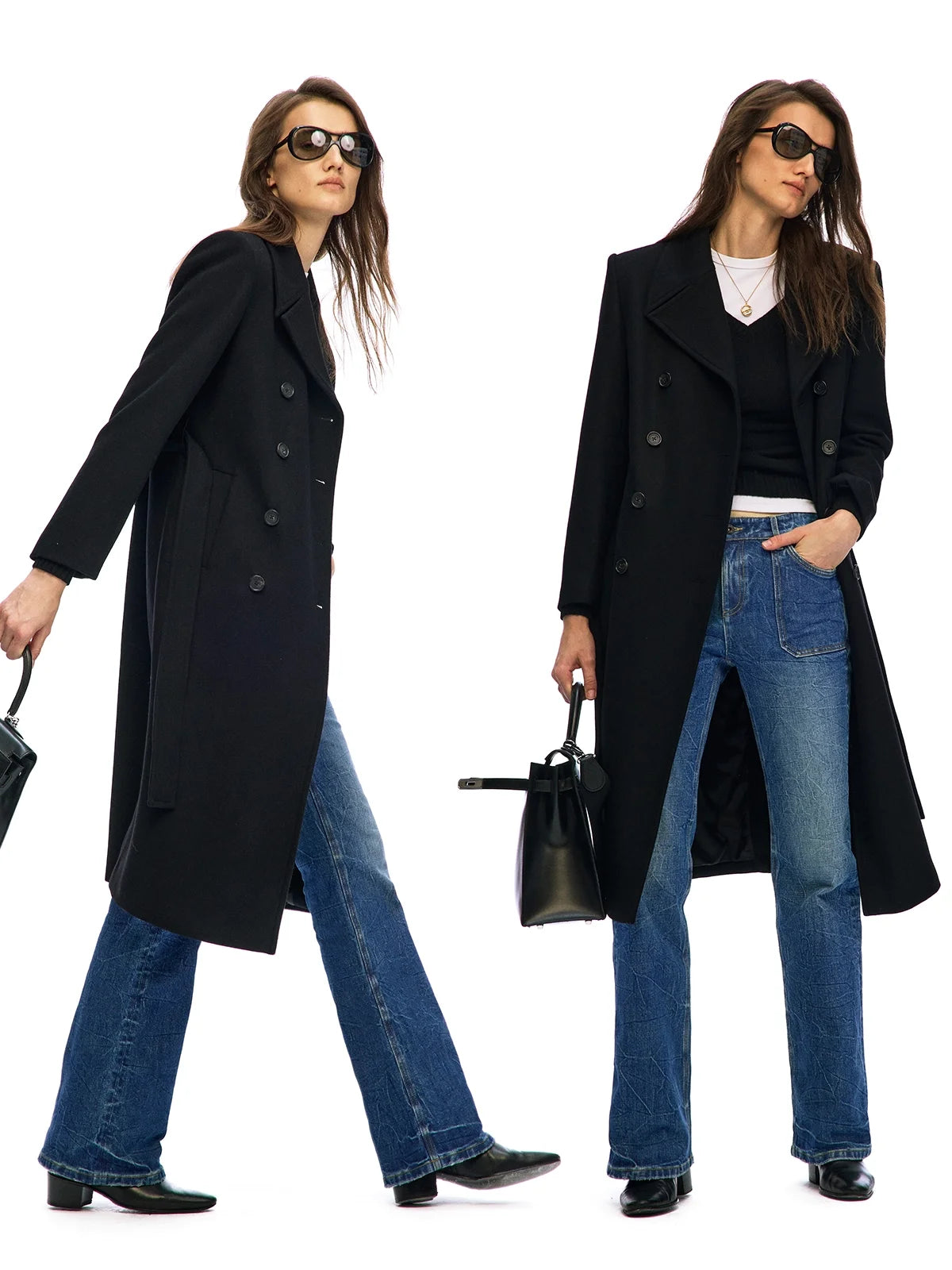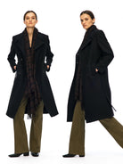 Elevate your outerwear with this women's wool structured long coat, designed in a flattering H-shape silhouette. Featuring a refined large lapel and shoulder pads for added shape, this coat offers a contemporary double-breasted front that enhances its tailored appeal. The classic black color and long length create a modern statement piece perfectly suited for cool weather. Layered effortlessly over separates, this coat embodies urban sophistication and timeless style.