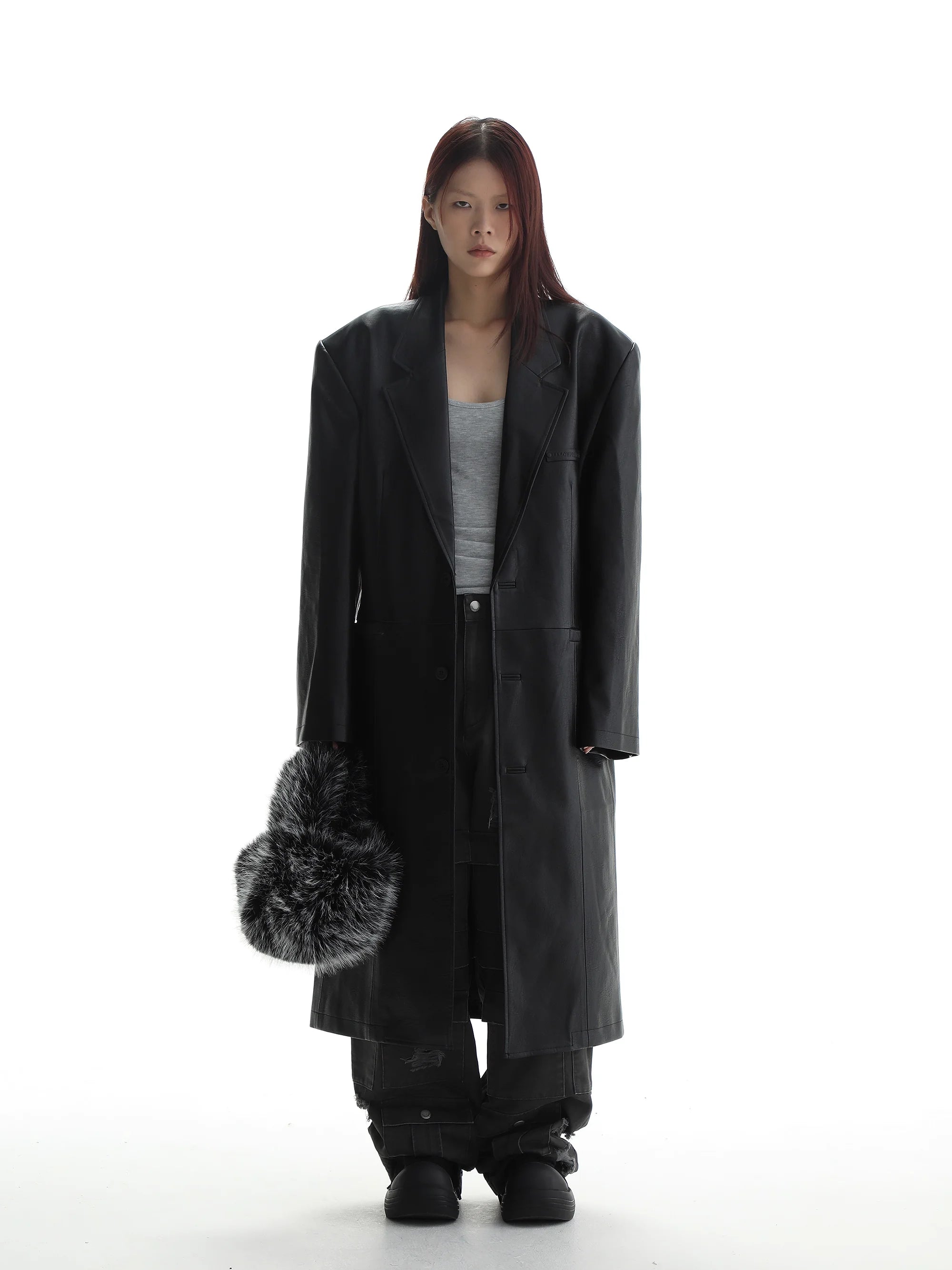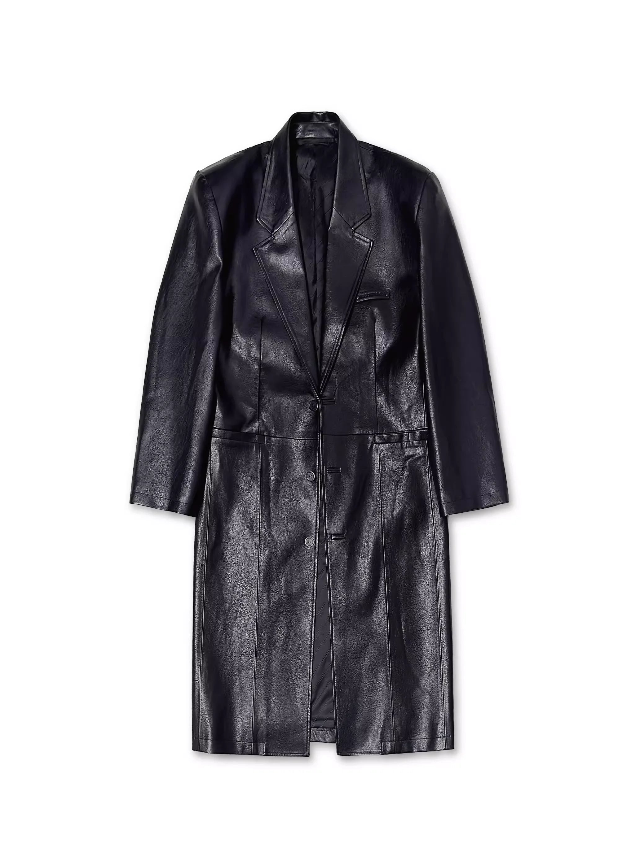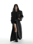 Elevate your wardrobe with this women's long black faux leather trench coat, designed with a modern oversized silhouette and front button closure. Ideal for layering, this casual yet edgy piece creates a striking look when styled with dark-toned separates. The coat's structured design adds sophistication to any outfit, while the rich black faux leather finish offers a bold, urban aesthetic.