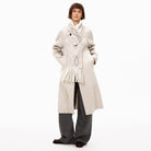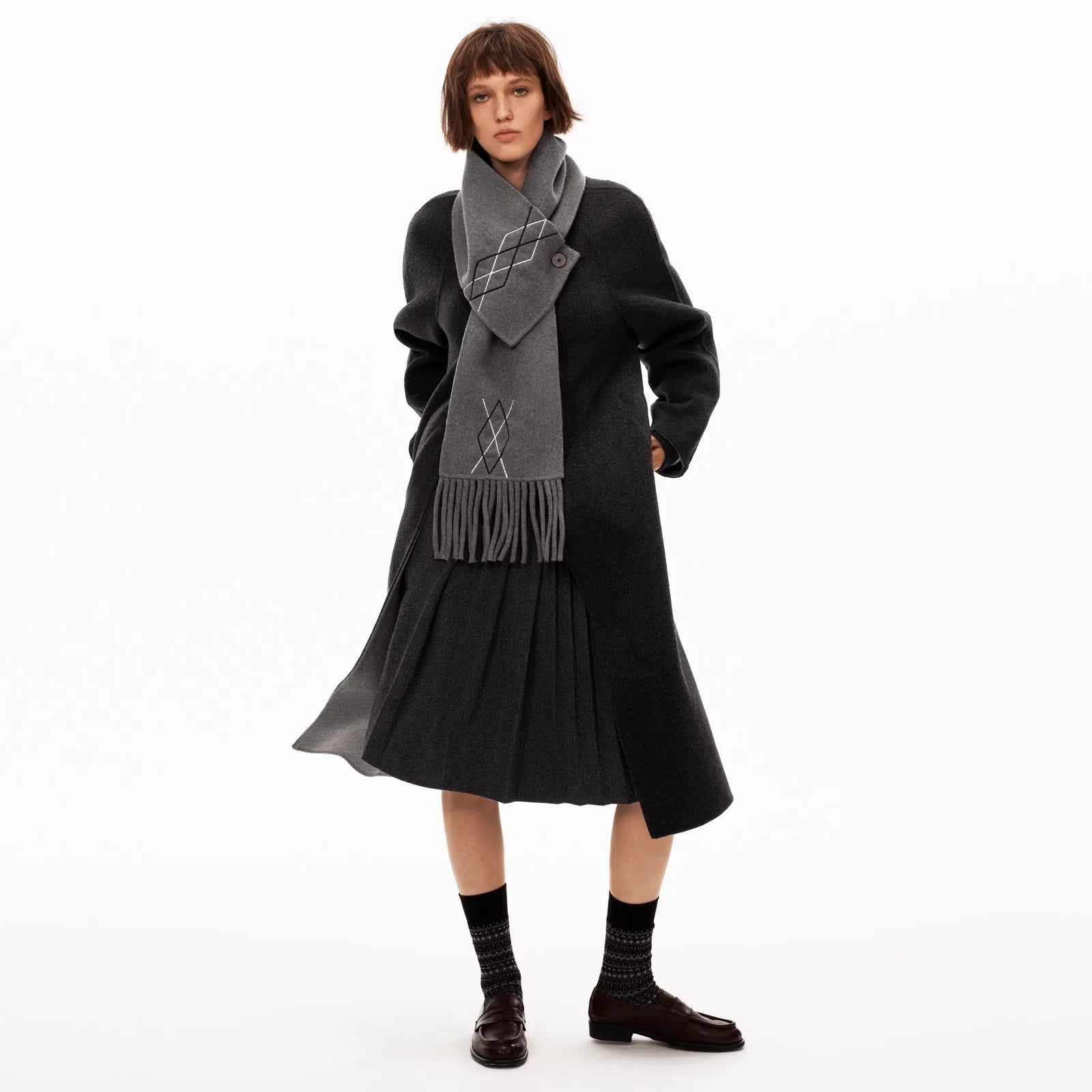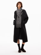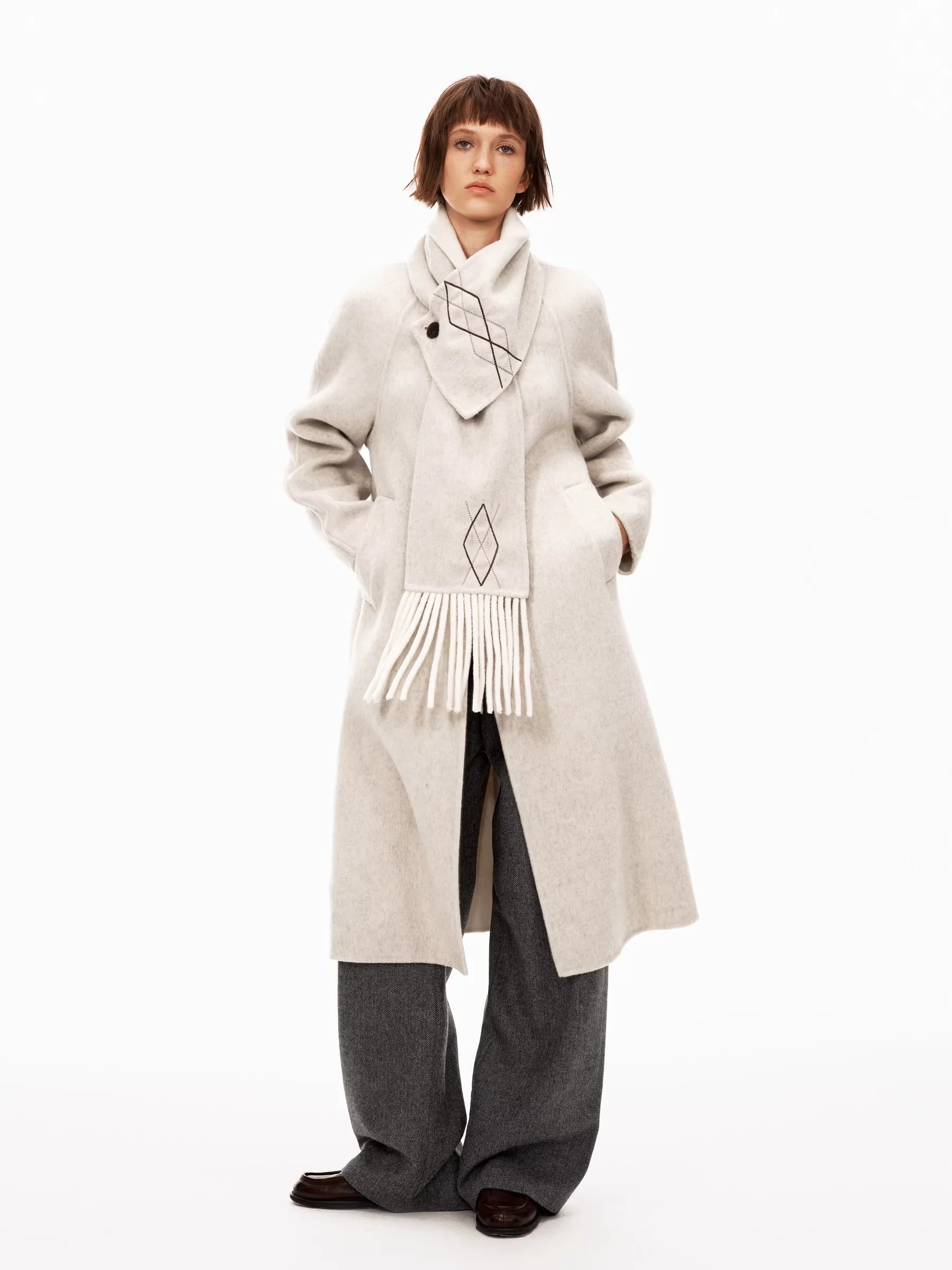 Elevate your winter wardrobe with this elegant long coat crafted from a 68% wool blend. Designed with a double-sided construction for added warmth and structure, it features a refined diamond-patterned scarf with tassel detailing integrated into the lapel. Side pockets offer practical functionality while maintaining the coat’s clean silhouette. Available in both dark gray and light beige, this minimalist, heavyweight overcoat is ideal for the colder seasons and offers timeless sophistication for women.