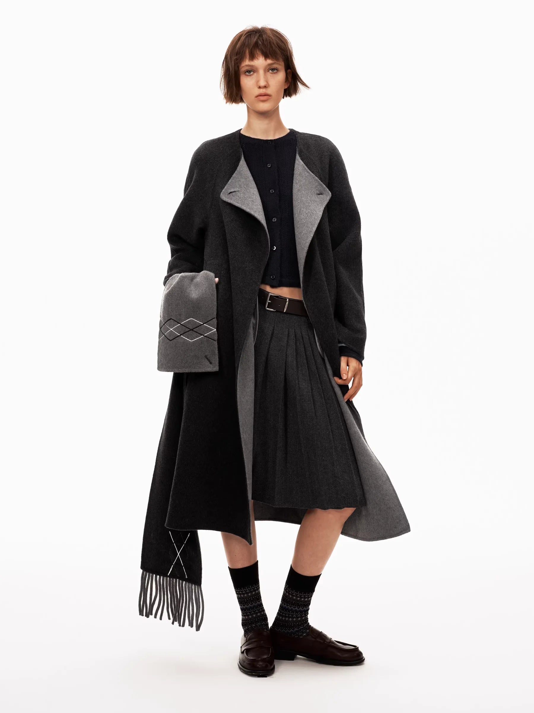 PUKI Wool Blend Diamond Pattern Scarf Lapel Long Coat