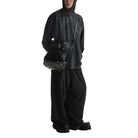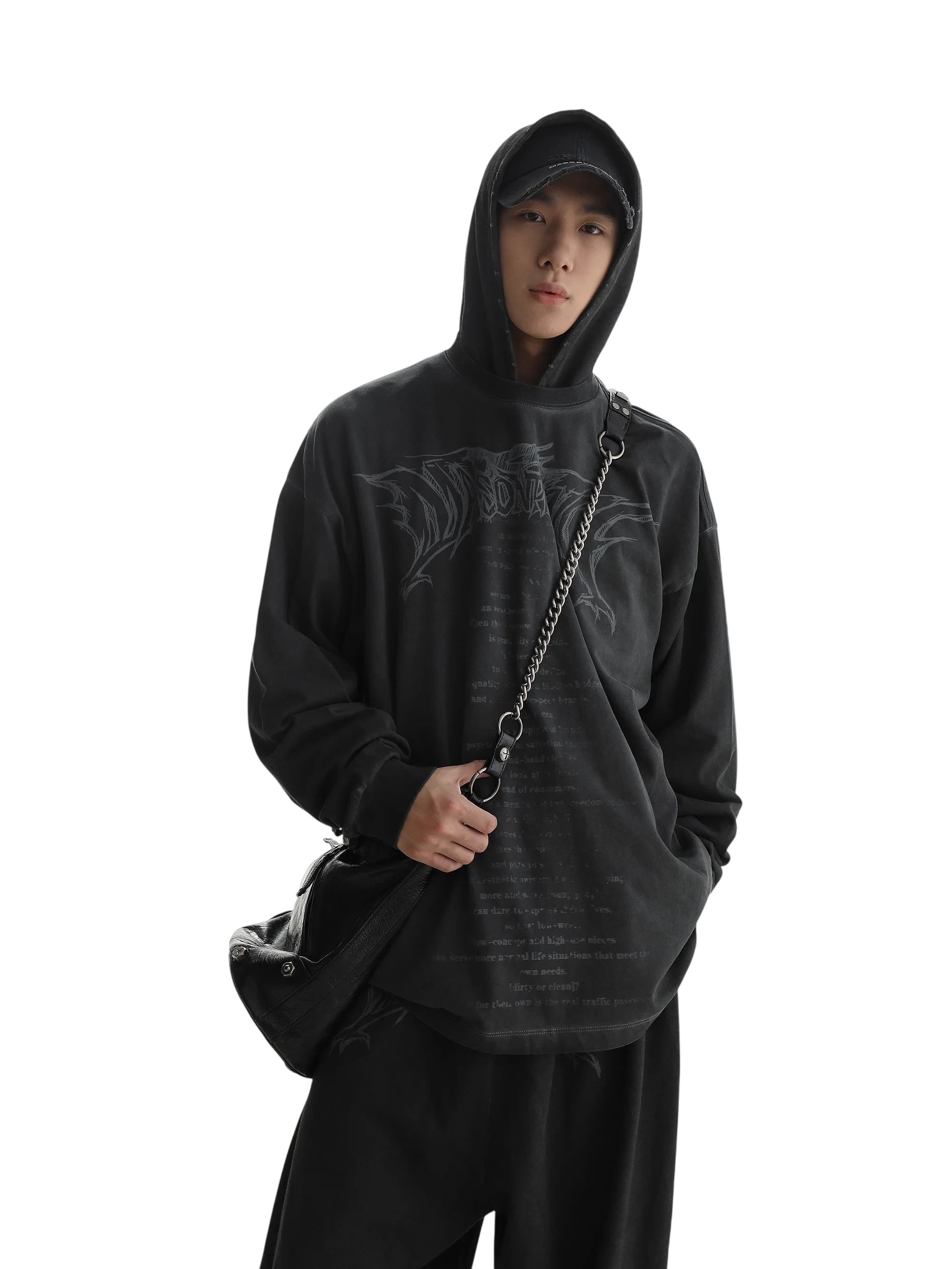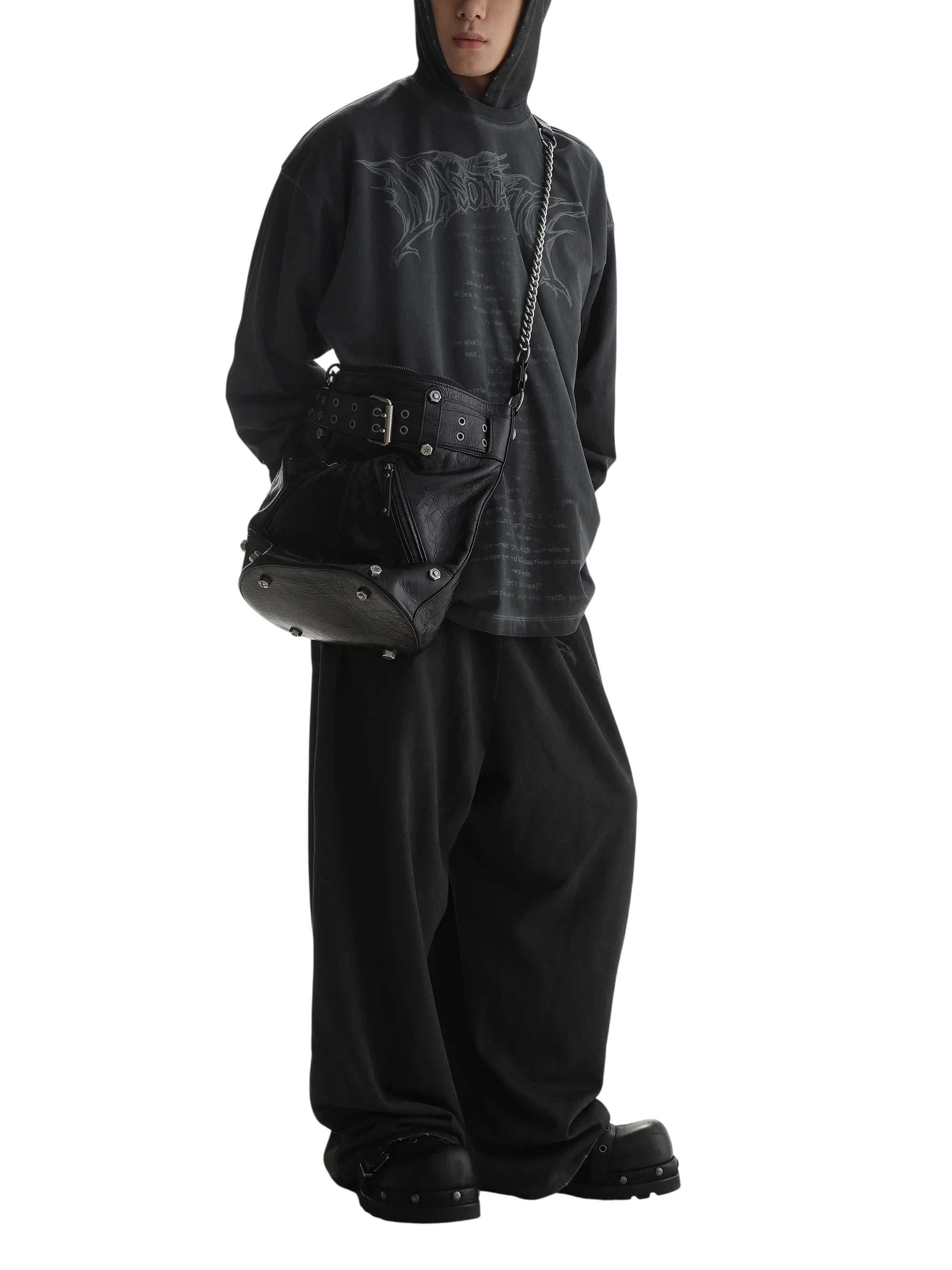 As styled on the male model, it pairs effortlessly with oversized hoodies and wide-leg pants, making it a standout accessory for modern urban looks.