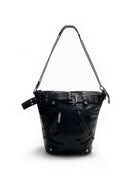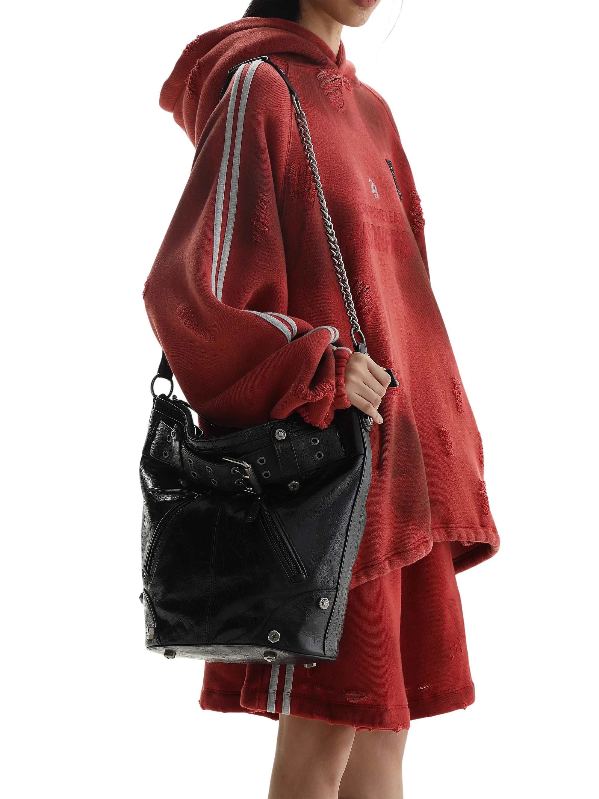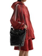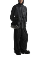 Make a bold statement with this premium motorcycle-style crossbody bag, designed for those who embrace edgy, streetwear fashion. Crafted from black leather with metallic accents and an attached belt detail, this large crossbody bag brings an industrial flair to any outfit.