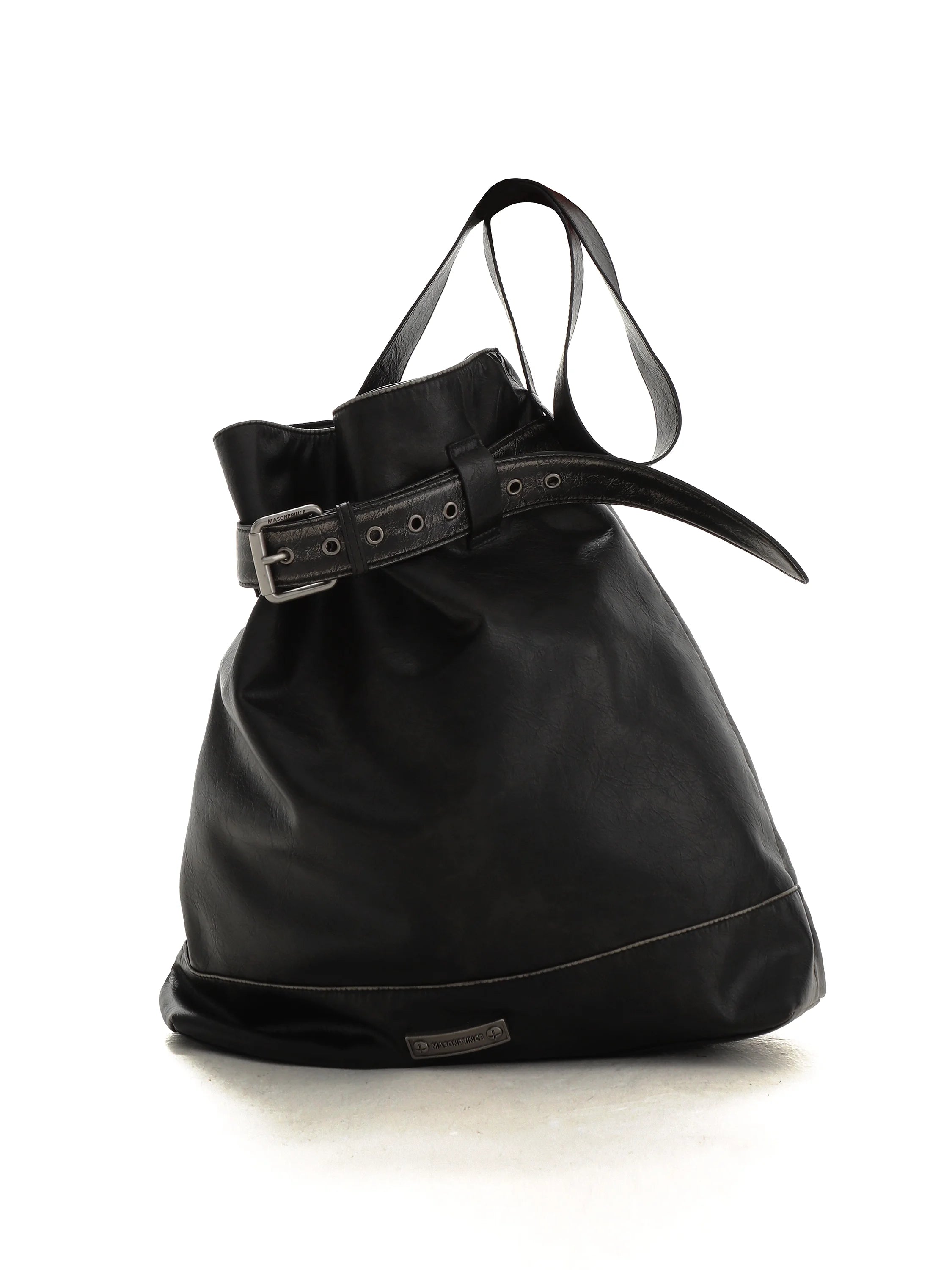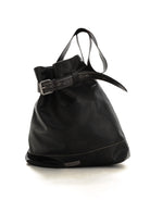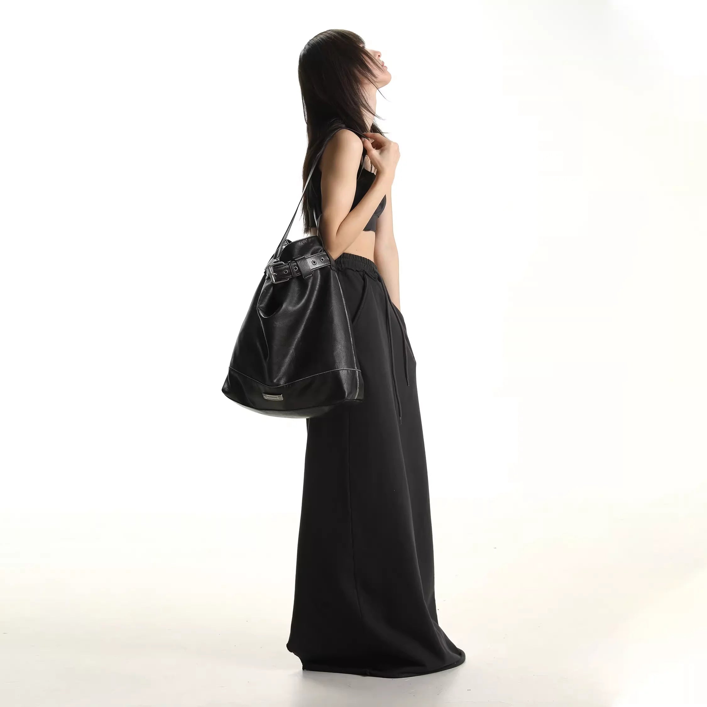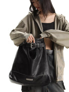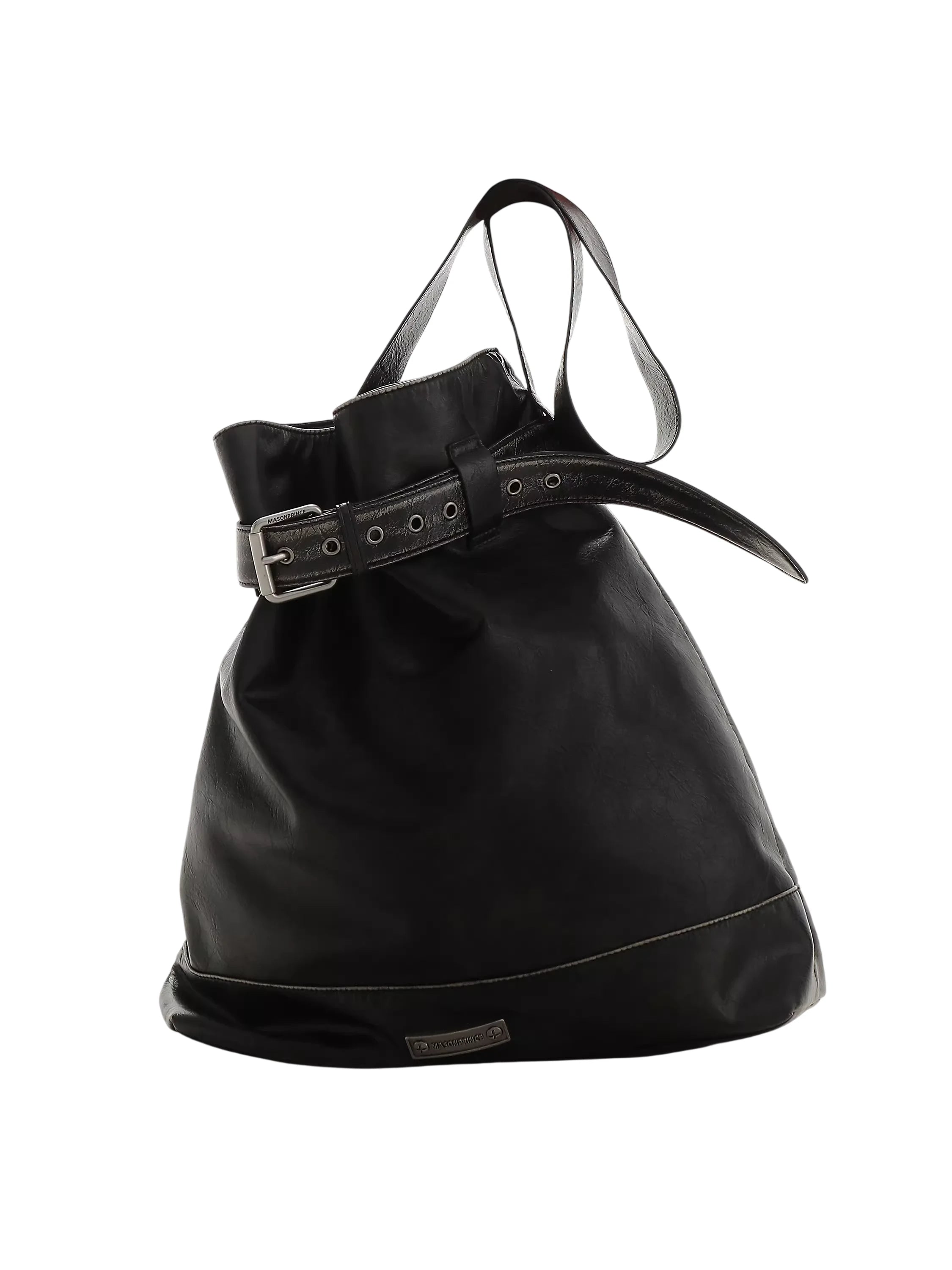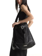 Elevate your everyday look with this vintage-style black leather bucket shoulder bag. Crafted from soft, premium-textured leather, the bag features a standout belt detail and silver hardware for a touch of modern edge. As seen on a female model in an all-black outfit, it perfectly complements casual yet sophisticated ensembles. Ideal for those who appreciate a balance of style and functionality, this spacious bag is designed to carry your essentials in effortless fashion.