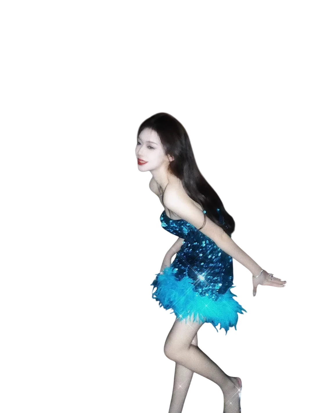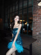 Make a statement in this stunning strapless mini dress, designed to dazzle at any evening event or party. Featuring a curve-hugging silhouette embellished with shimmering sequins and finished with a bold black ostrich feather trim at the hemline, this dress exudes glamour and sophistication. Ideal for women looking to stand out with an elegant yet edgy look.