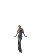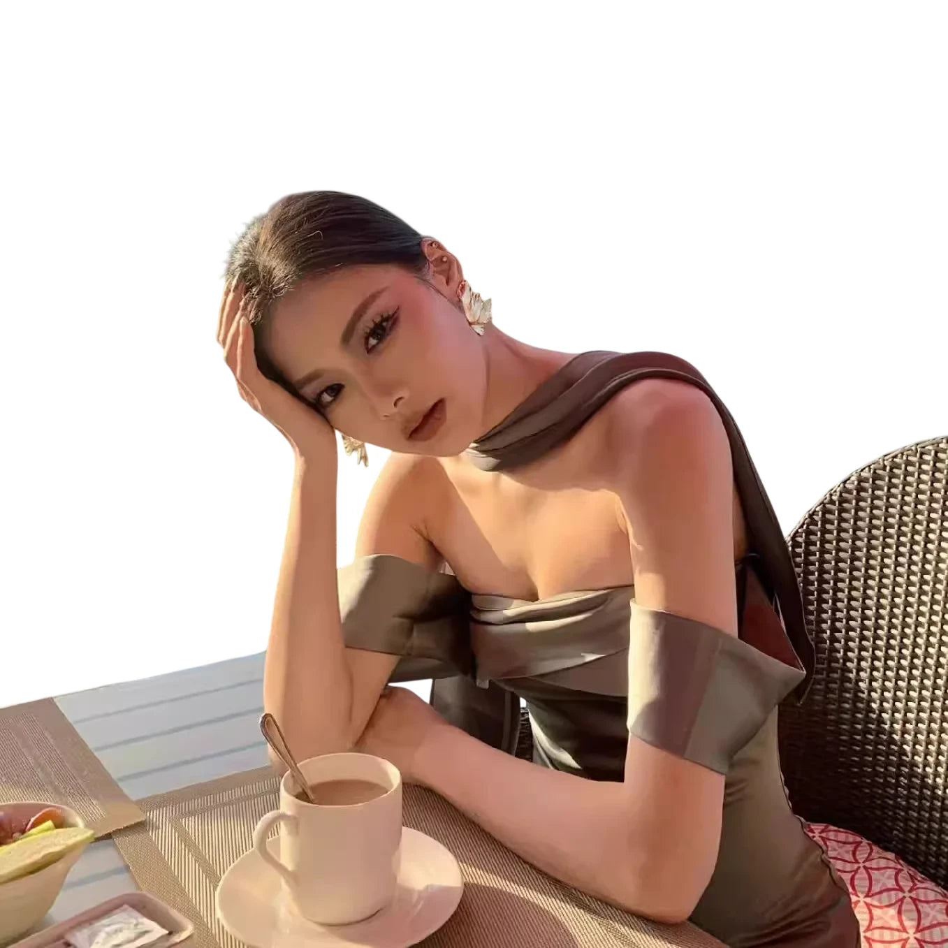 Elevate your evening look with this elegant off-shoulder dress crafted from luxurious acetate satin. Designed with a tailored fit and sleek silhouette, this women's dress features a graceful draped neckline and an integrated neck ribbon that adds a romantic touch. Ideal for birthdays, banquets, or other formal occasions, its metallic grey hue enhances the sophisticated charm. Whether you're attending a celebration or a scenic dinner, this dress offers timeless style with modern flair.