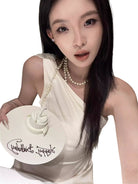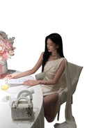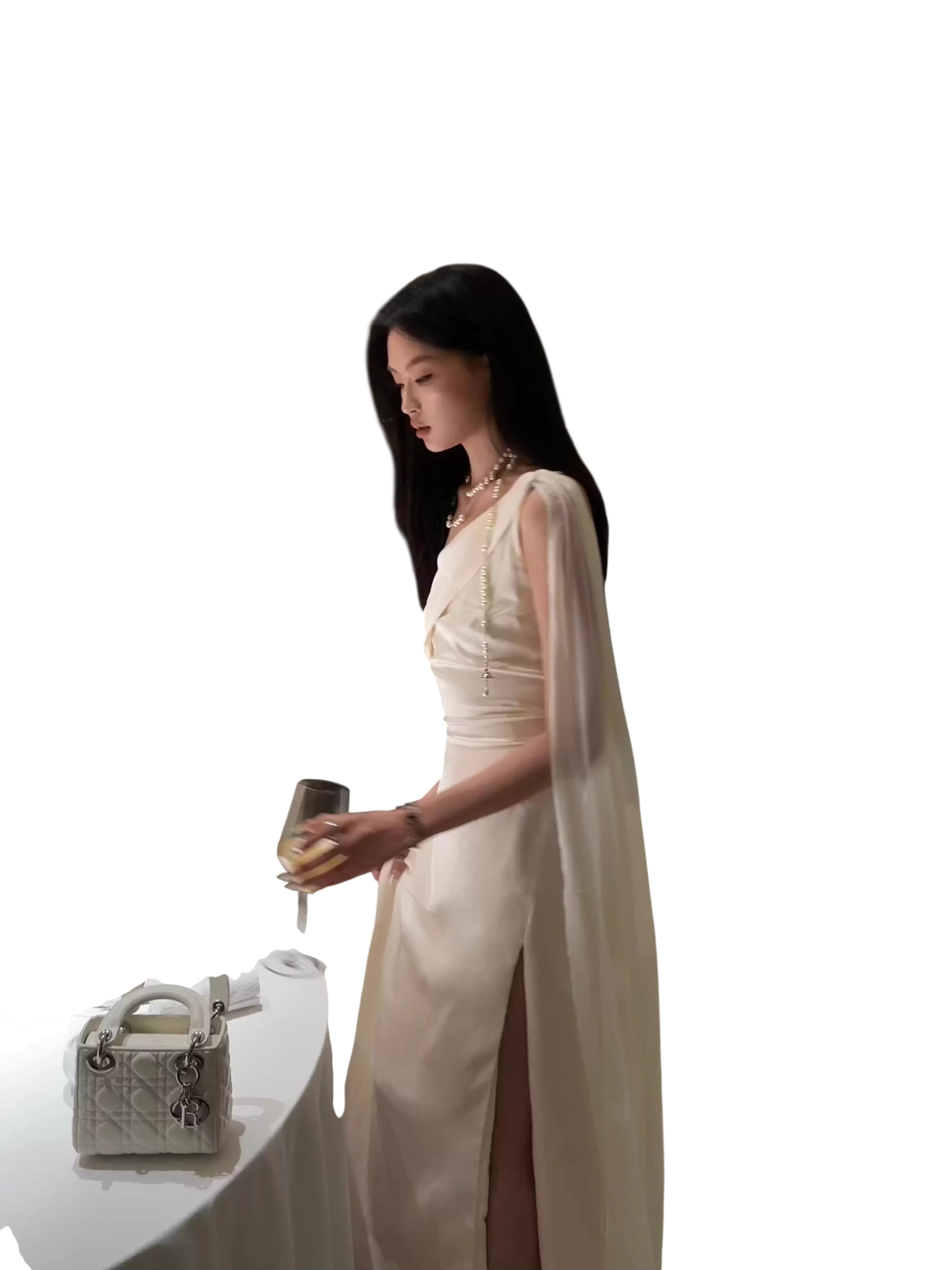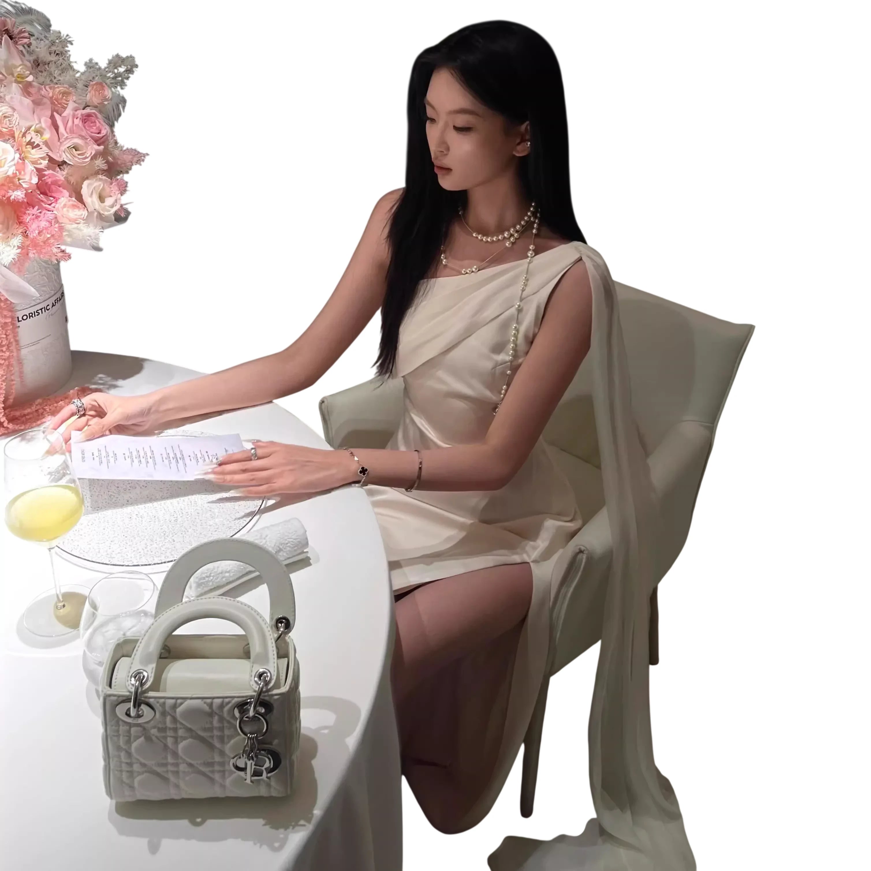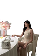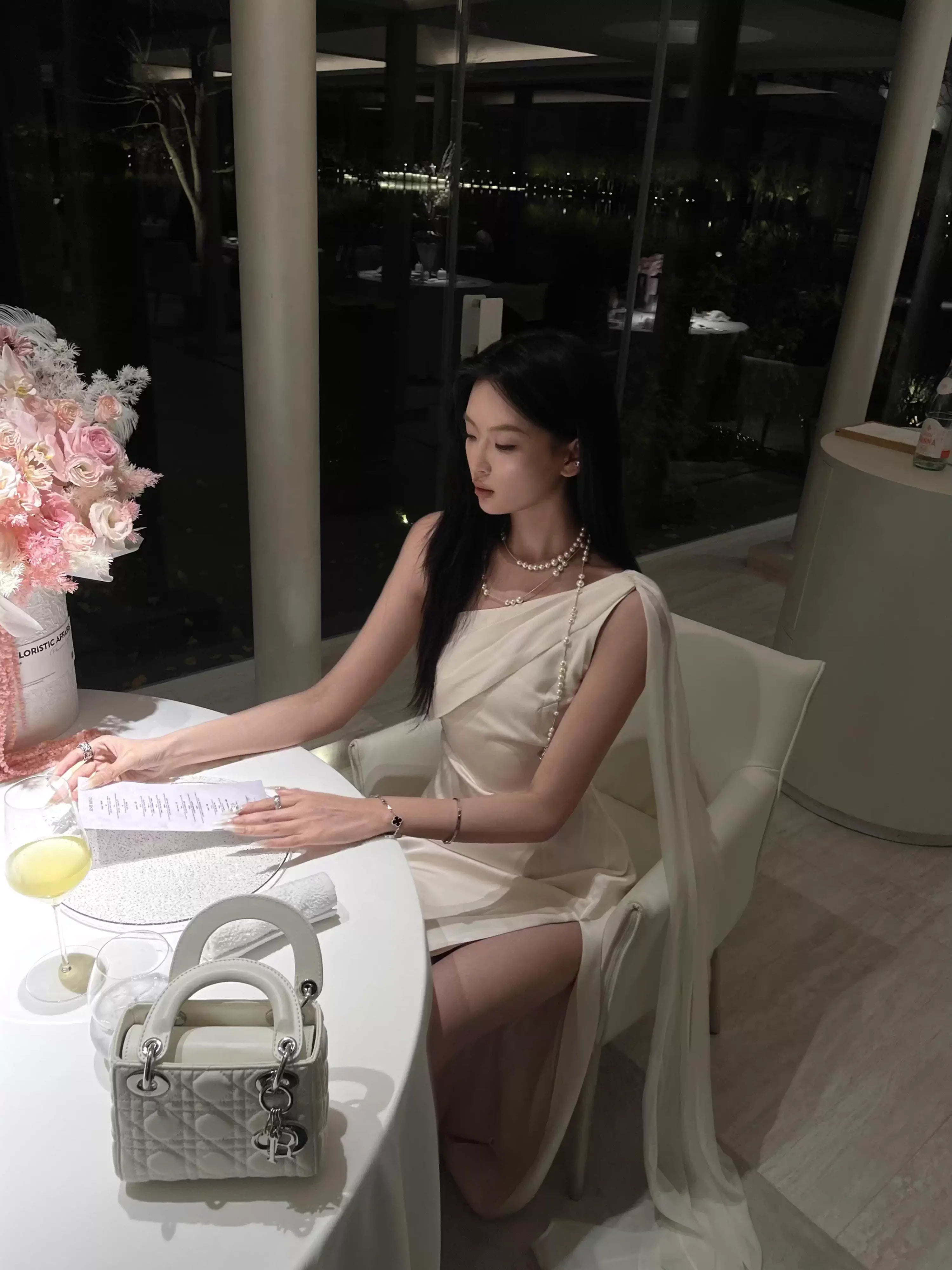 Elegantly designed for special occasions, this women's one-shoulder satin dress features an asymmetric silhouette with a chic slit. The cream-colored form-fitting design flows gracefully with a sheer overlay draping from the shoulder to the floor, adding movement and drama to the ensemble. Ideal for birthdays, evening parties, and formal events, it pairs beautifully with pearl accessories and a stylish handbag for a refined, romantic look.