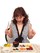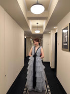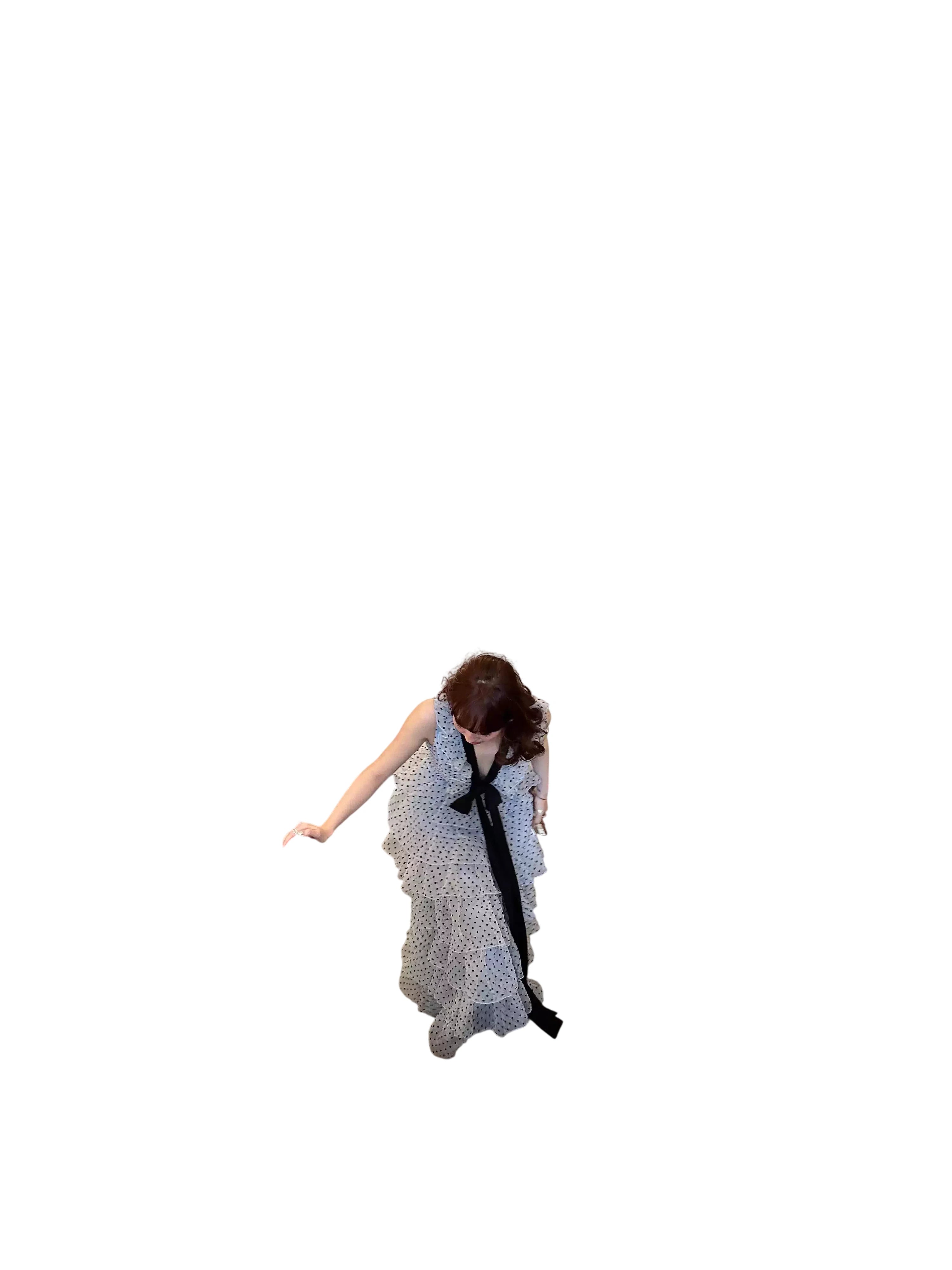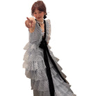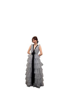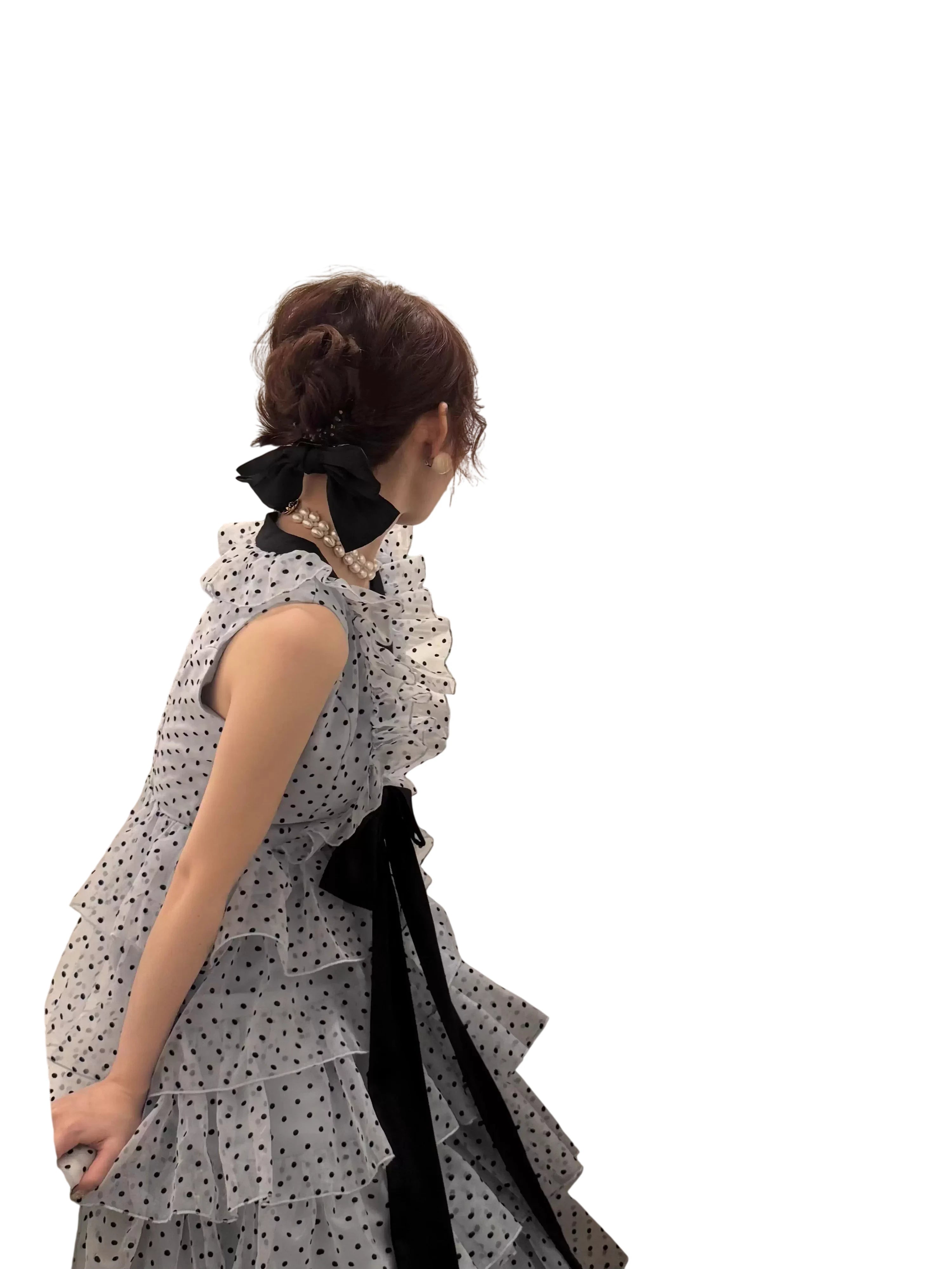 This elegant women's dress features layers of sheer fabric adorned with delicate black polka dots, creating a voluminous and vintage-inspired silhouette. The sleeveless design includes a plunging neckline and a statement black ribbon bow cascading down the front for a touch of sophistication. Perfect for special occasions such as birthdays, this dress is both playful and refined.