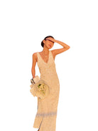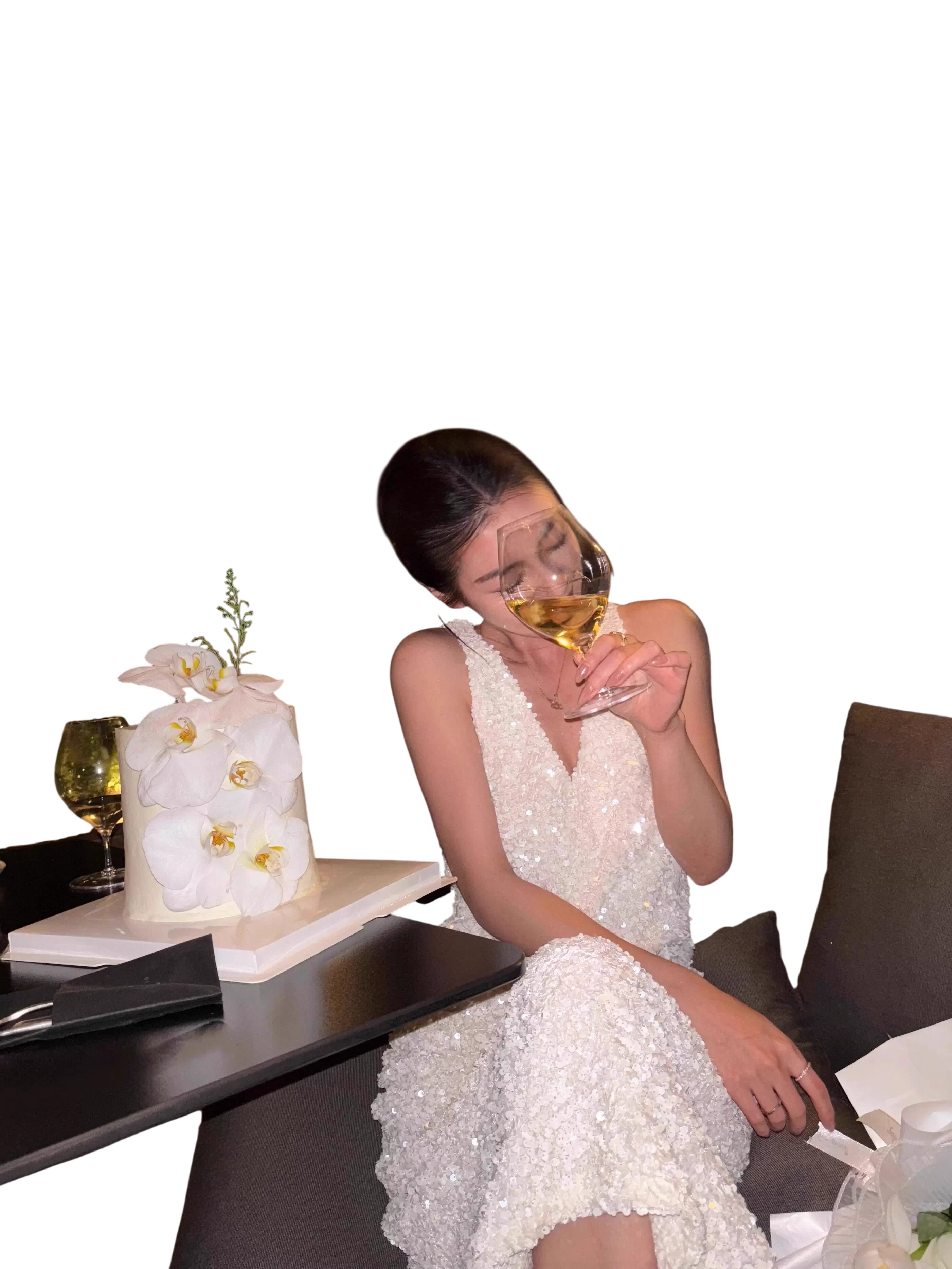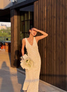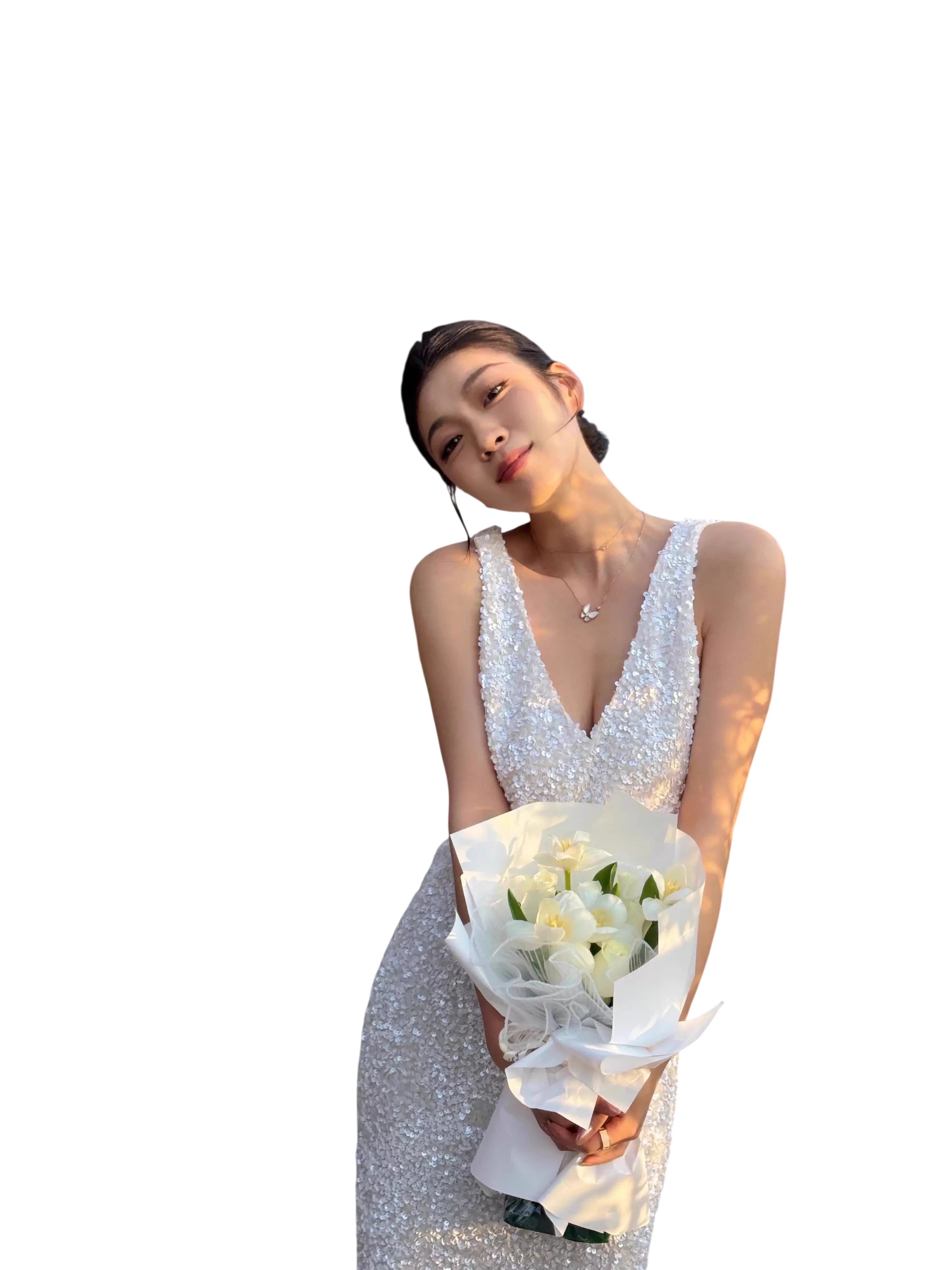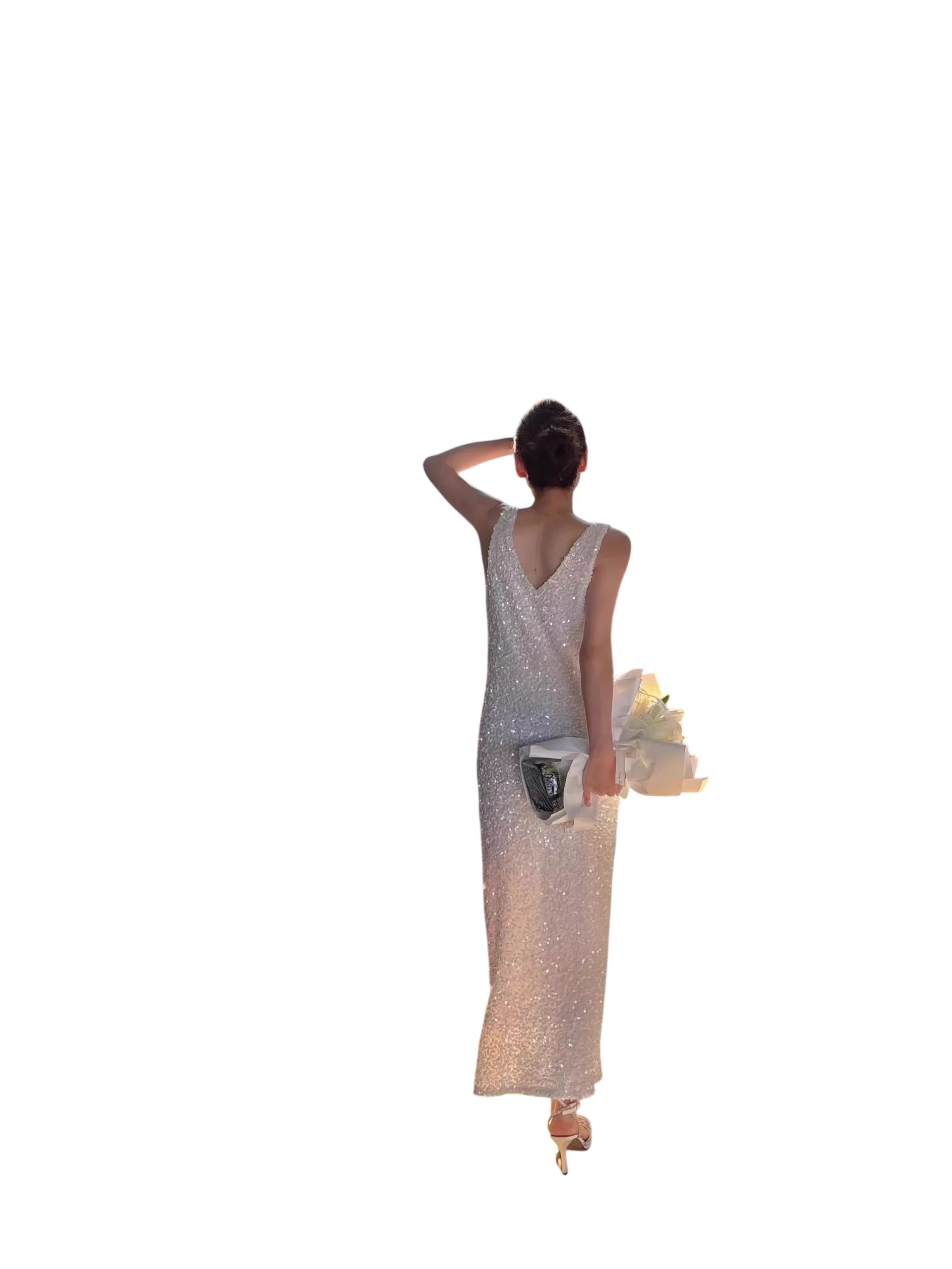 This women's velvet camisole dress is designed with a flattering V-neckline and sleeveless cut that showcases elegance and style. Embellished with high-density sequins throughout, the dress features a textured petal-like finish that catches the light beautifully. The off-white hue adds a refined, timeless look, perfect for birthdays, evening events, or elegant photoshoots. Falling below the knee, this gown offers a graceful silhouette ideal for upscale gatherings.