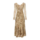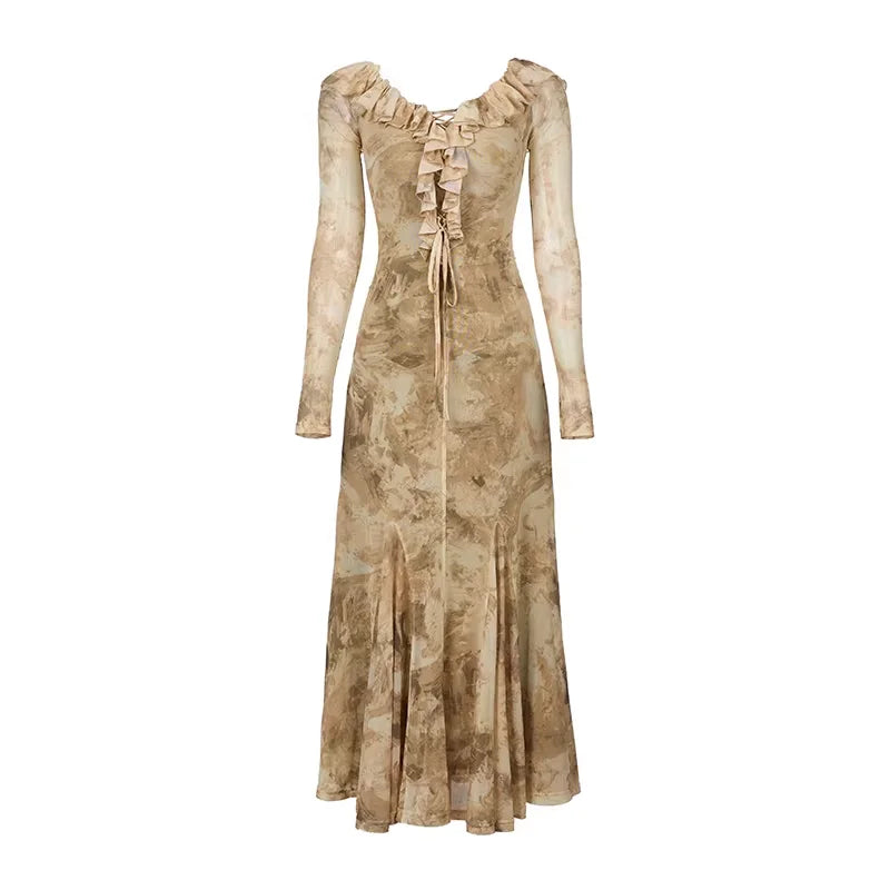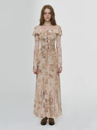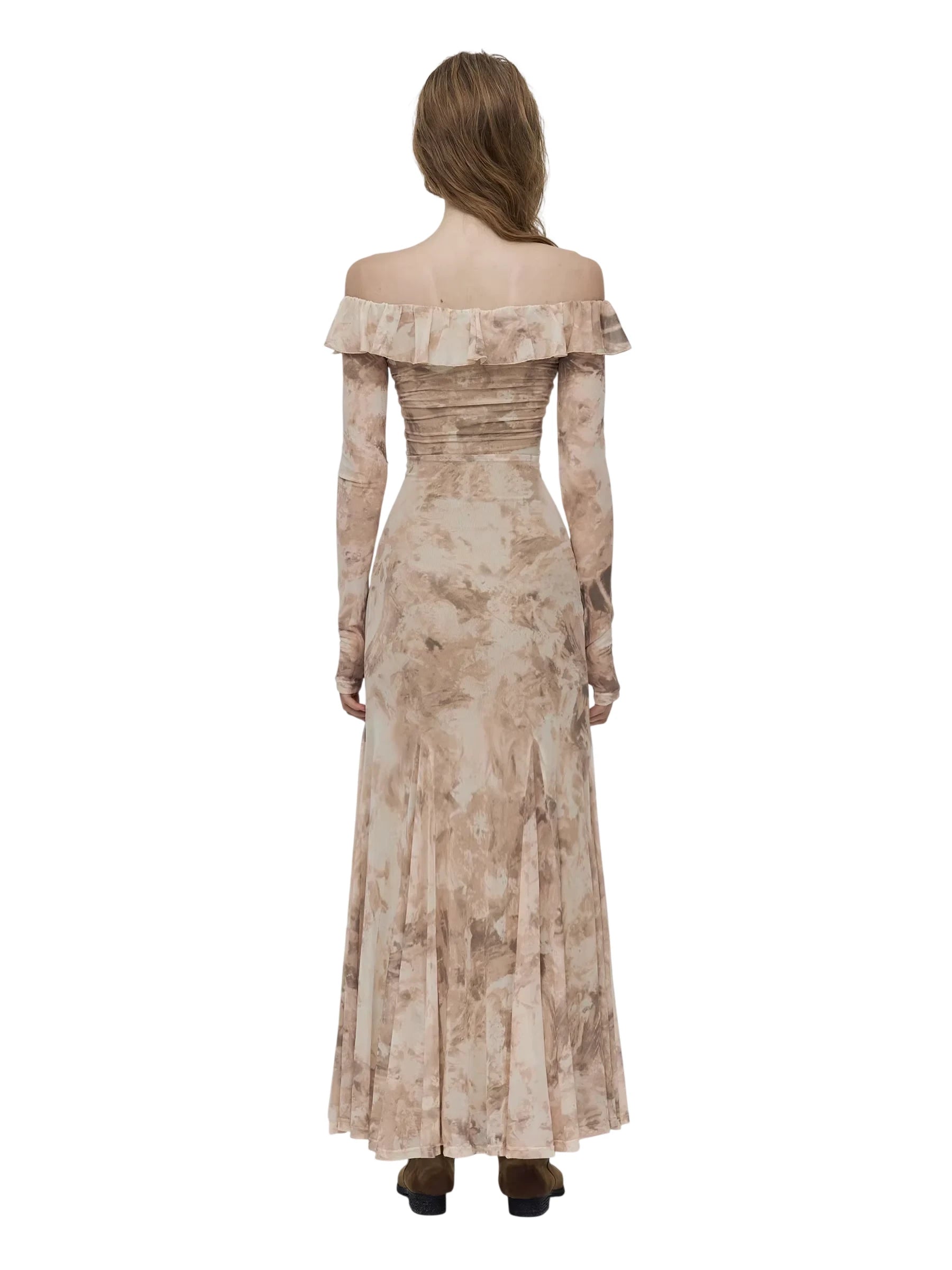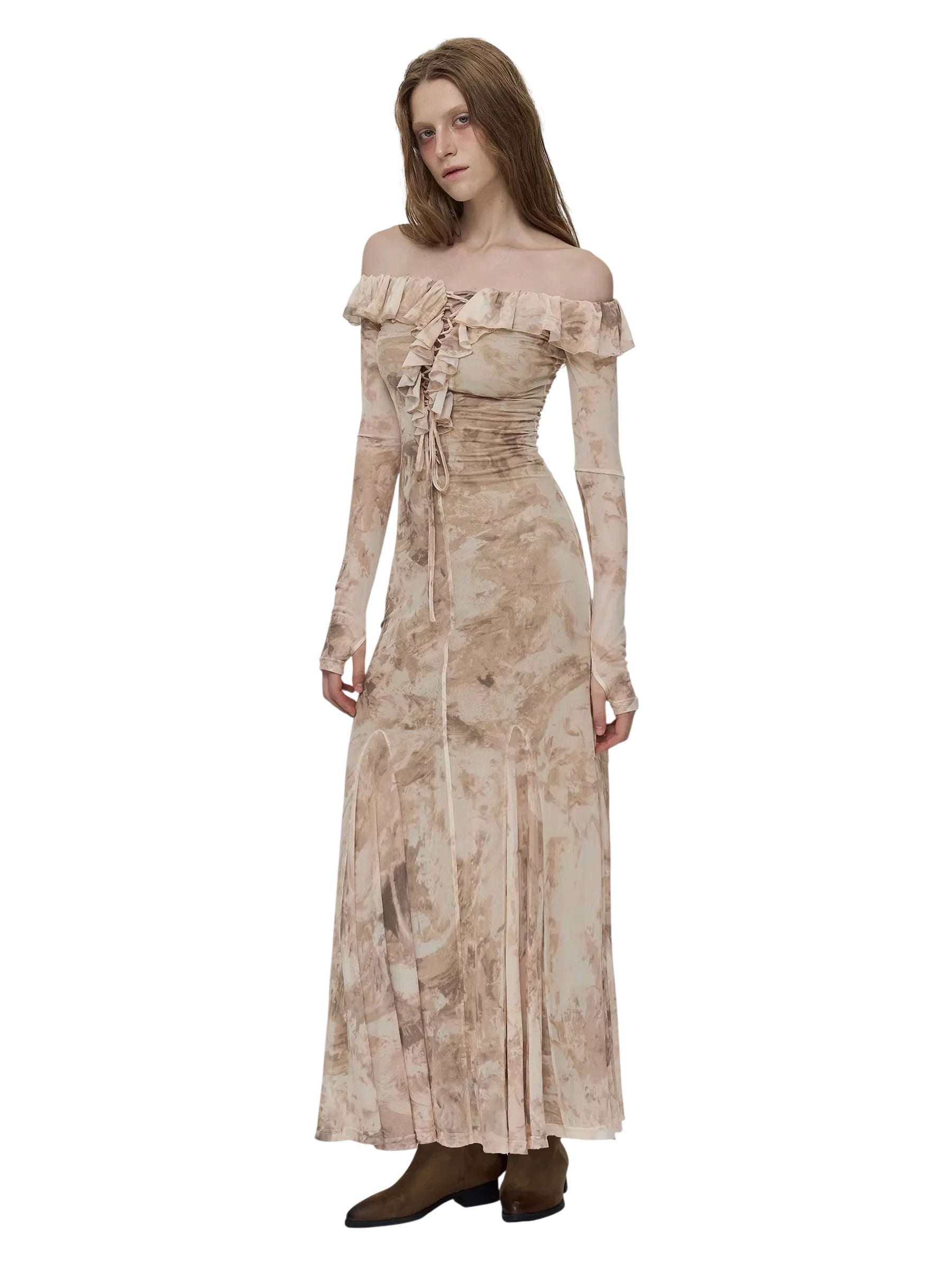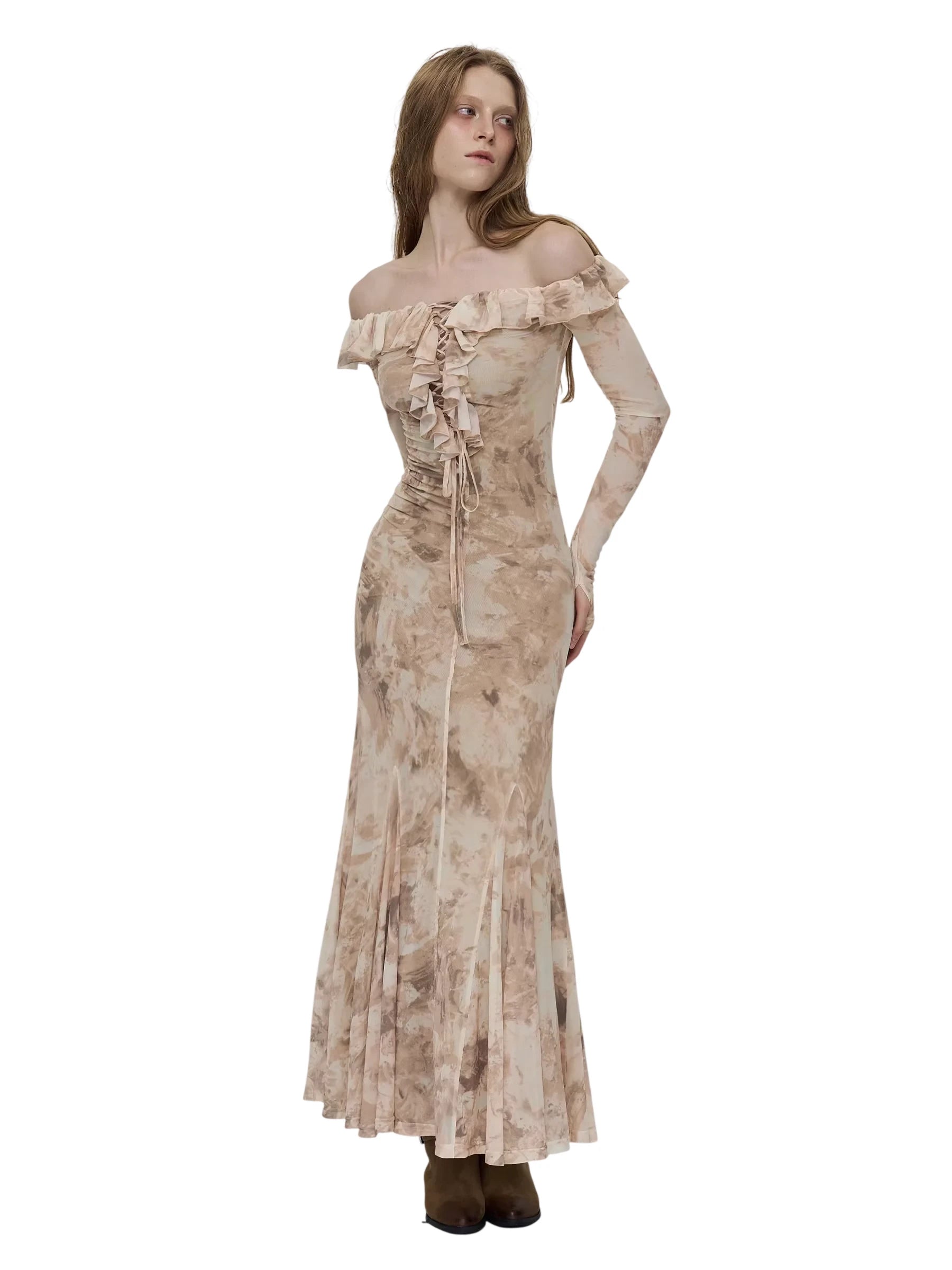 Elevate your evening style with this vintage-inspired off-shoulder mermaid dress. Designed in a beige and brown marbled print, this full-length dress features long sleeves, a structured ruched bodice, and romantic ruffle and tie details down the front. The ruffled neckline adds a touch of femininity, creating a flattering silhouette perfect for formal gatherings or special occasions. Tailored for a slim fit, this dress exudes elegance and timeless charm for women.