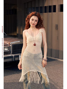 Elevate your bohemian style with this hand-crocheted sleeveless dress, featuring intricate 3D floral detailing and a hollow-out knit design. Crafted in a soft cream hue, this semi-transparent dress flows elegantly from below the bust to the knees, finishing with playful tassel fringes at the hem. A floral embellishment on one shoulder strap adds a unique, artistic touch. Perfect for casual outdoor settings, this women's dress pairs beautifully with layered accessories for a carefree, stylish look.