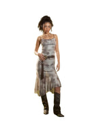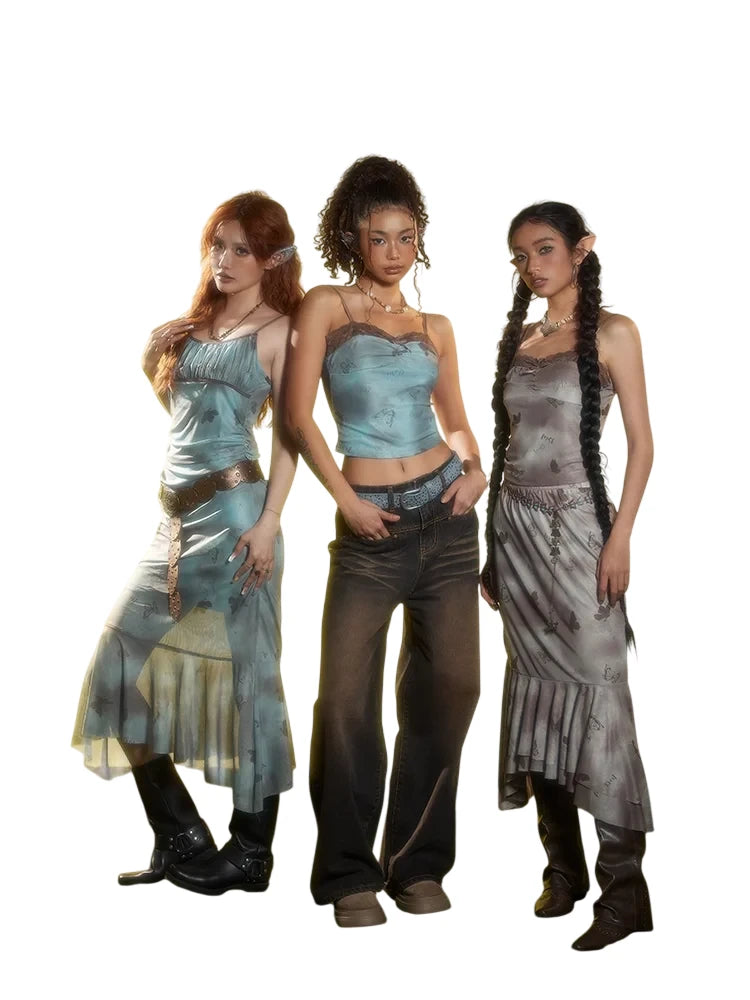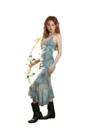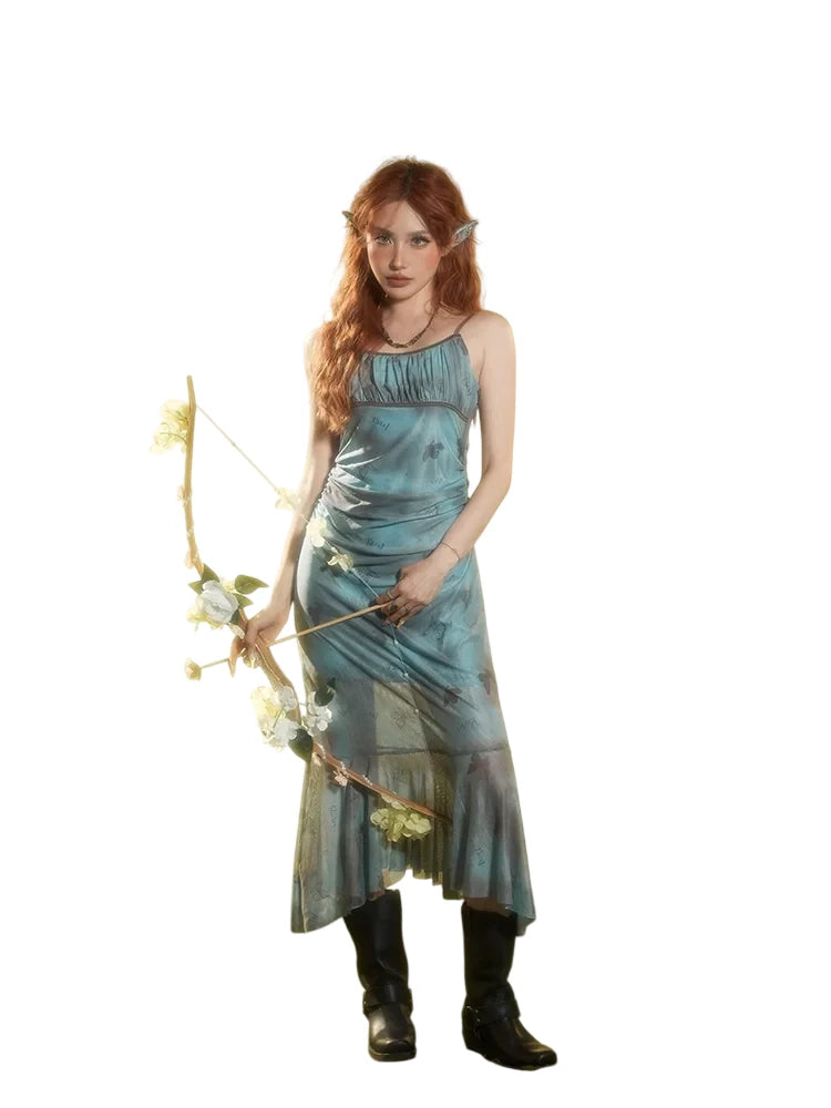 This women's sleeveless midi dress features a stylish ruched design with a subtle gray tie-dye pattern. It is crafted from breathable mesh fabric and adorned with delicate butterfly prints on both sides. The dress is designed with thin spaghetti straps and an asymmetrical hemline, adding an edgy and modern touch. Perfect for a variety of occasions, this form-fitting dress flatters the figure while providing a contemporary boho-chic aesthetic.