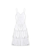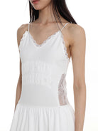 This women's long white dress features delicate lace mesh detailing and thin spaghetti straps, offering a light and romantic design. The fitted bodice flows into a tiered, multi-layered skirt, creating a soft, airy silhouette perfect for casual or semi-formal occasions. The subtle lace accents along the neckline and tiers enhance the dress's feminine charm.