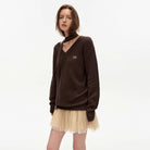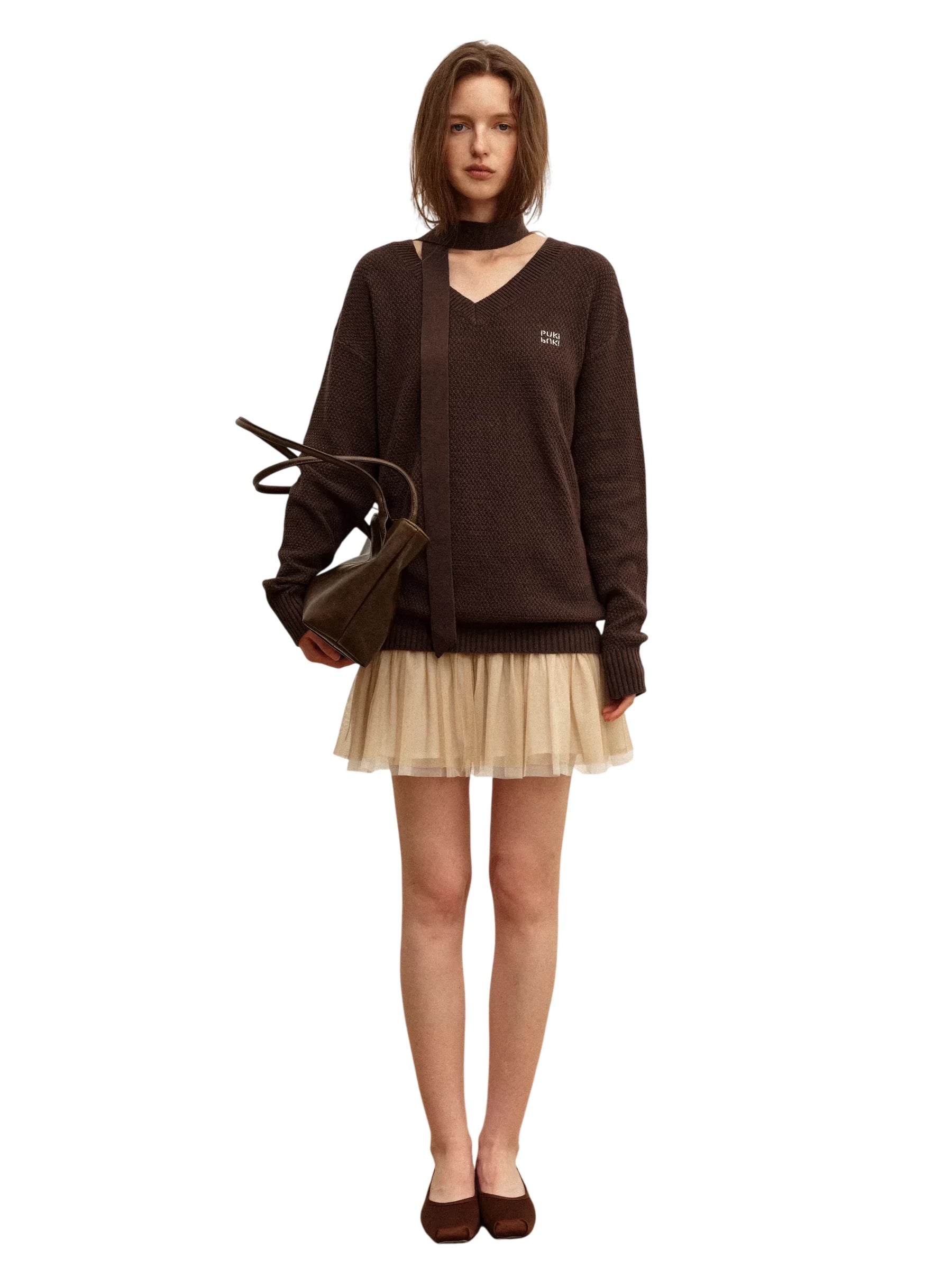 This stylish two-piece outfit features a classic V-neck knit sweater in dark brown with a textured finish and an oversized, loose fit for a casual, cozy look. The sweater includes a matching long fabric tie detail and subtle text embellishment on the chest. Paired with a cream-colored pleated tulle mini skirt, the ensemble provides a layered, feminine aesthetic. Designed for women, this set is ideal for understated elegance and versatile styling.