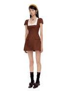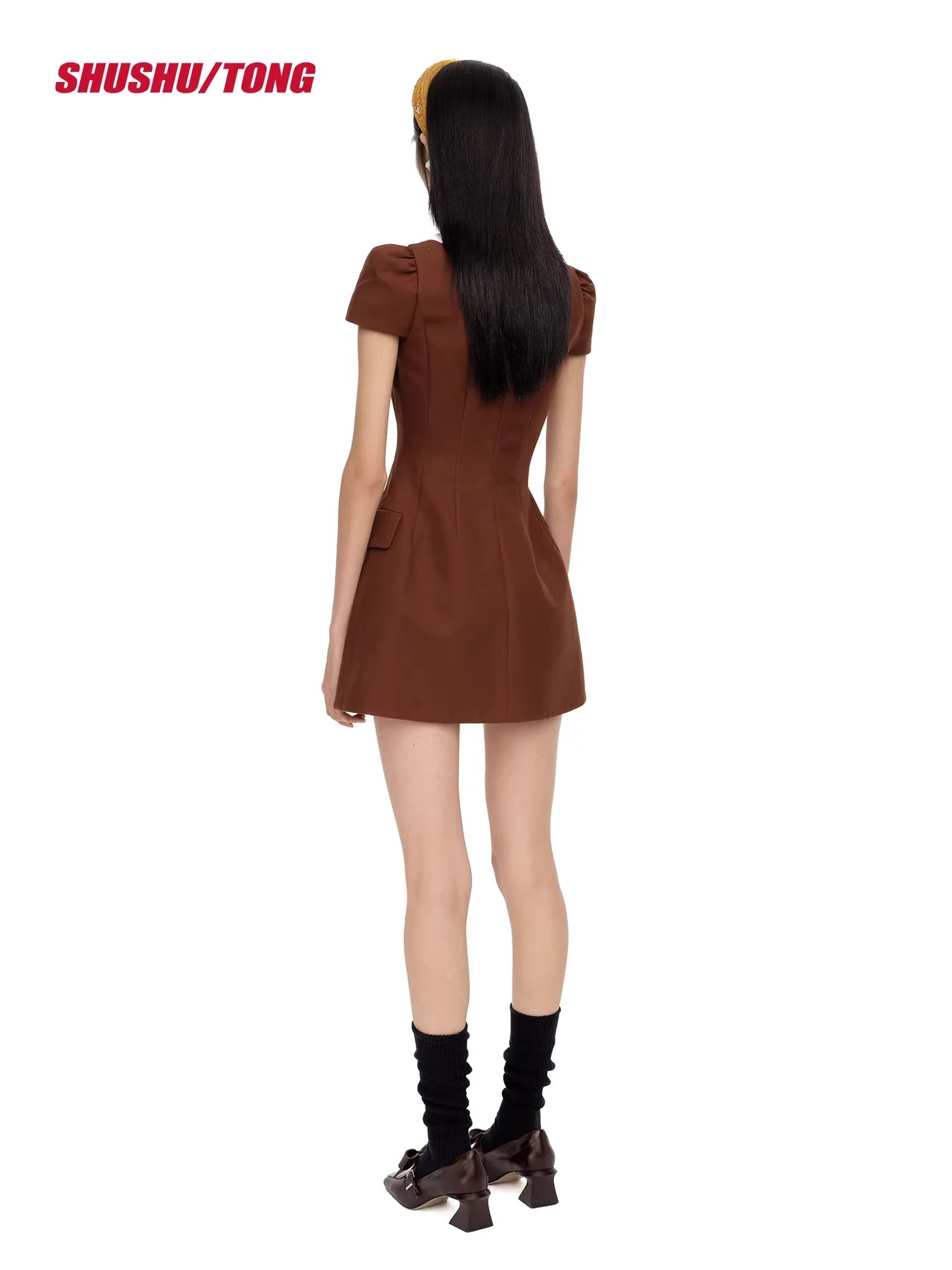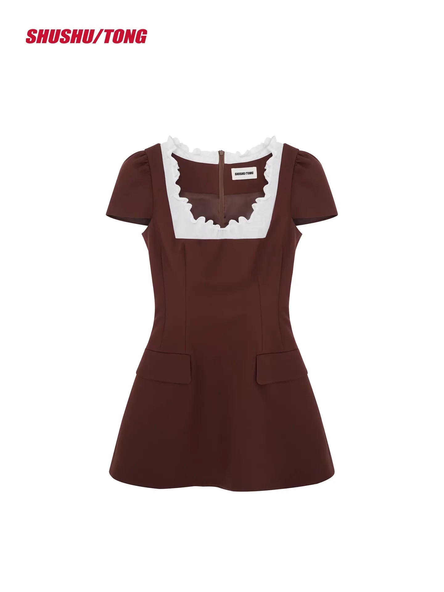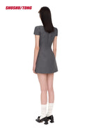 Embrace contemporary elegance with this 2025 winter women's mini dress, crafted with a structured A-line silhouette. The dress features charming short puff sleeves and a refined square neckline framed by a delicate white frilly inner detail, adding a feminine contrast to the dark gray tone. Designed with front flap-style pockets for a hint of utility, this piece blends whimsical and classic elements effortlessly. Ideal for seasonal outings, it pairs beautifully with statement footwear and accessories.