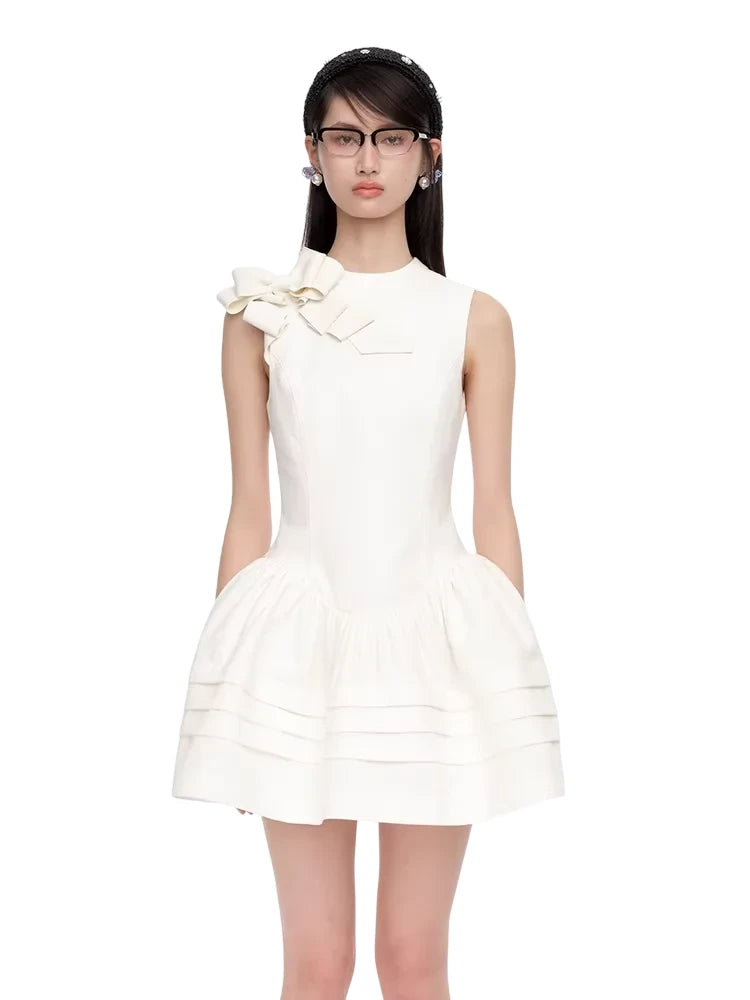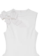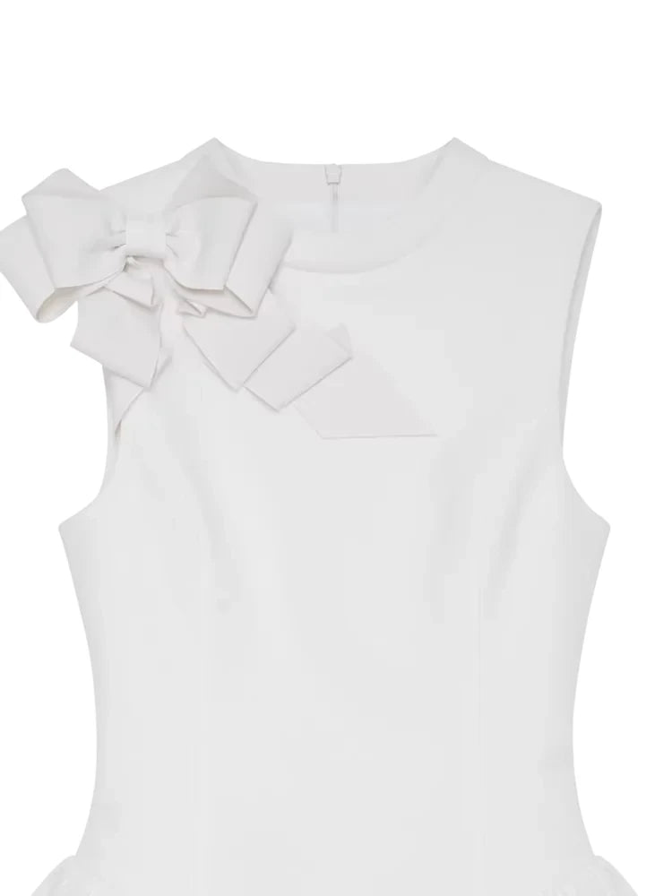 This sophisticated women's mini dress offers a refined winter style featuring a sleeveless design and a flattering fitted bodice. The voluminous skirt with delicate pleats creates a chic silhouette, while a statement oversized bow at the shoulder adds a charming, feminine detail. Crafted in a classic ivory-white hue, this elegant piece is ideal for polished seasonal looks.