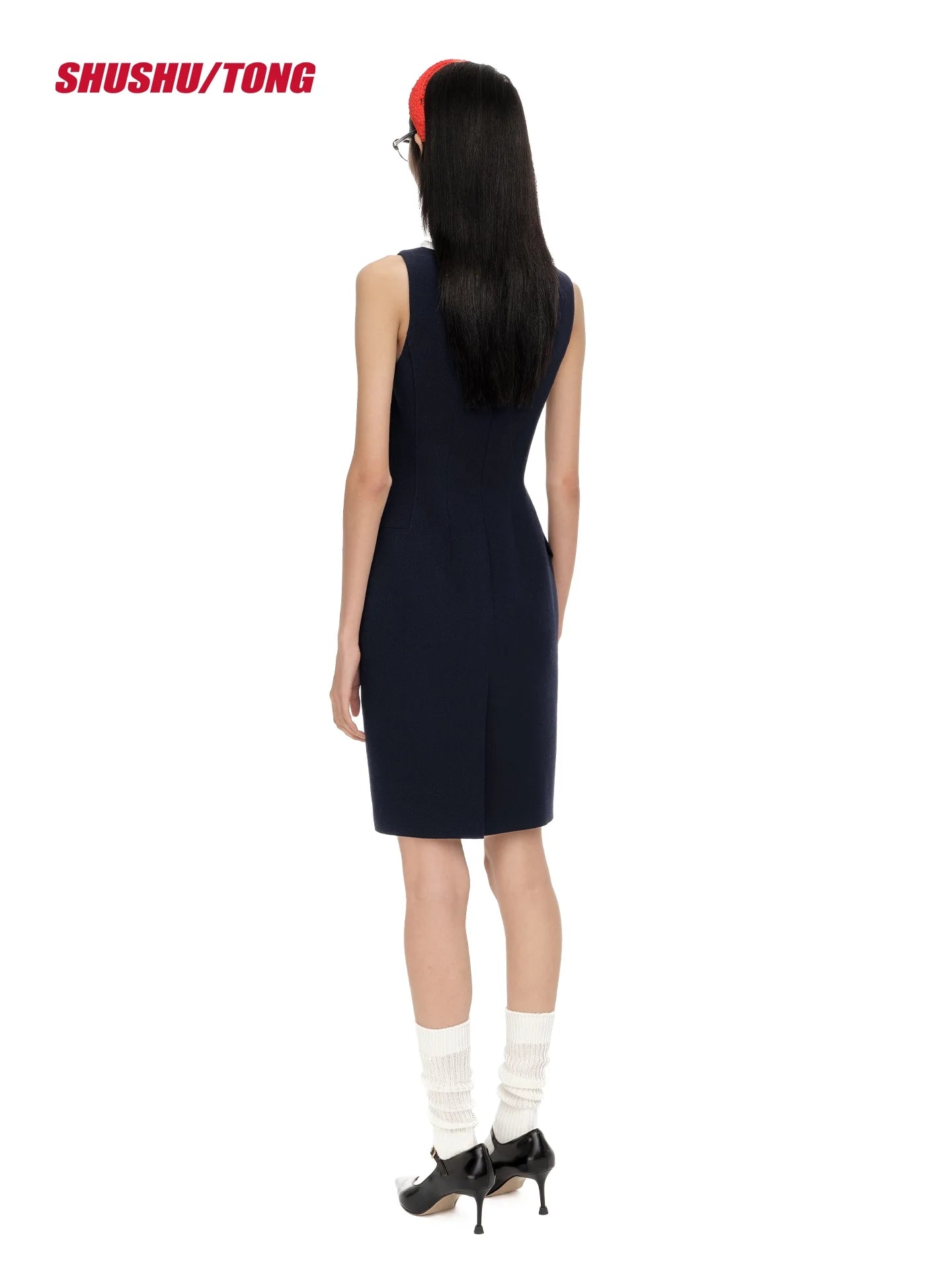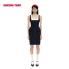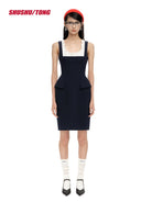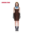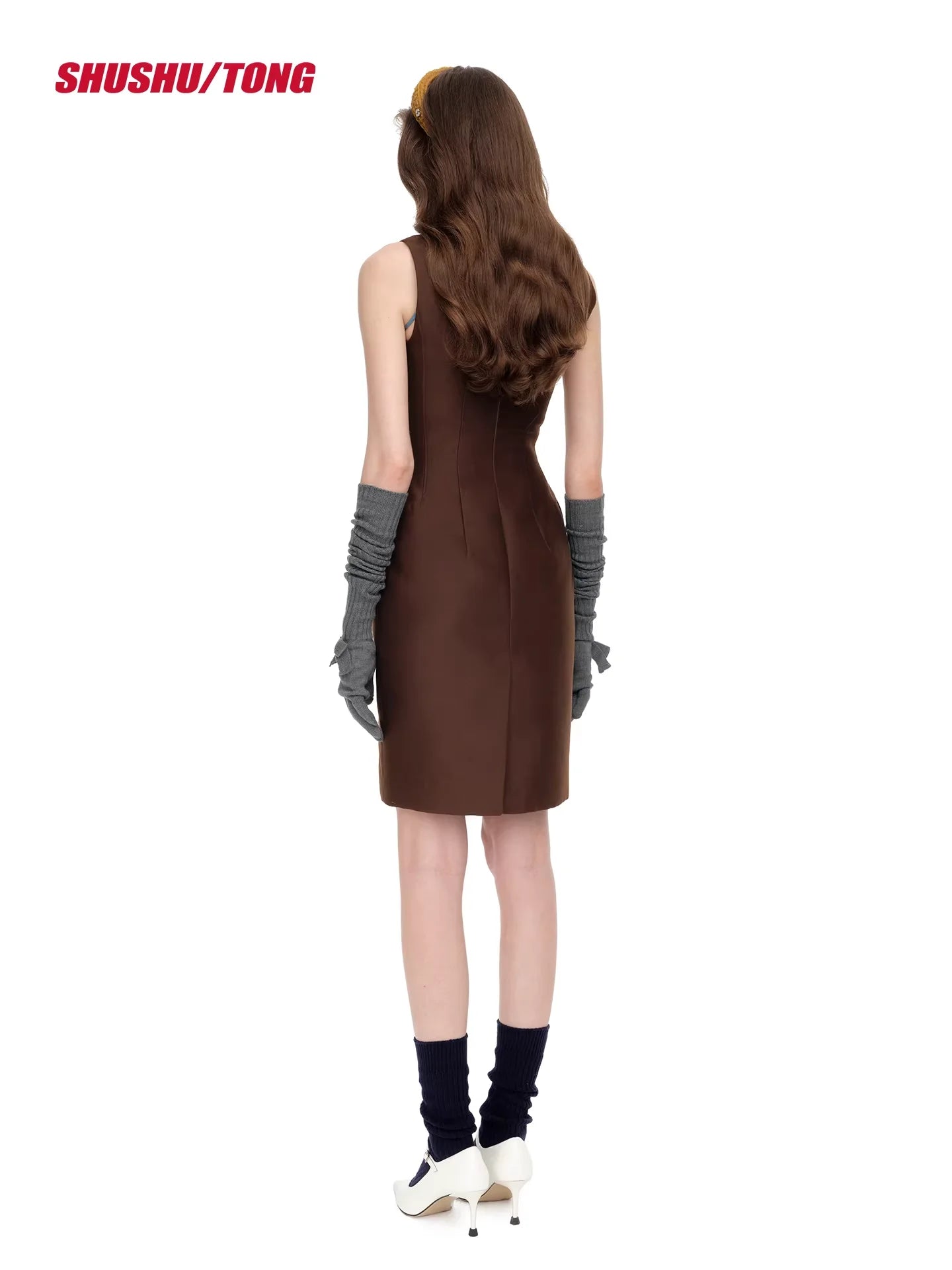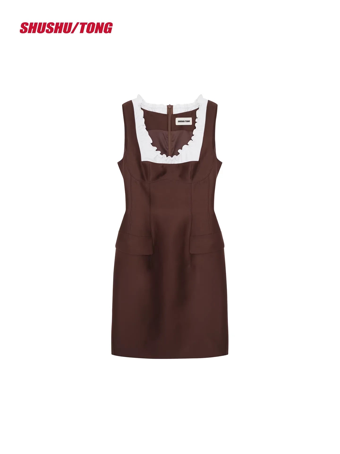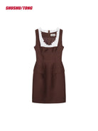 Make a bold seasonal statement with this sophisticated winter dress ensemble for women. The fitted, sleeveless brown dress features a square neckline and two structured front pockets, offering a stylish and functional silhouette. Paired with a blue collared undershirt enhanced by a white ruffled lace inset, the outfit achieves a refined patchwork layered effect. Coordinated accessories include a yellow knit headband, pearl earrings, gray ruched gloves with ribbons, black socks, and white-trimmed black heels. Ideal for adding a touch of elegance and personality to your winter wardrobe.