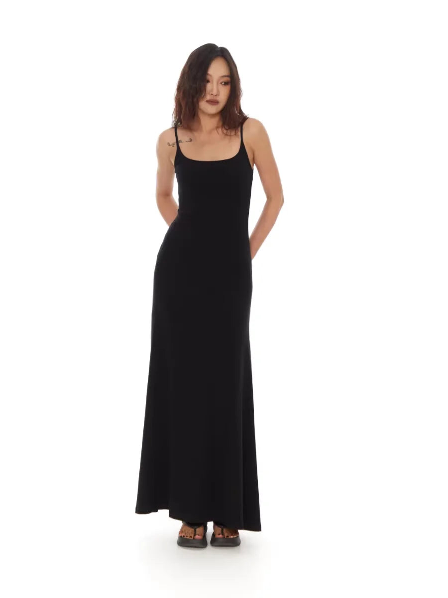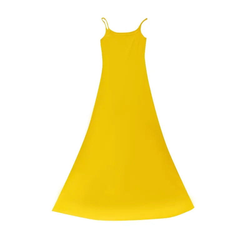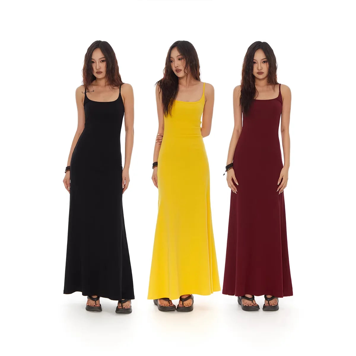 Elevate your summer wardrobe with this elegant and sexy spaghetti strap maxi dress for women. Designed with a slim fit silhouette, this dress features a fitted bodice, flattering scoop neckline, and delicate thin straps for a minimalist yet chic profile. Available in solid black, bright yellow, and deep maroon, the ankle-length design drapes gracefully, making it ideal for vacation wear or casual summer outings.