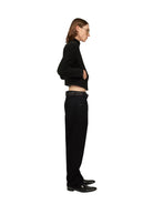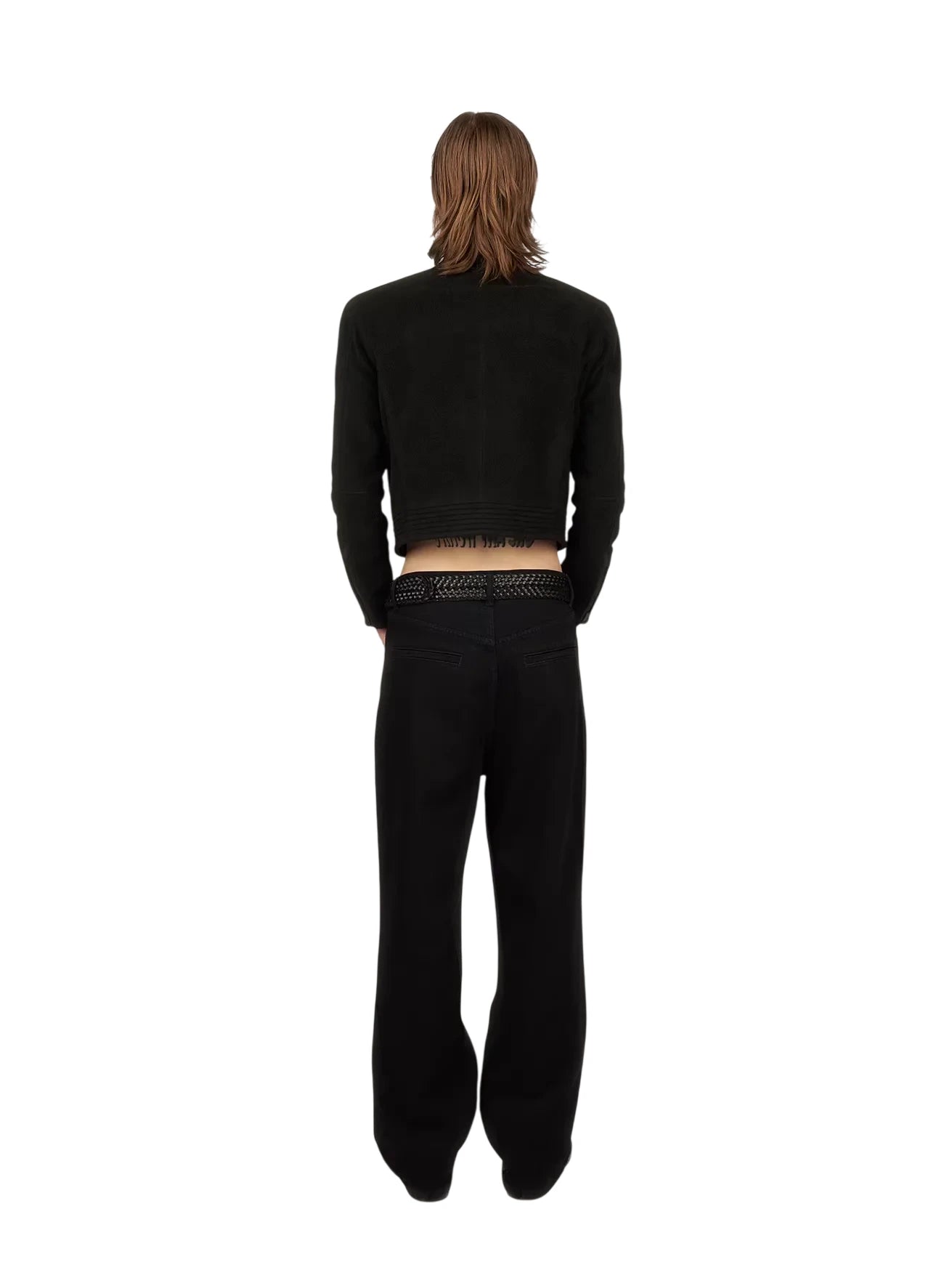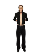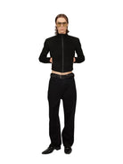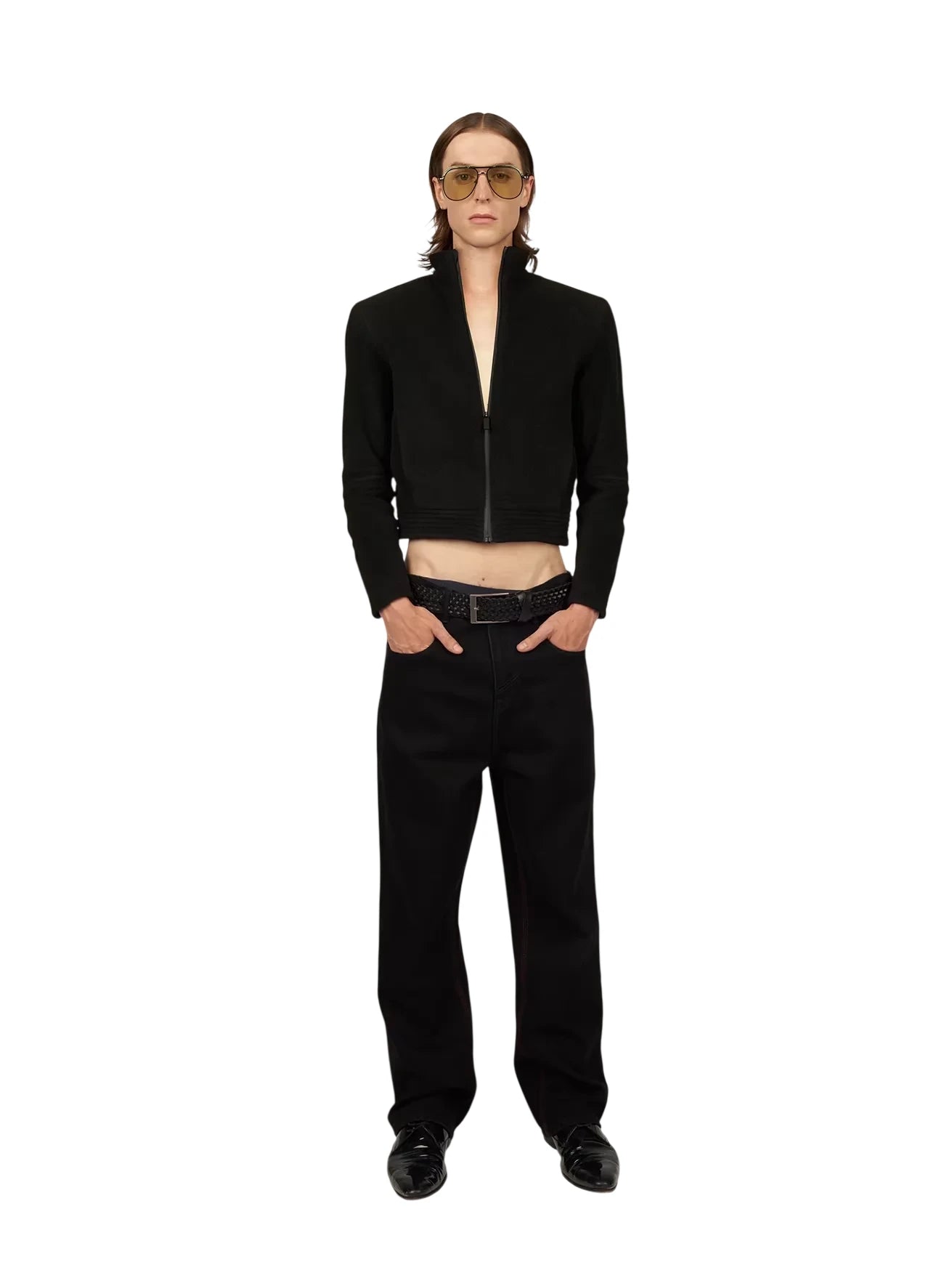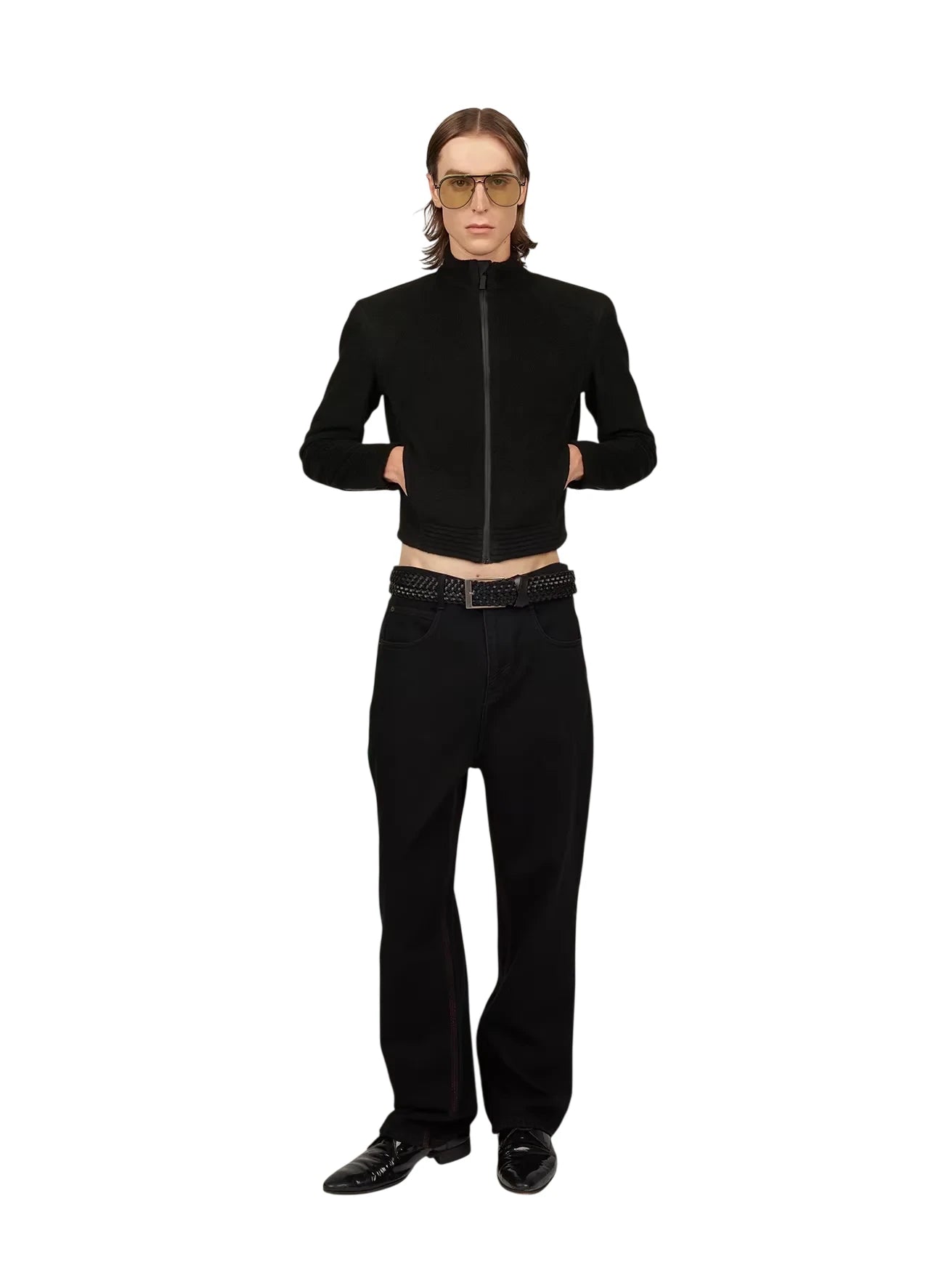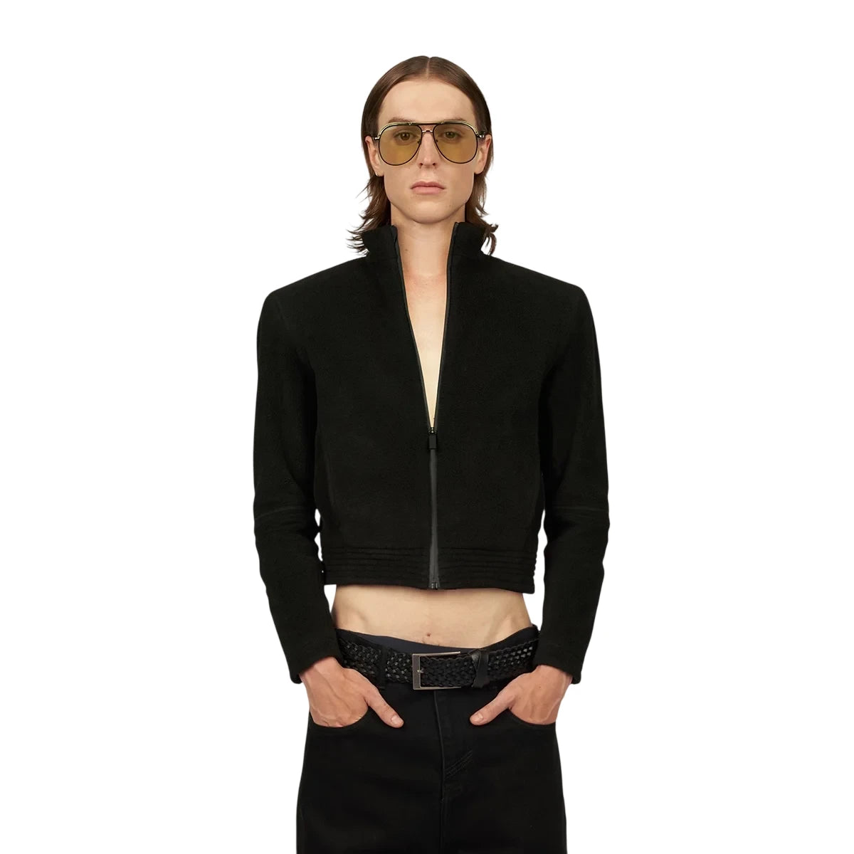 This men's cropped zip-up jacket features a structured, minimalist silhouette crafted from textured fabric. Designed with a high collar and long sleeves, it includes detachable fleece padding for versatile styling. The fashion-forward cut reveals a hint of the midriff, making it a standout piece for contemporary wardrobe rotations.